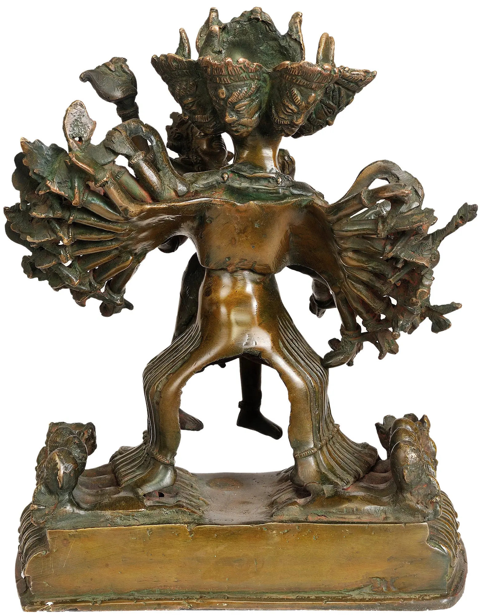 This brass statue is a testament to the skill of traditional artisans. The aged patina and subtle variations in the metal lend a profound sense of antiquity and spiritual depth to the piece. The detailed rendering of each element, from the fierce expression on the faces to the intricate adornments and the dynamic posture, conveys the powerful energy of this enlightened deity. Displaying this statue in your home or meditation space can serve as a constant reminder of the potential for overcoming challenges and cultivating inner peace. It is more than just an object of art; it is a conduit for spiritual energy, inviting a deeper connection with the transformative power of Buddhist teachings. This piece is a masterful representation that will undoubtedly become a cherished centerpiece for practitioners and art enthusiasts alike.
