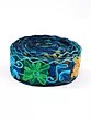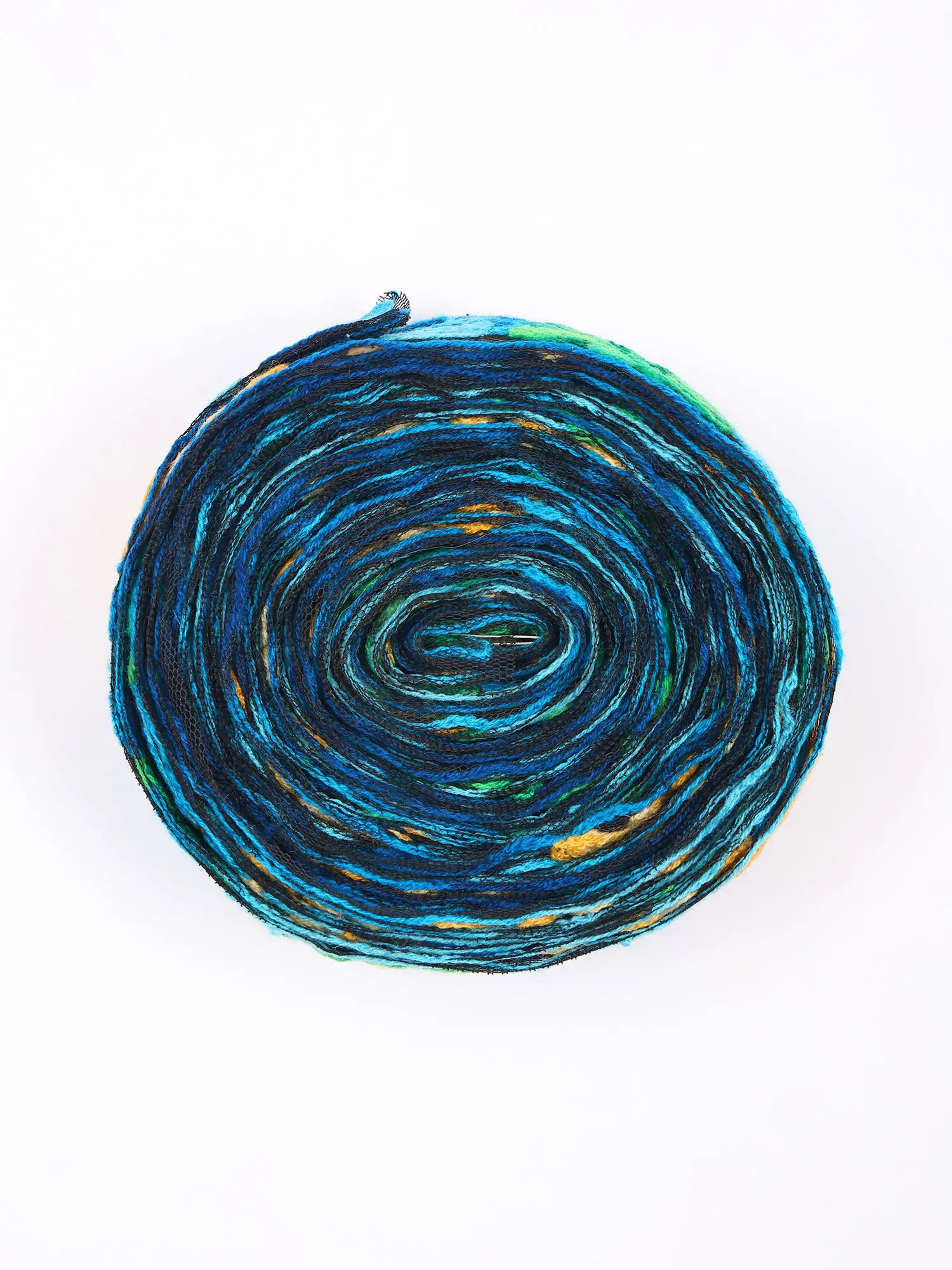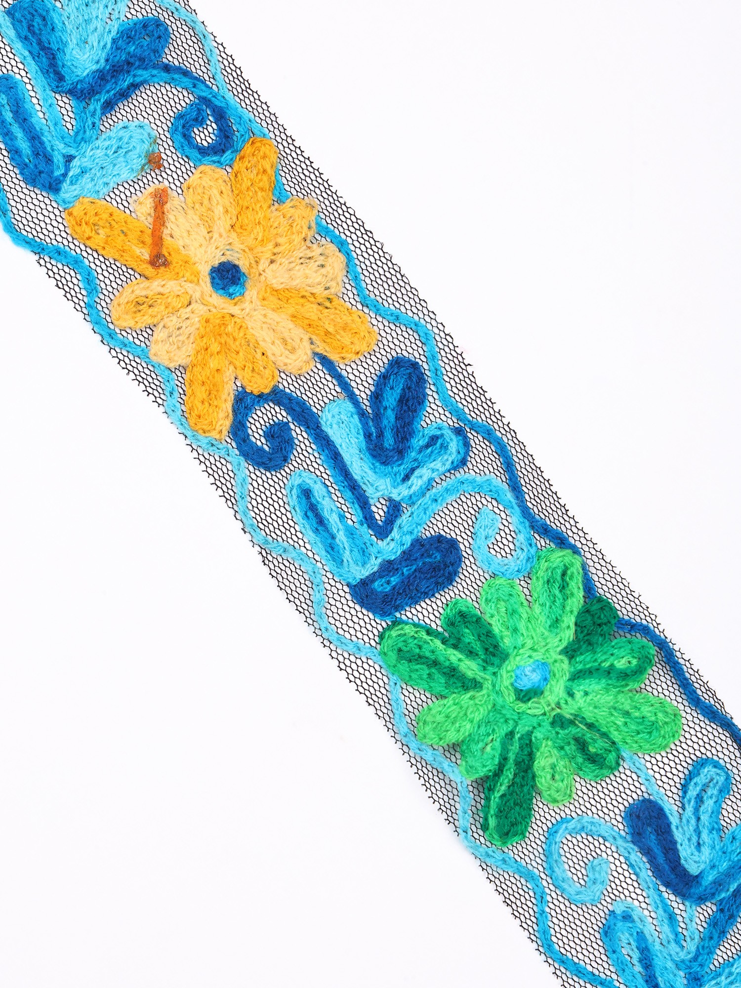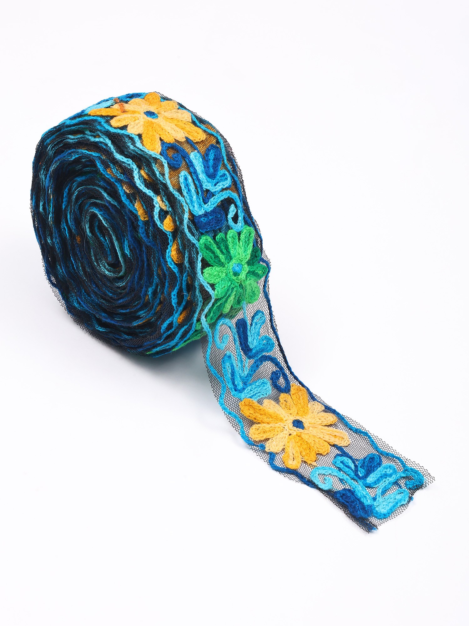 The artistry is showcased in the delightful contrast of colors and textures, with cheerful yellow blooms and vibrant blue and green flourishes dancing across a dark, open-weave net. This visual symphony is held together by a generous two-inch width, offering ample opportunity for creative application. The sheer nature of the net allows for light to pass through, creating an enchanting, almost painted effect.