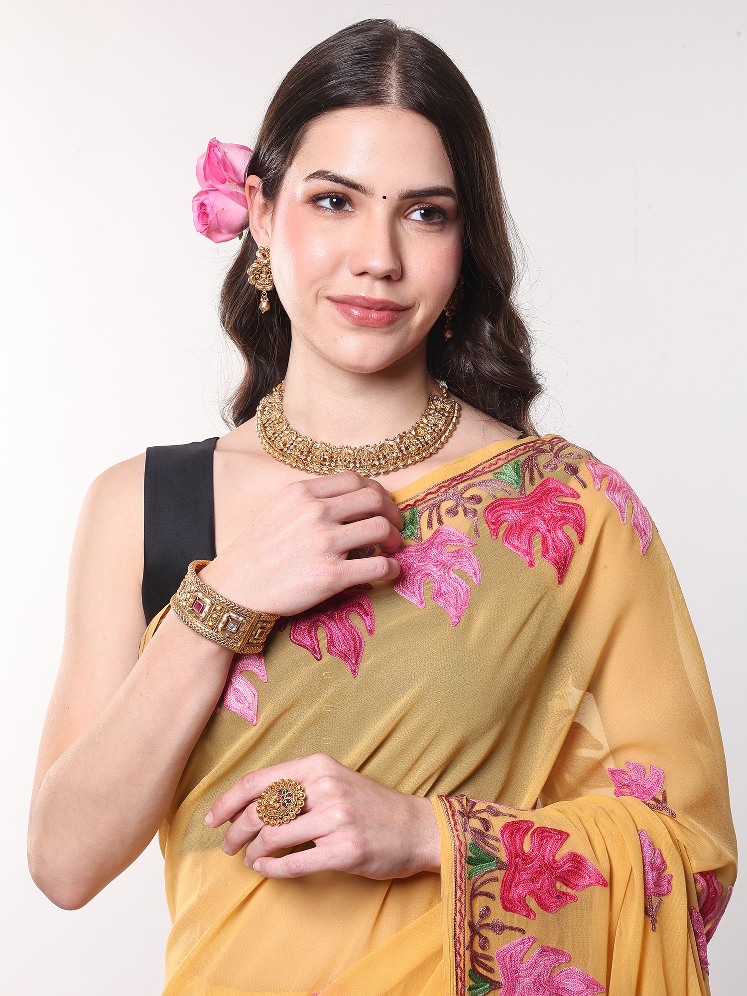 Georgette Kashmiri Saree with Chain Stitch Aari Embroidered Maple Leaf Vines