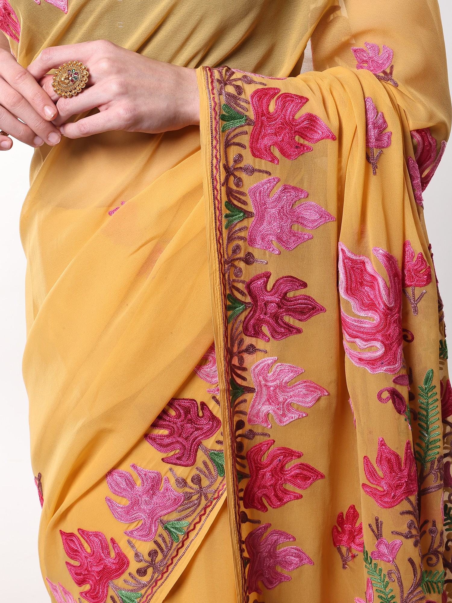 Georgette Kashmiri Saree with Aari Embroidered Multicolor Flowers