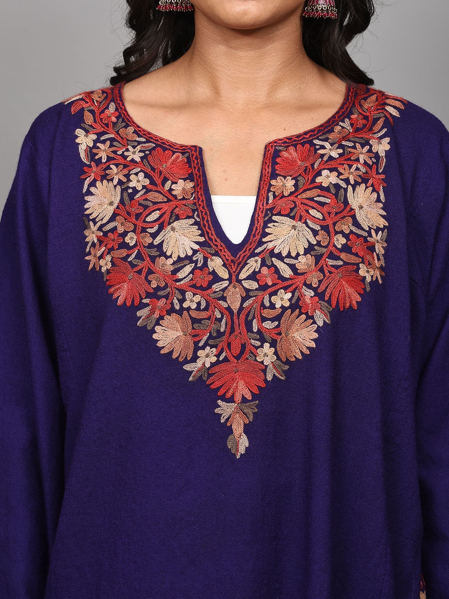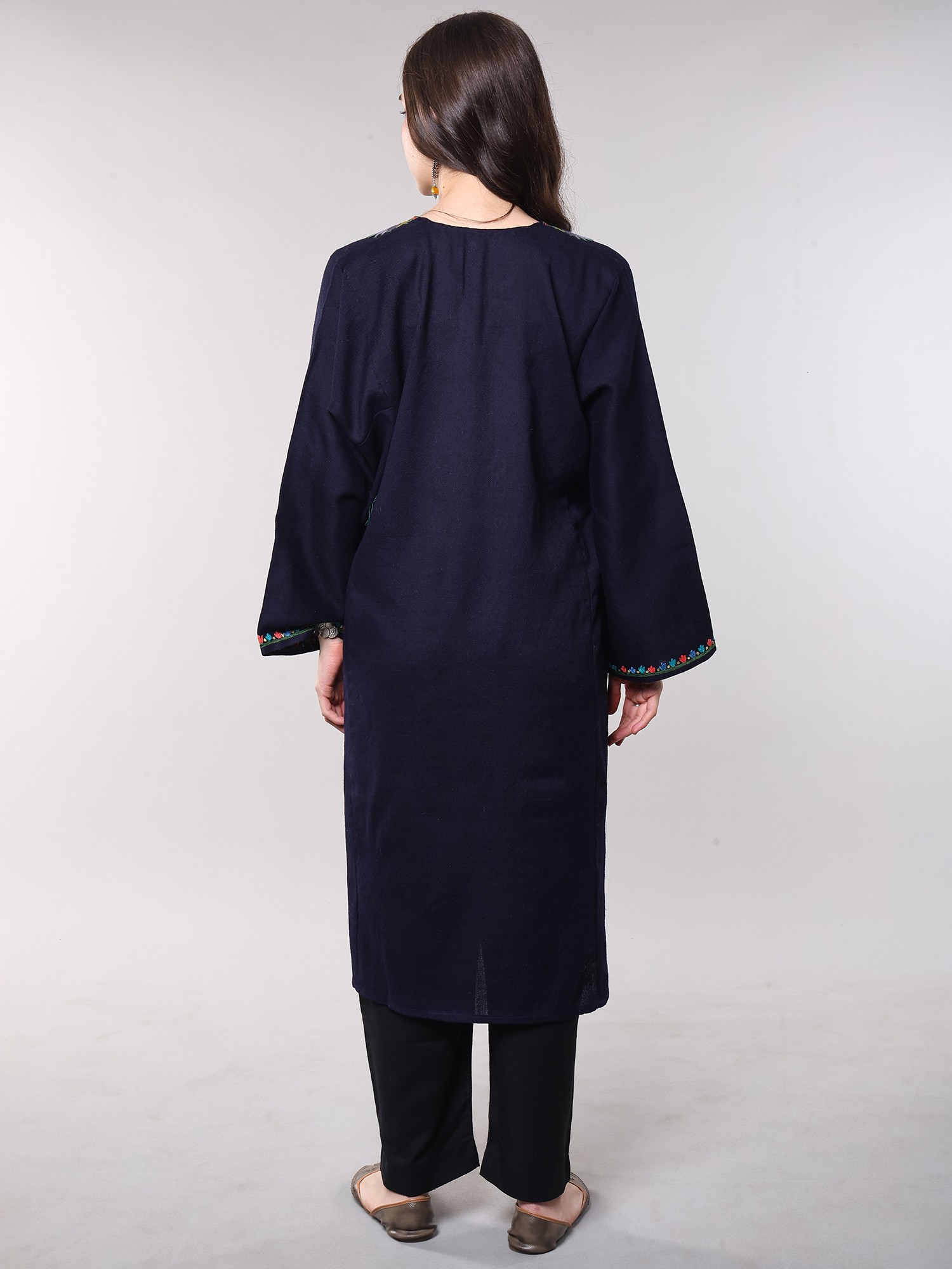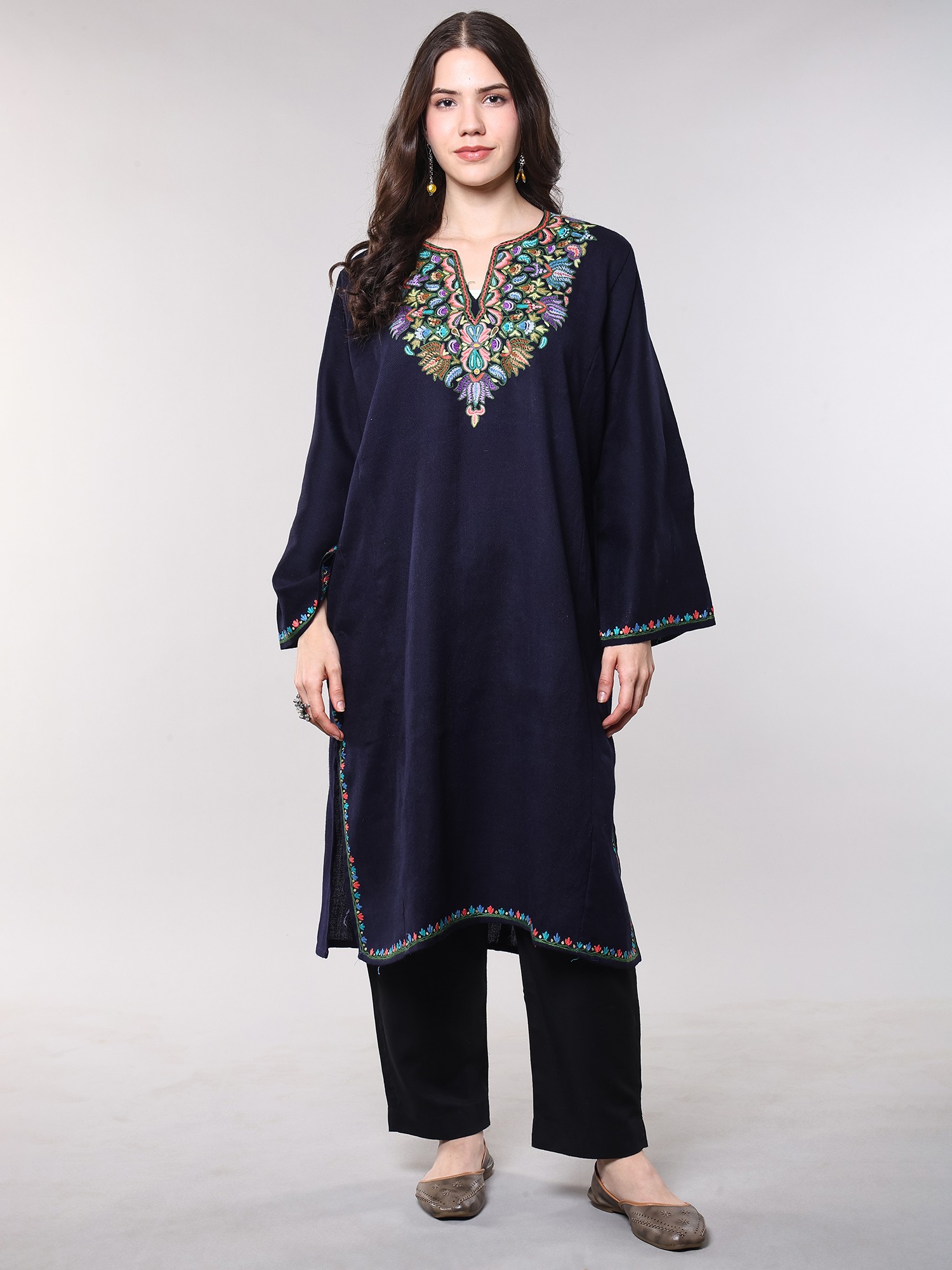 Discover the timeless allure of Kashmiri craftsmanship with this exquisite pure wool phiran. Rendered in a rich, deep sodalite blue, this garment is a testament to the artistry and heritage of the region. The soft, breathable wool provides unparalleled comfort, making it a perfect companion for cooler days and evenings, while its luxurious feel against the skin offers a touch of indulgence.
