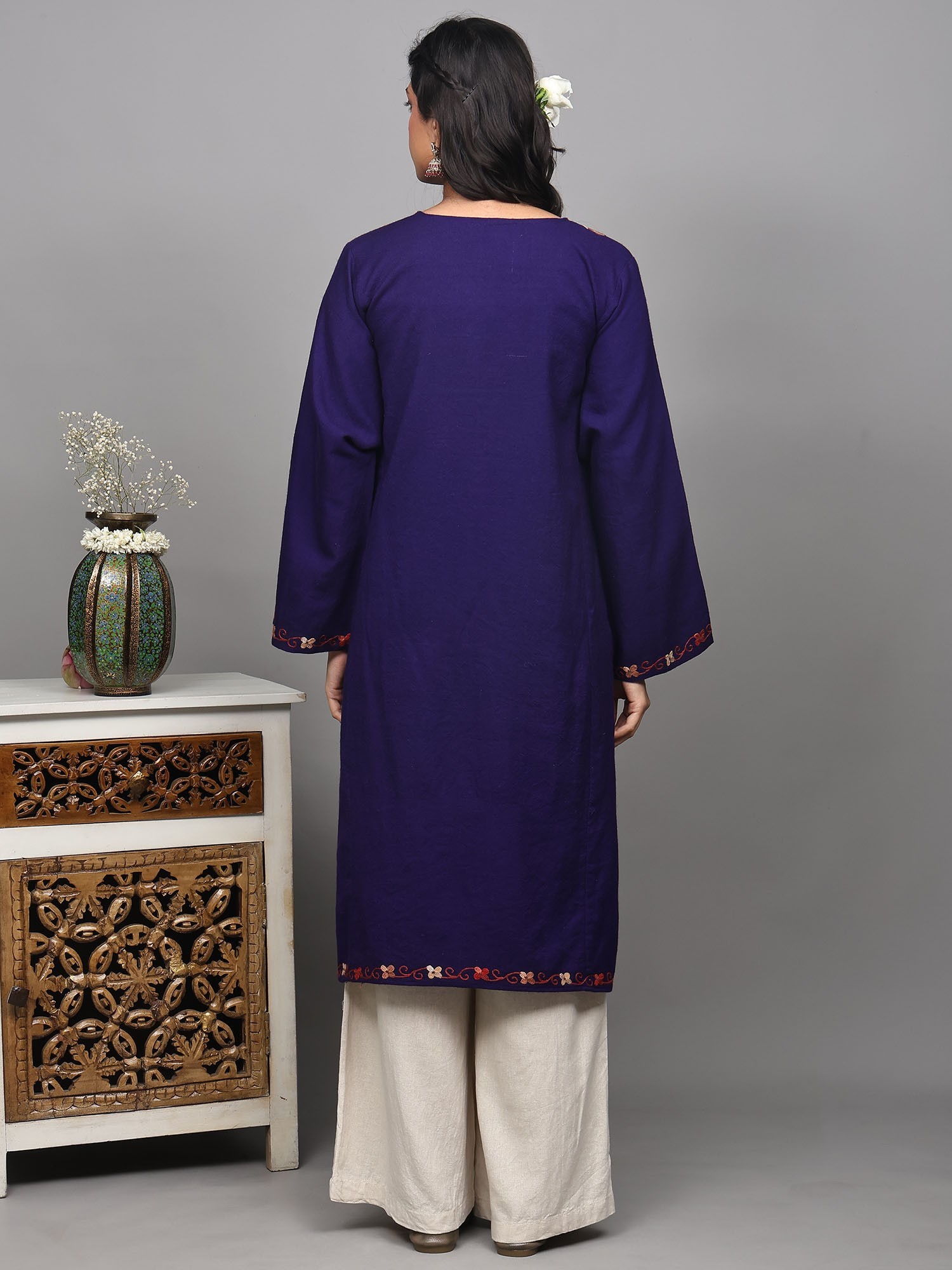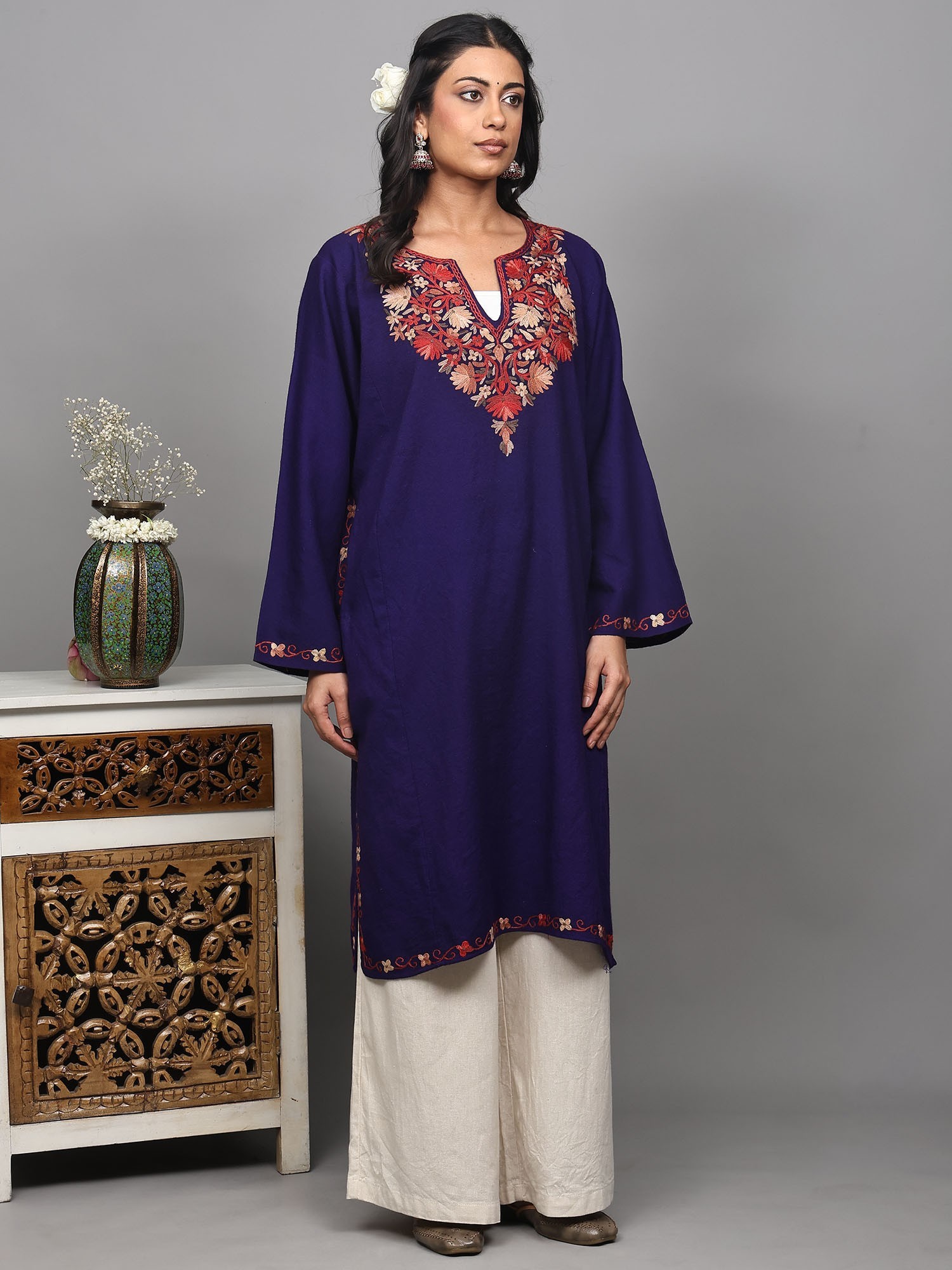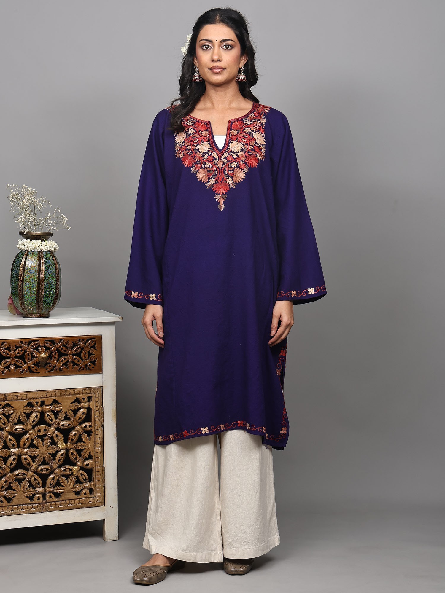 Discover the timeless allure of Kashmiri craftsmanship with this exquisite pure wool phiran. Rendered in a rich, deep sodalite blue, this garment is a testament to the artistry and heritage of the region. The soft, breathable wool provides unparalleled comfort, making it a perfect companion for cooler days and evenings, while its luxurious feel against the skin offers a touch of indulgence.