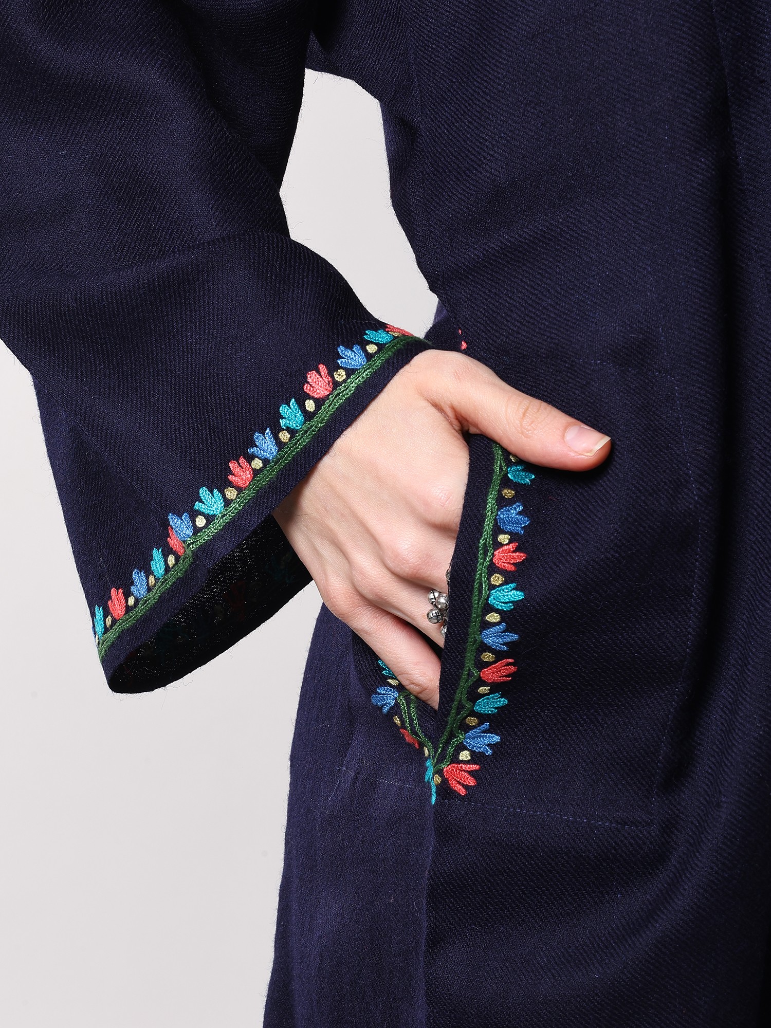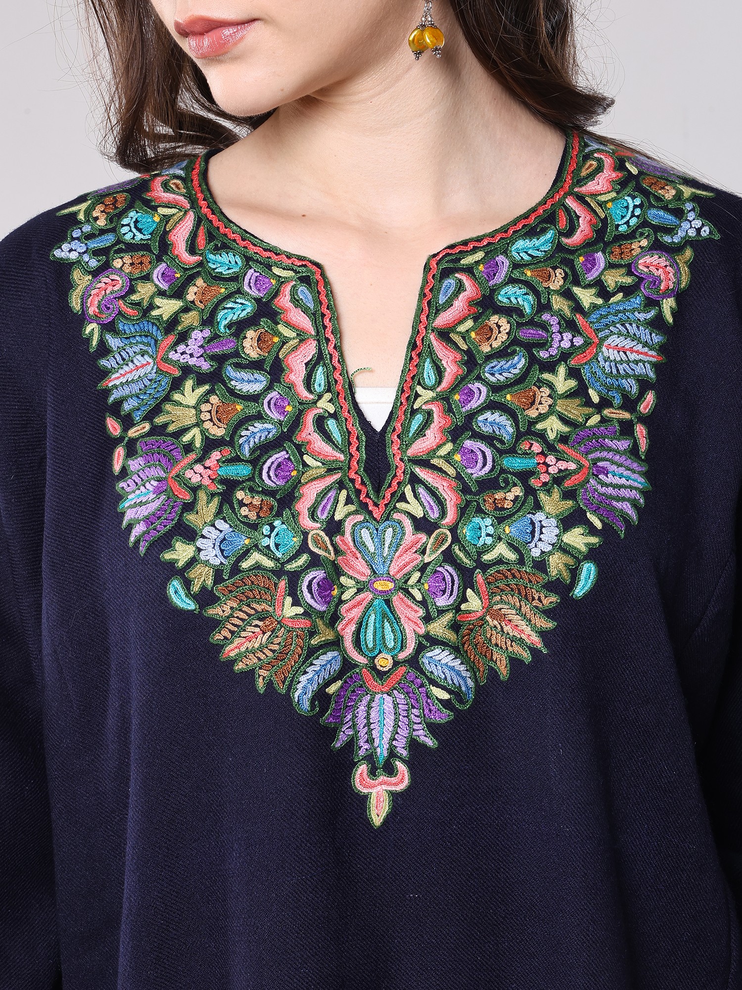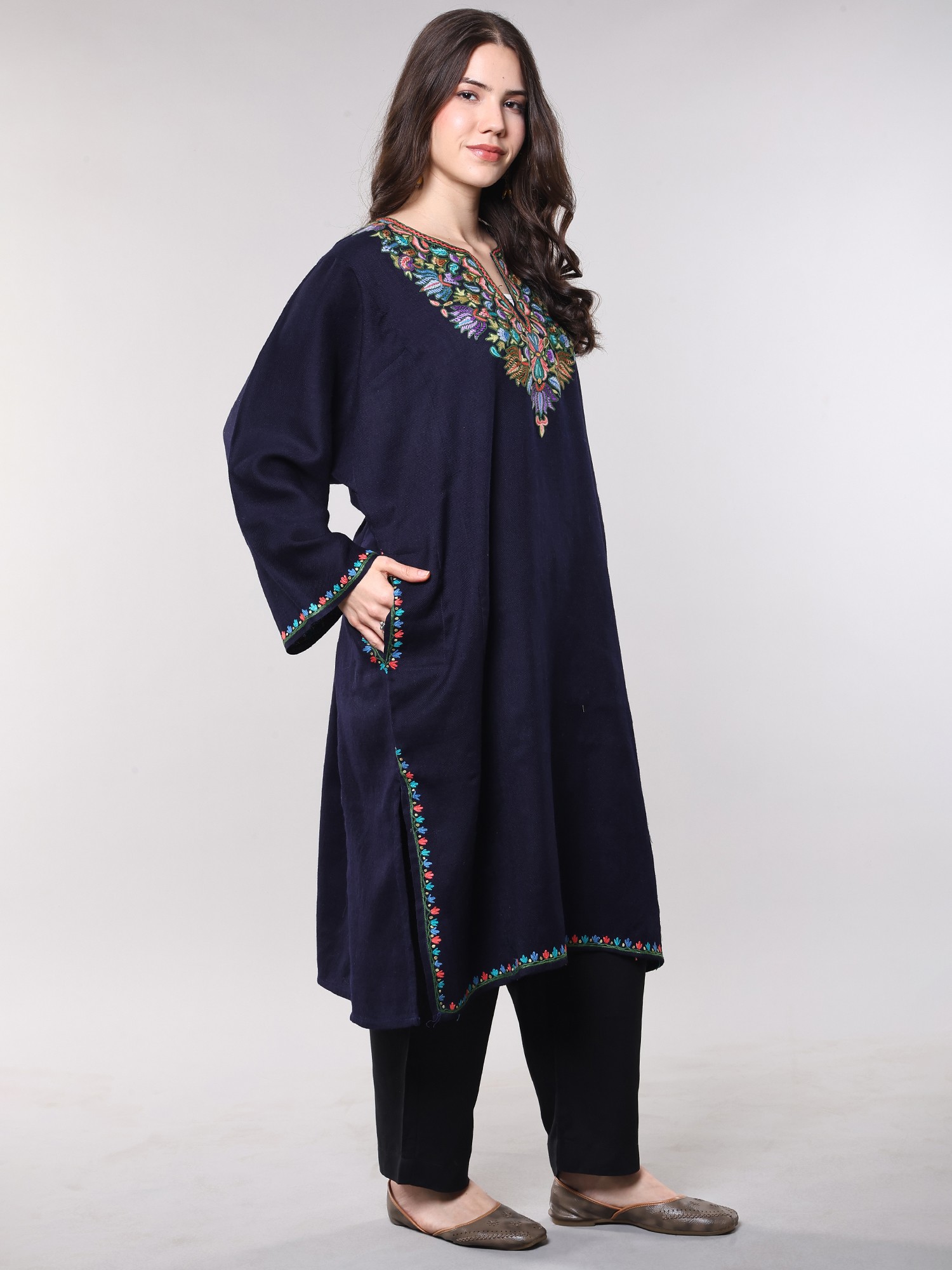 Wool Kashmiri Phiran with Aari Embroidered Paisleys on Neck and Side Pockets