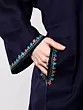 The true masterpiece of this phiran lies in its breathtaking Aari embroidery. Delicate and intricate floral motifs, meticulously hand-stitched using the traditional Aari needle, adorn the neckline and sleeves. The vibrant threads in shades of crimson, gold, and earthy tones create a stunning contrast against the sodalite blue, drawing the eye with their detailed artistry. This time-honored embroidery technique, passed down through generations of Kashmiri artisans, ensures each piece is a unique work of art, imbued with the spirit of its creators. The embroidery extends to the hemline, adding a subtle yet elegant flourish that completes the design.