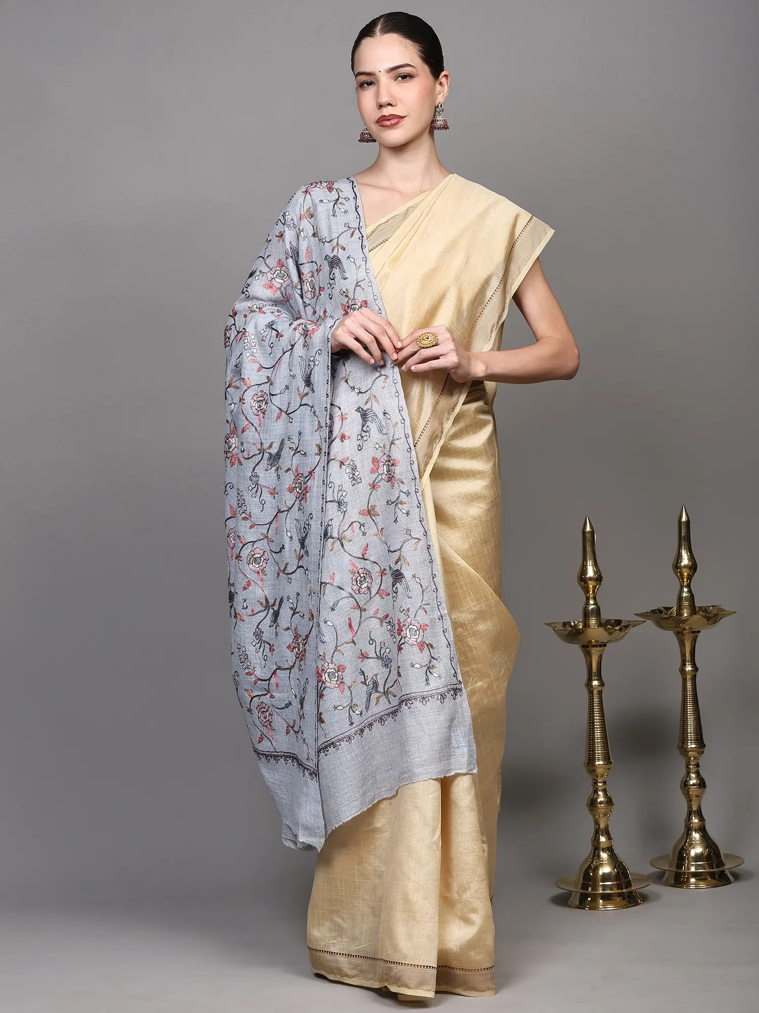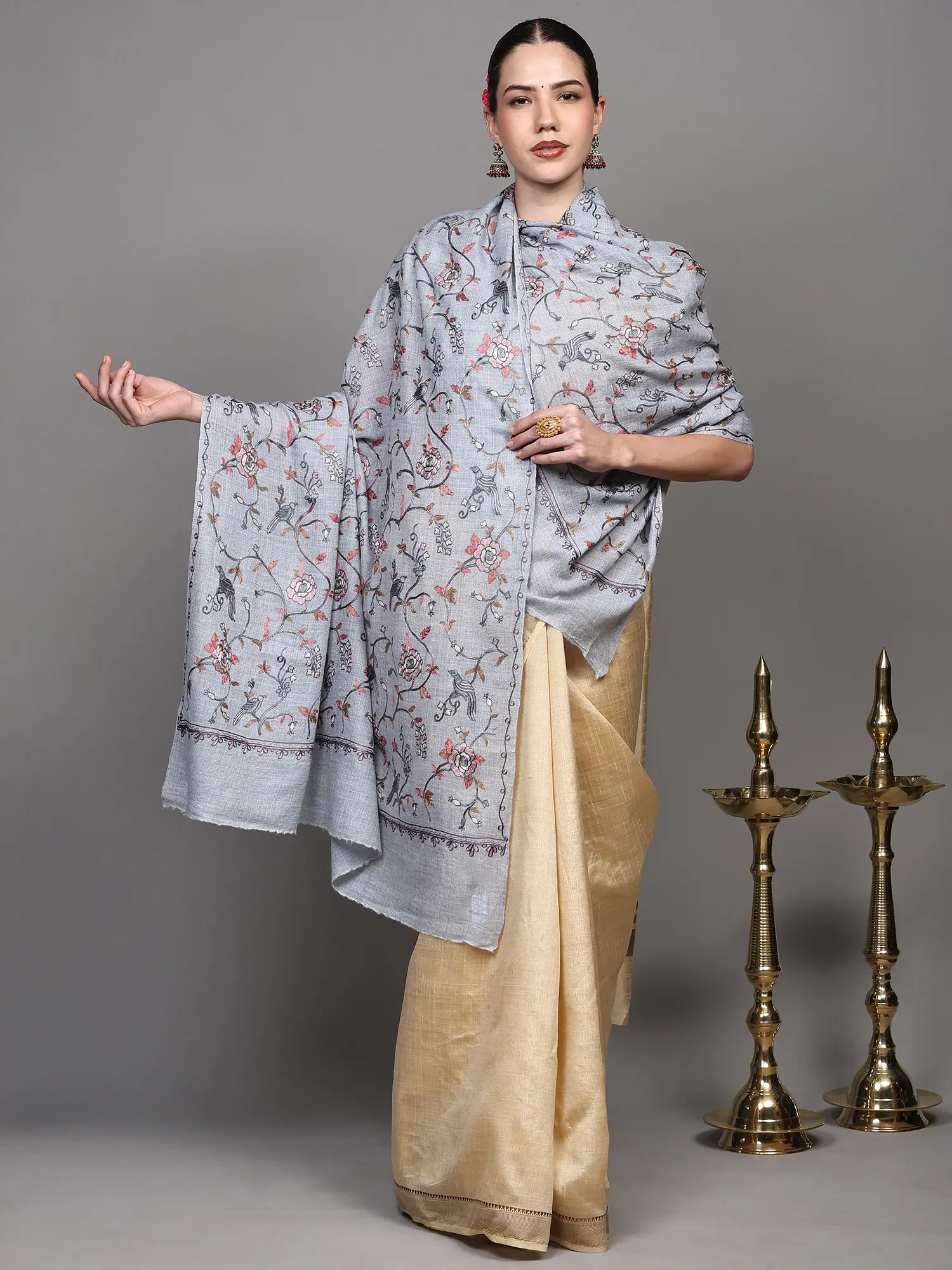 Light-Taupe Pure Pashmina Shawl from Kashmir with Sozni Floral Embroidery All-Over