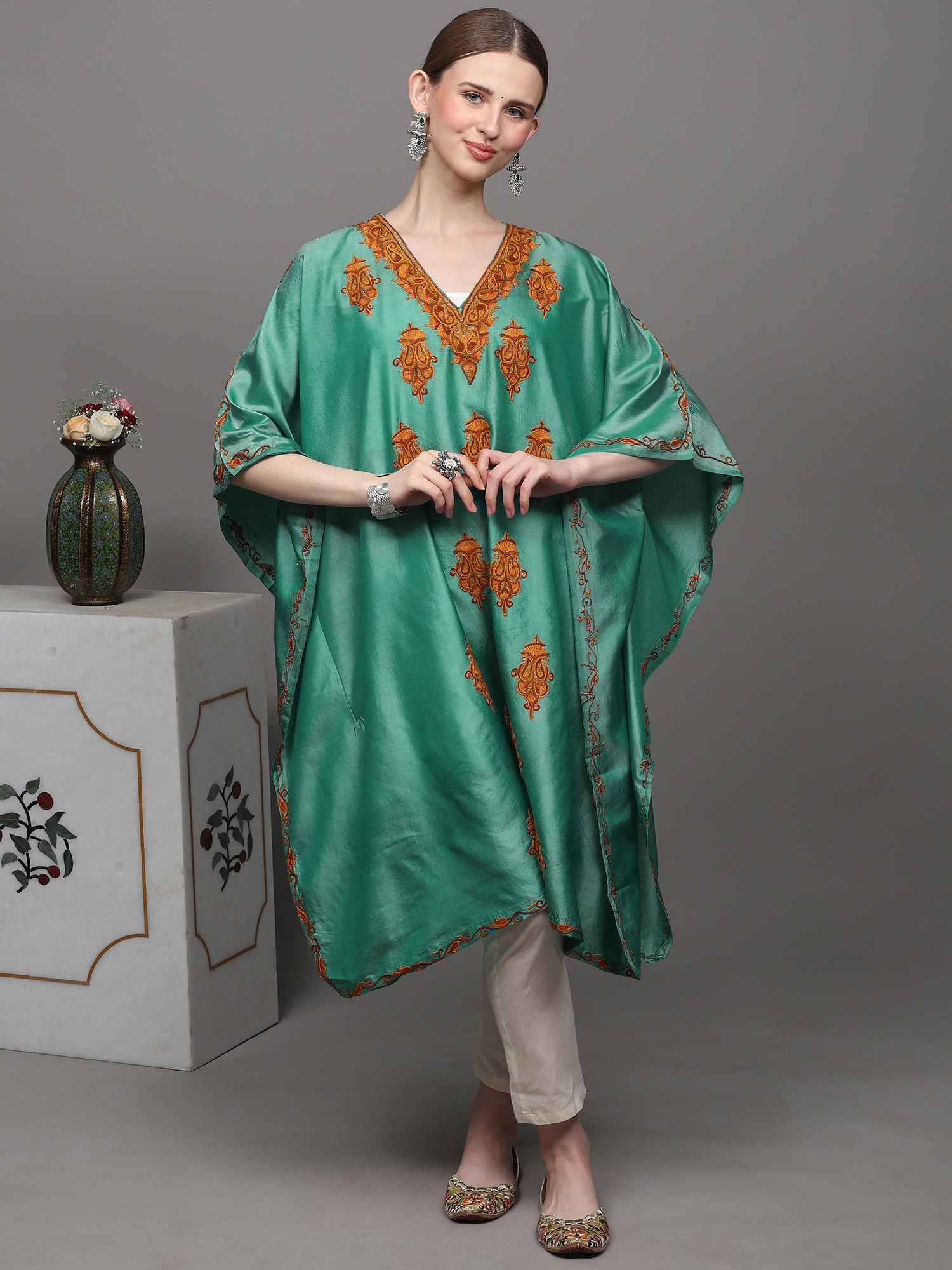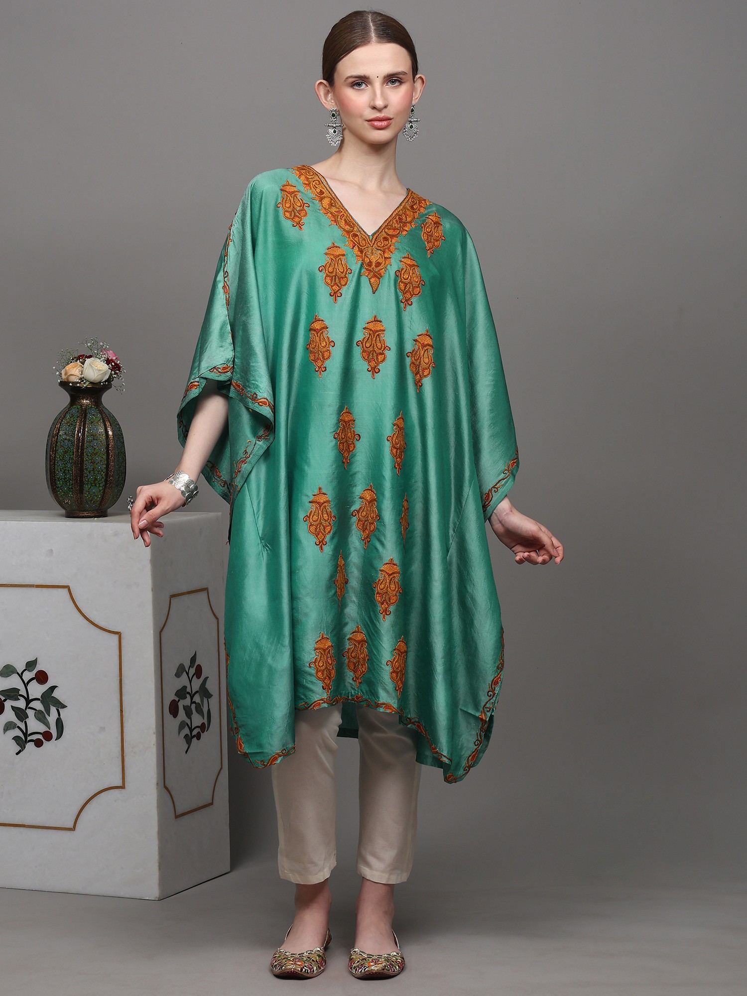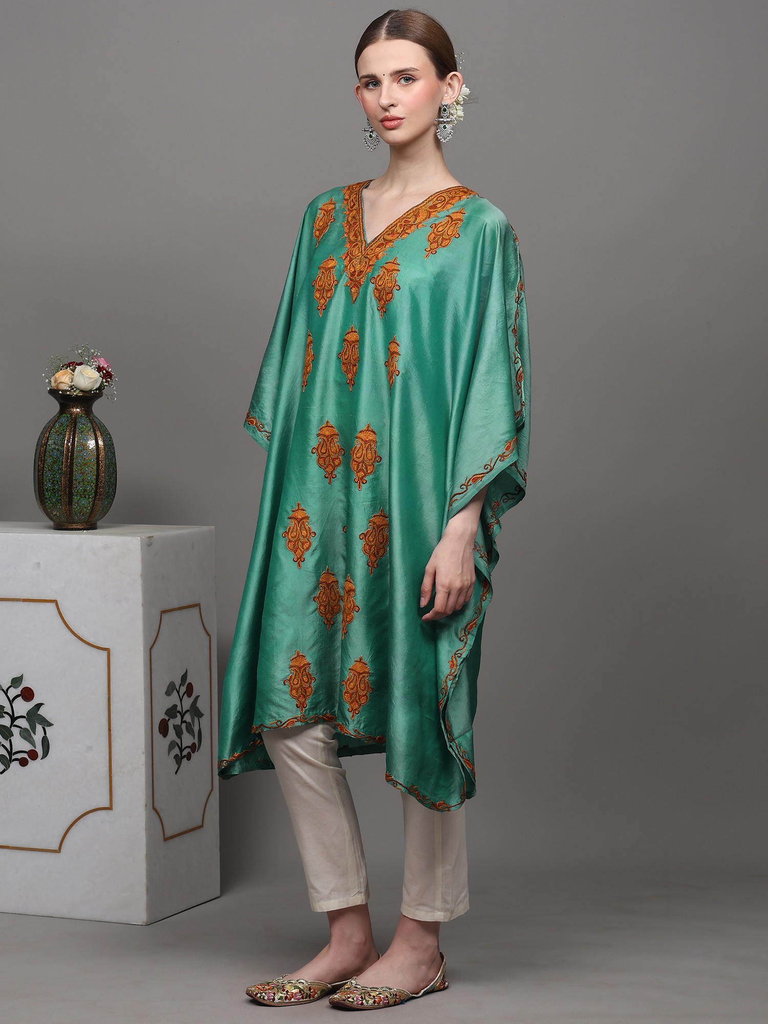 A traditionally loved piece, a Kaftan with the enchanting Agate-green color from Kashmir, petrified with raveled Aari hand-embroidery paisley. This kaftan is a masterpiece of craftsmanship, showcasing the intricate artistry of Kashmiri embroidery. The elegant paisley motifs, meticulously crafted with precision, bring beauty to this beautiful pure silk kaftan. Embrace the beauty of Kashmiri handwork and make a statement with this unique Agate-green kaftan that captures the essence of traditional craftsmanship.