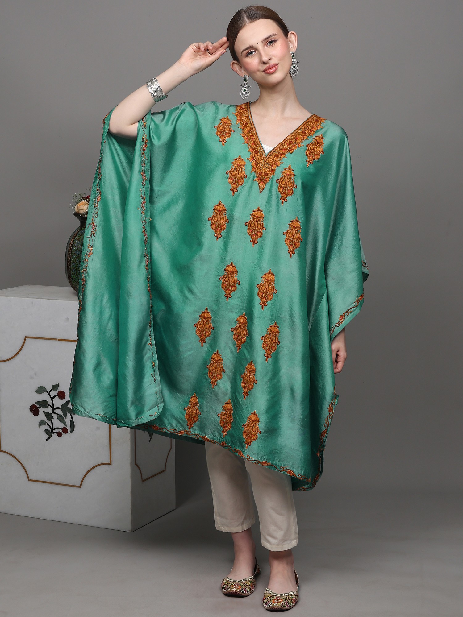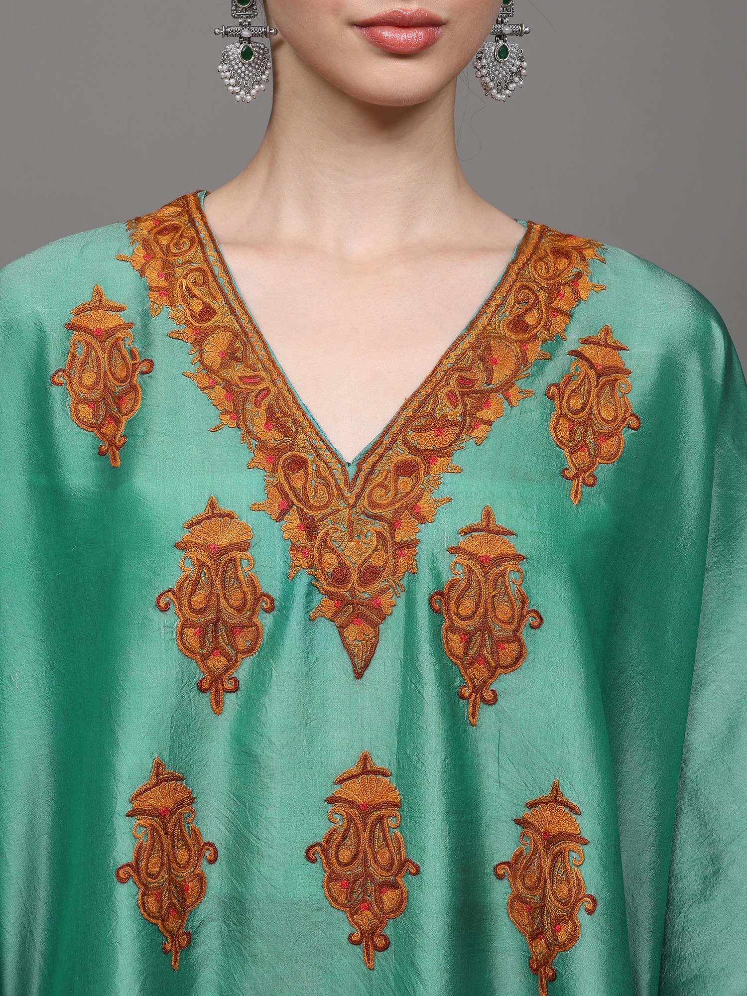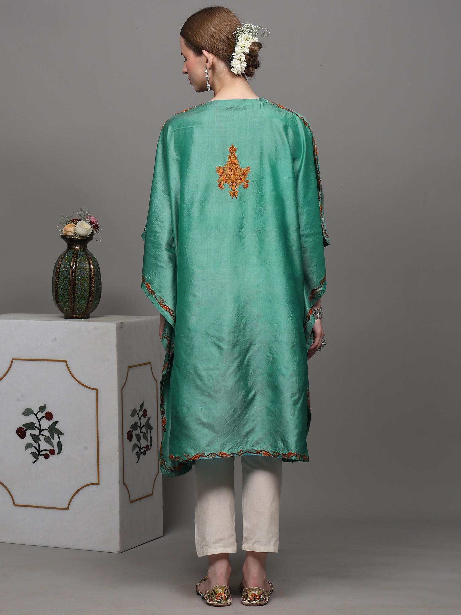 A traditionally loved piece, a Kaftan with the enchanting Agate-green color from Kashmir, petrified with raveled Aari hand-embroidery paisley. This kaftan is a masterpiece of craftsmanship, showcasing the intricate artistry of Kashmiri embroidery. The elegant paisley motifs, meticulously crafted with precision, bring beauty to this beautiful pure silk kaftan. Embrace the beauty of Kashmiri handwork and make a statement with this unique Agate-green kaftan that captures the essence of traditional craftsmanship.