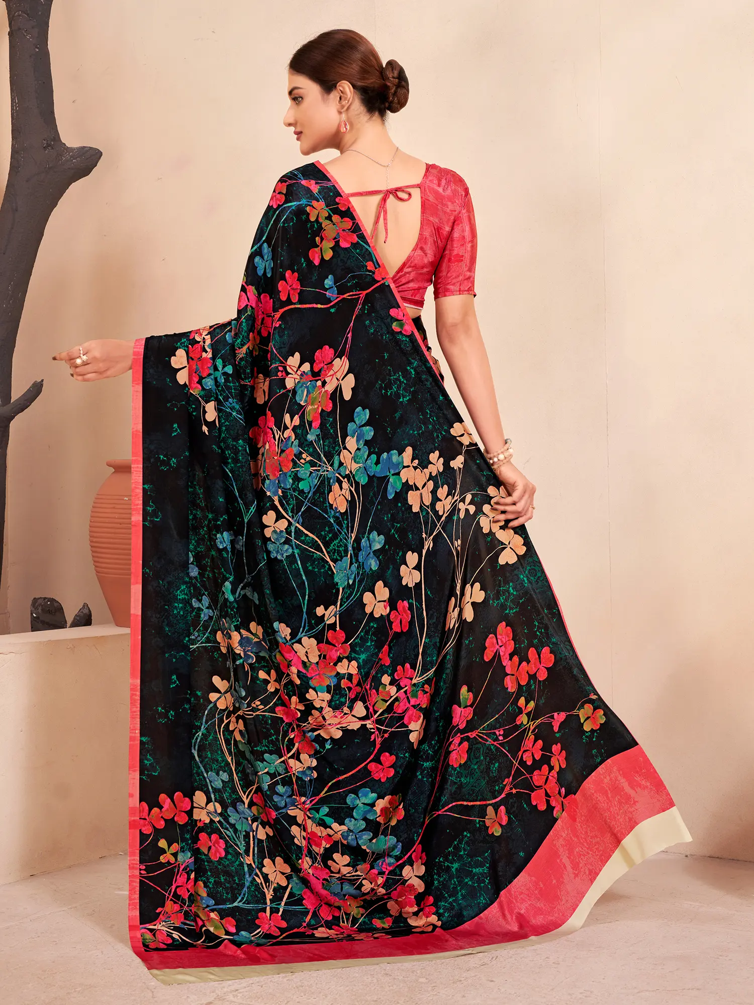 Designed with the modern woman in mind, this saree effortlessly blends traditional aesthetics with contemporary appeal, making it the ultimate festival wear. The lightweight crepe soft silk ensures ease of movement, allowing you to celebrate and socialize with complete freedom. The intricate floral pattern adds a festive spirit, while the luxurious feel of the silk elevates your look. Whether you're attending a wedding, a celebratory party, or a special occasion, this saree will ensure you stand out from the crowd with its unique blend of style and comfort.