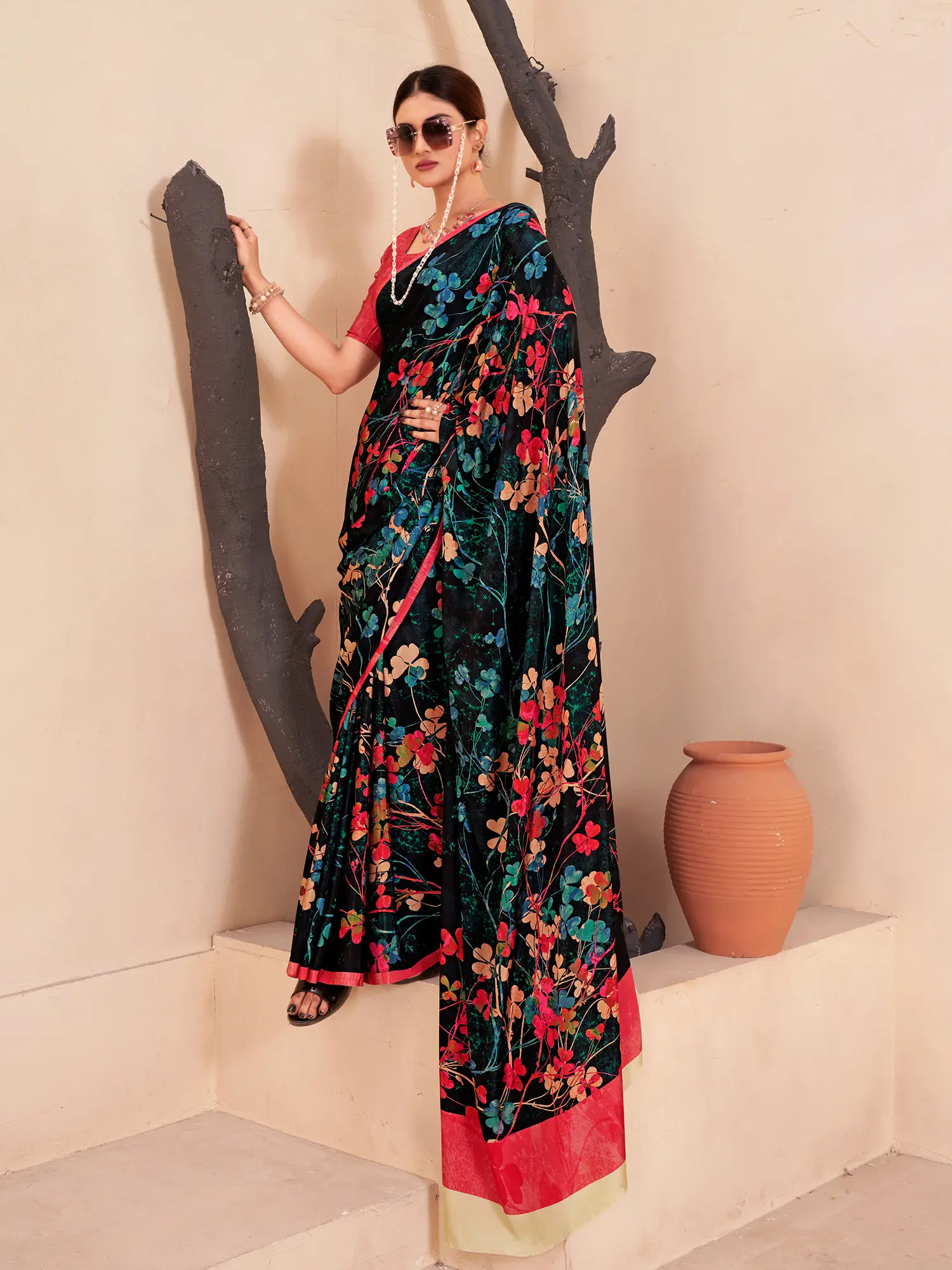 The true magic of this saree lies in its captivating all-over digital print. A riot of colorful flowers bursts forth against a deep, rich background, creating a visual spectacle that is both eye-catching and sophisticated. Delicate petals in shades of crimson, coral, cerulean, and blush are intertwined with lush green foliage, evoking the feeling of a flourishing garden in full bloom. The digital printing technique ensures that each detail is rendered with exceptional clarity and depth, bringing the floral motif to life with striking realism. This dynamic print makes the saree a perfect choice for festive gatherings, cultural events, or any moment you wish to express your individual style with a touch of artistic flair.