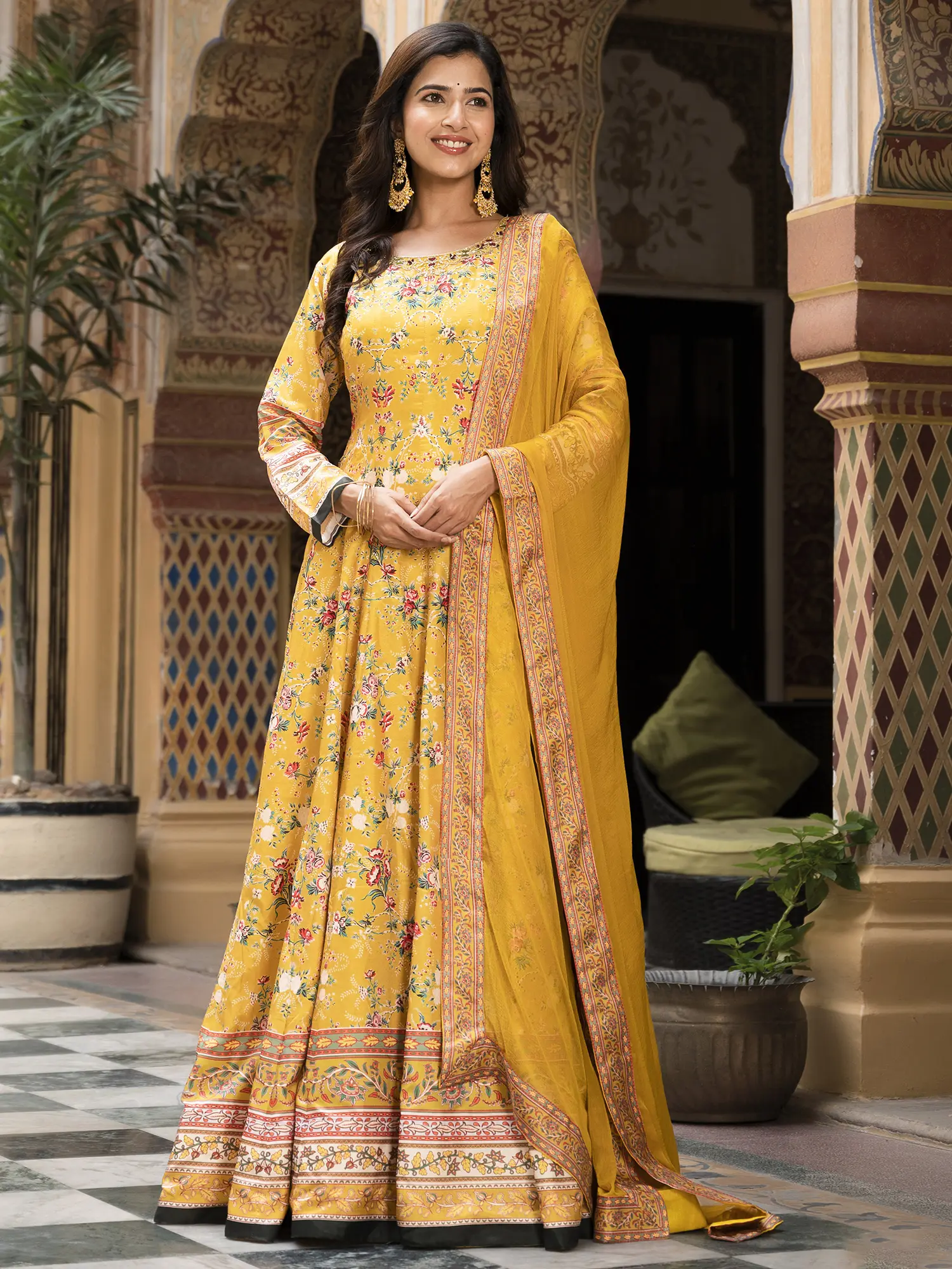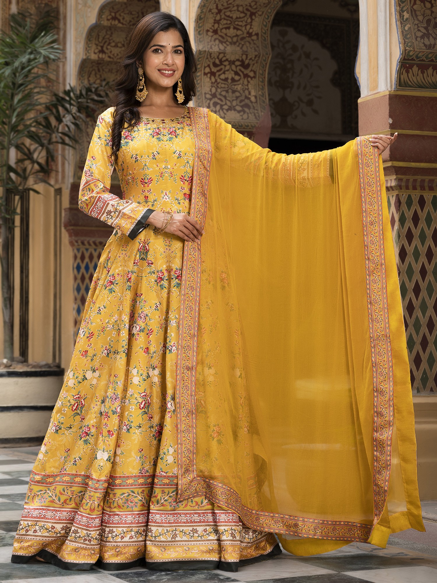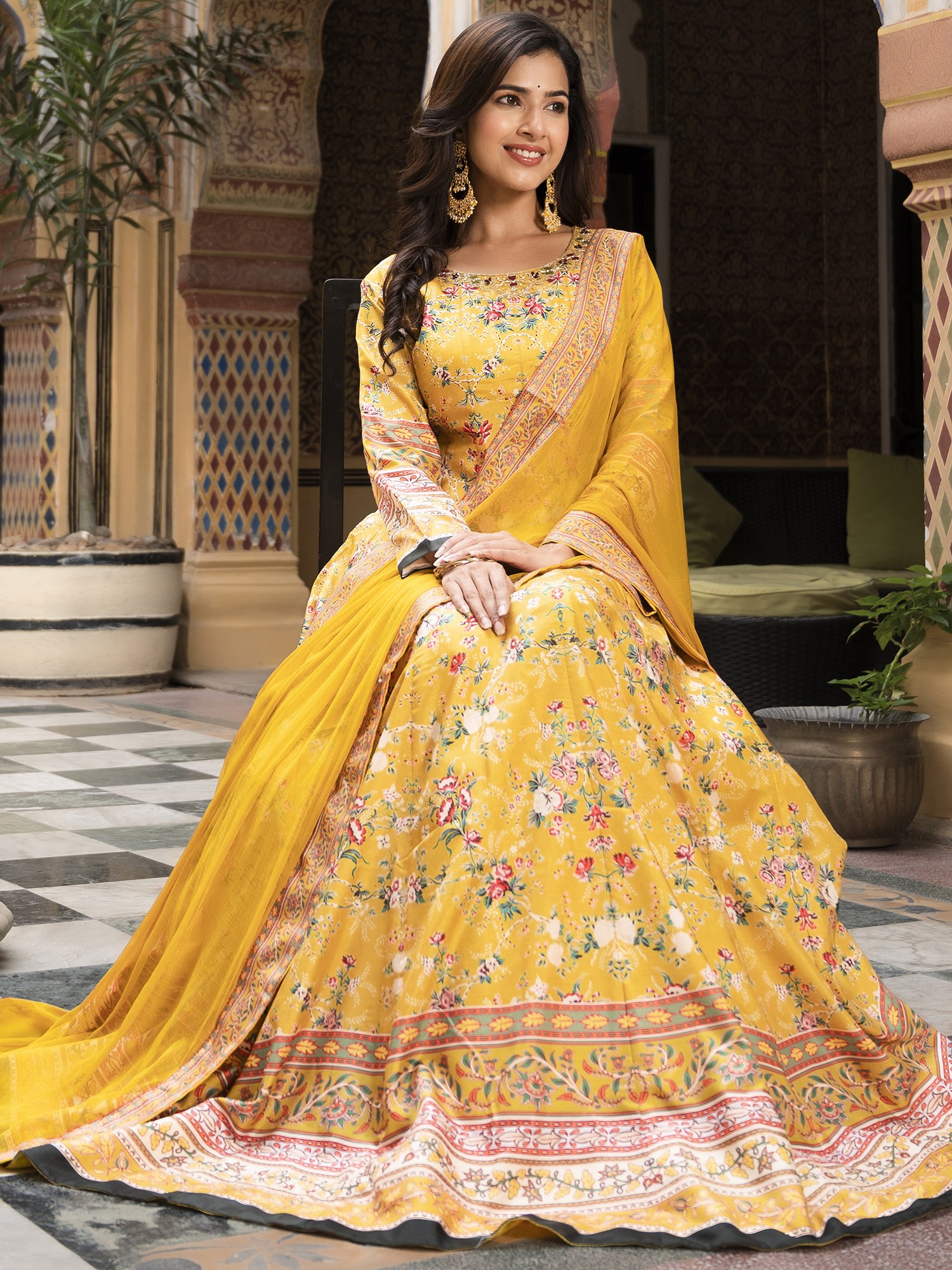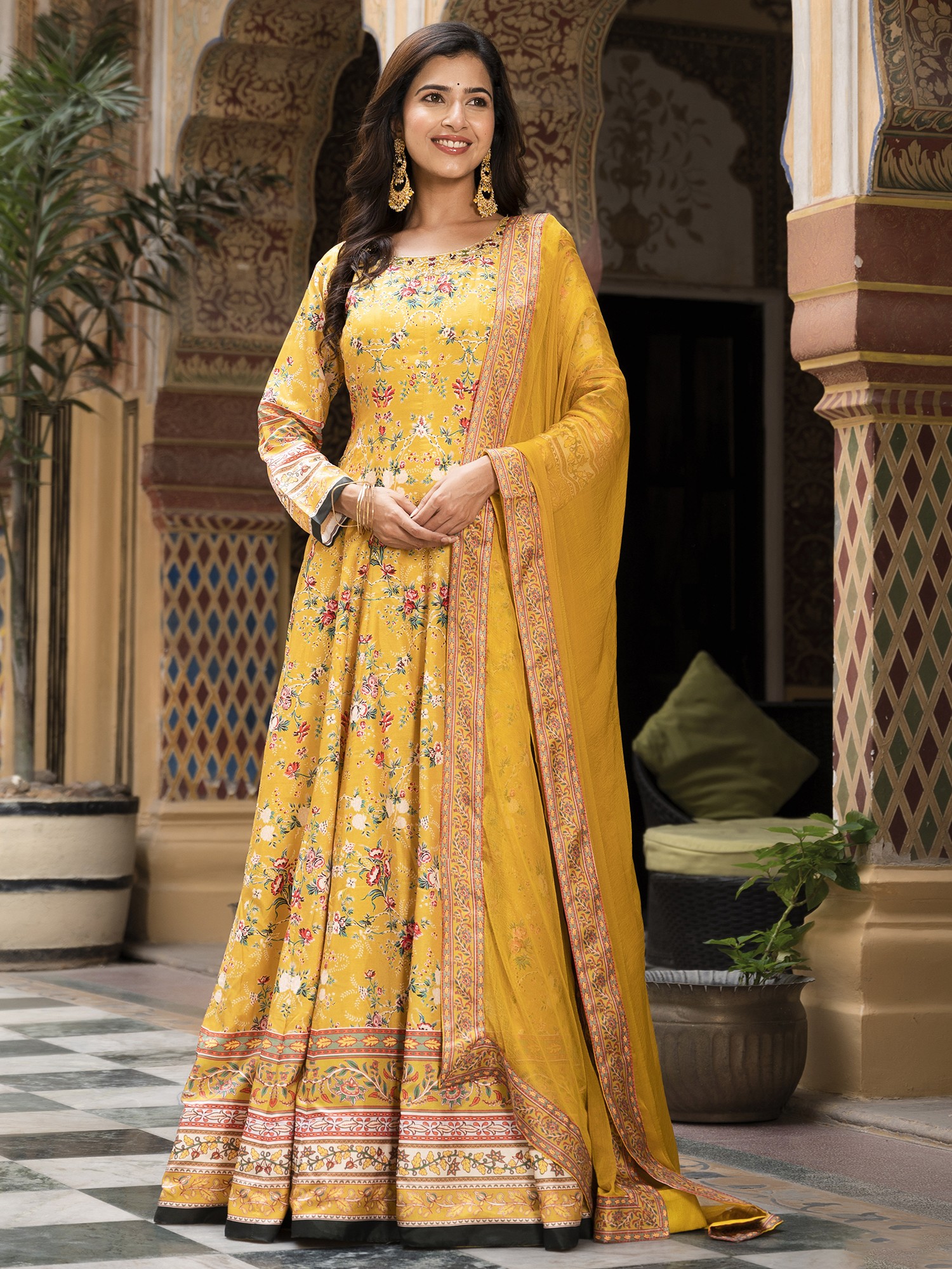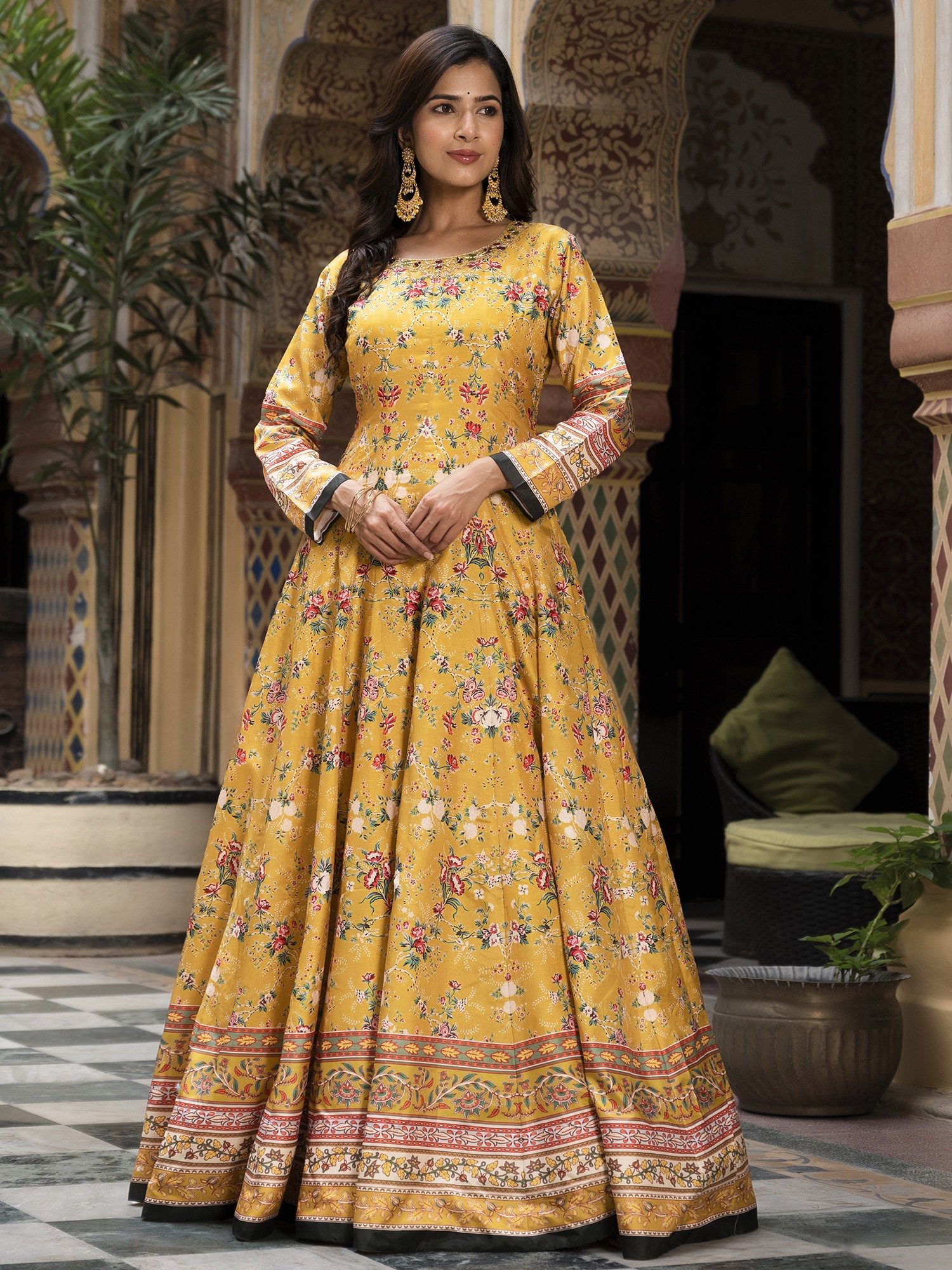 Step into the spotlight with this stunning long gown, designed to capture the vibrant spirit of festive occasions. Crafted from exquisite Dola Silk, this gown offers a luxurious feel and a beautiful drape, ensuring you look and feel your best. The rich color provides a striking canvas for the all-over floral digital print, creating a look that is both timeless and contemporary. Whether you're attending a wedding, a celebratory gathering, or simply want to embrace your inner radiance, this gown is the perfect choice.