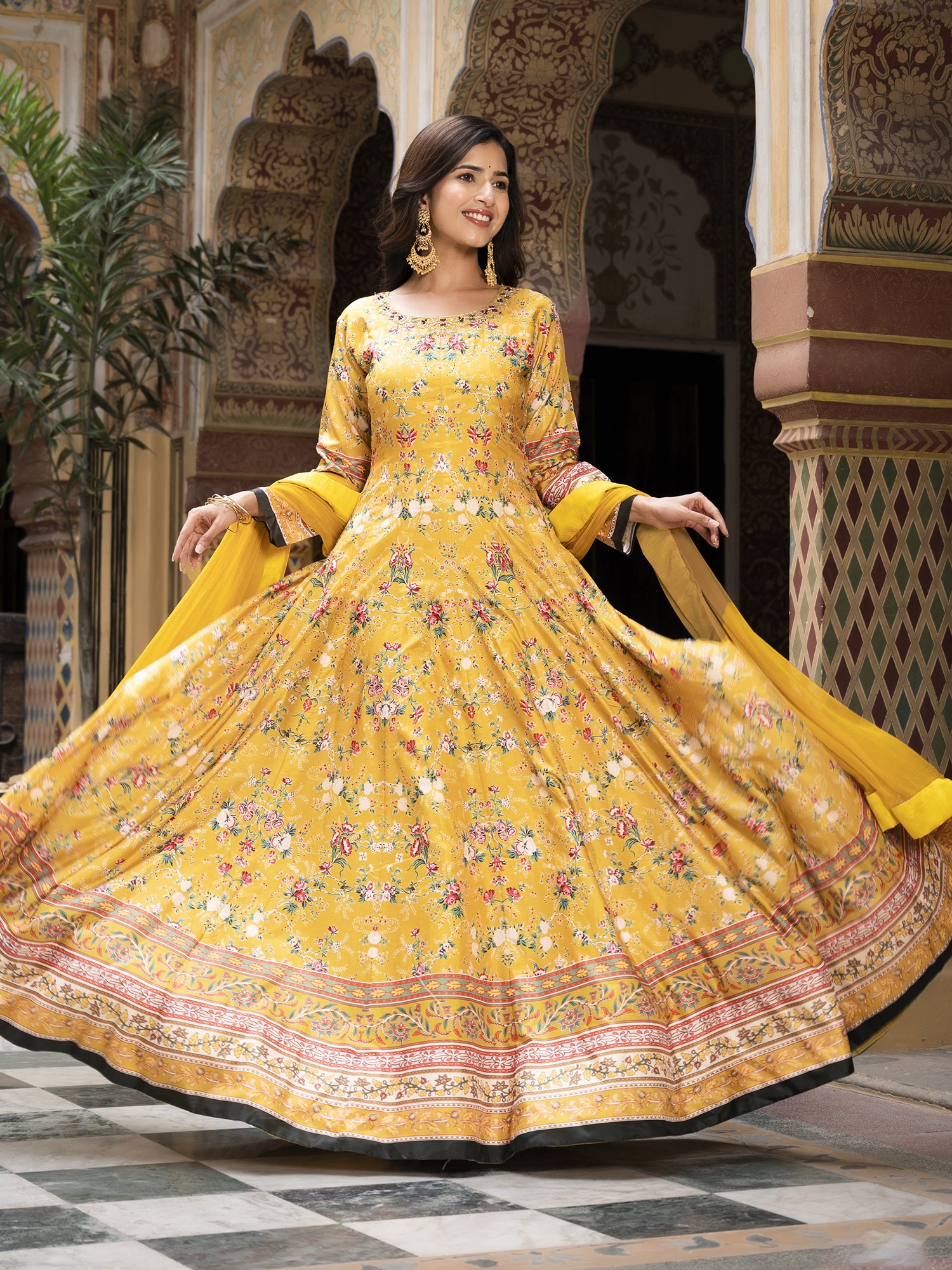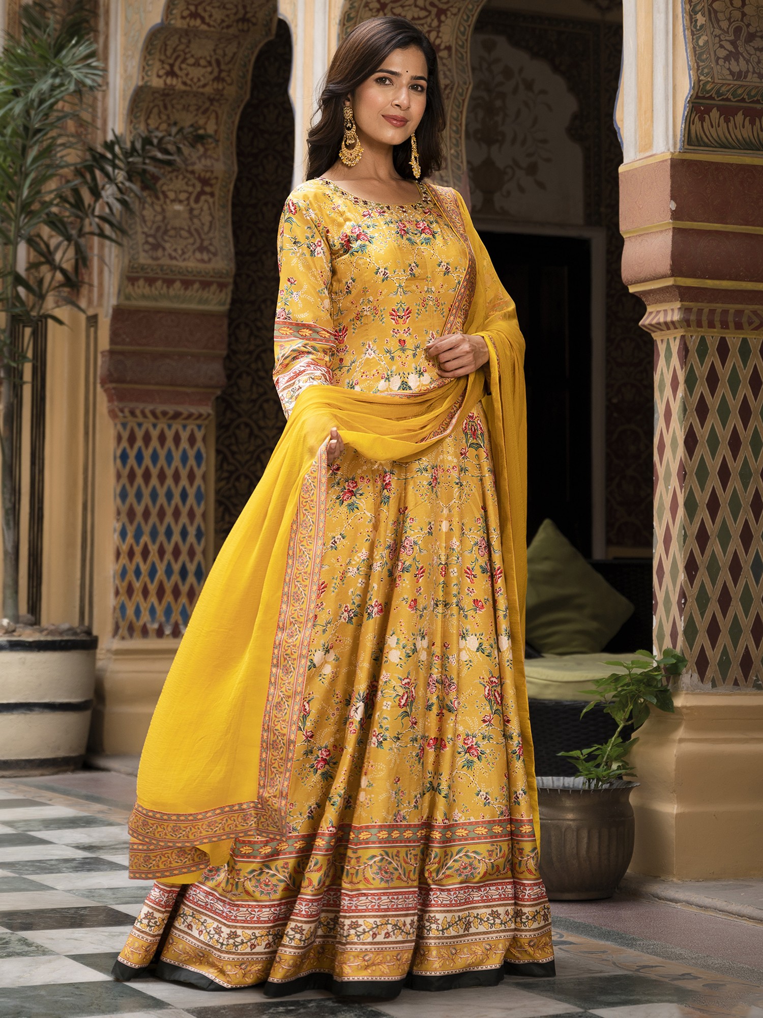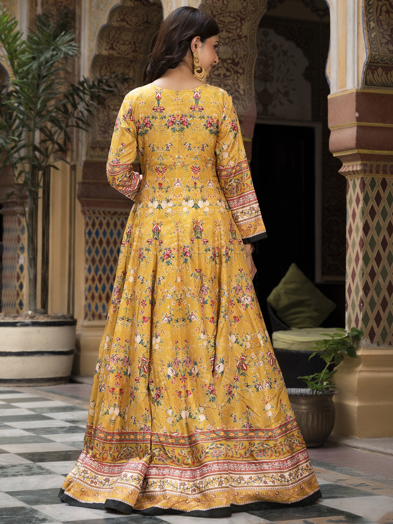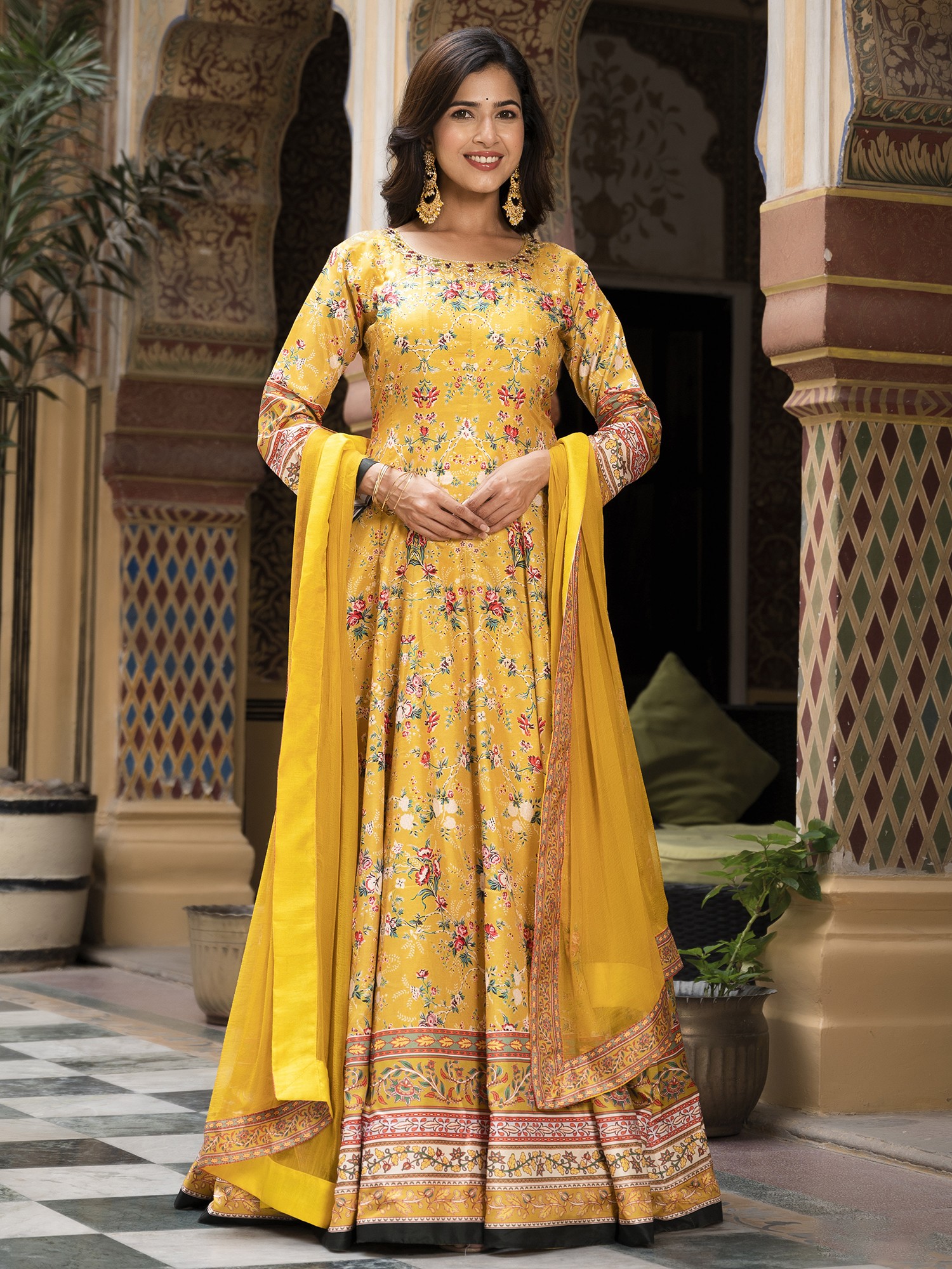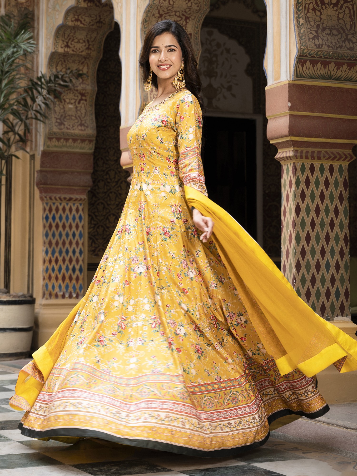 Step into the spotlight with this stunning long gown, designed to capture the vibrant spirit of festive occasions. Crafted from exquisite Dola Silk, this gown offers a luxurious feel and a beautiful drape, ensuring you look and feel your best. The rich color provides a striking canvas for the all-over floral digital print, creating a look that is both timeless and contemporary. Whether you're attending a wedding, a celebratory gathering, or simply want to embrace your inner radiance, this gown is the perfect choice.
