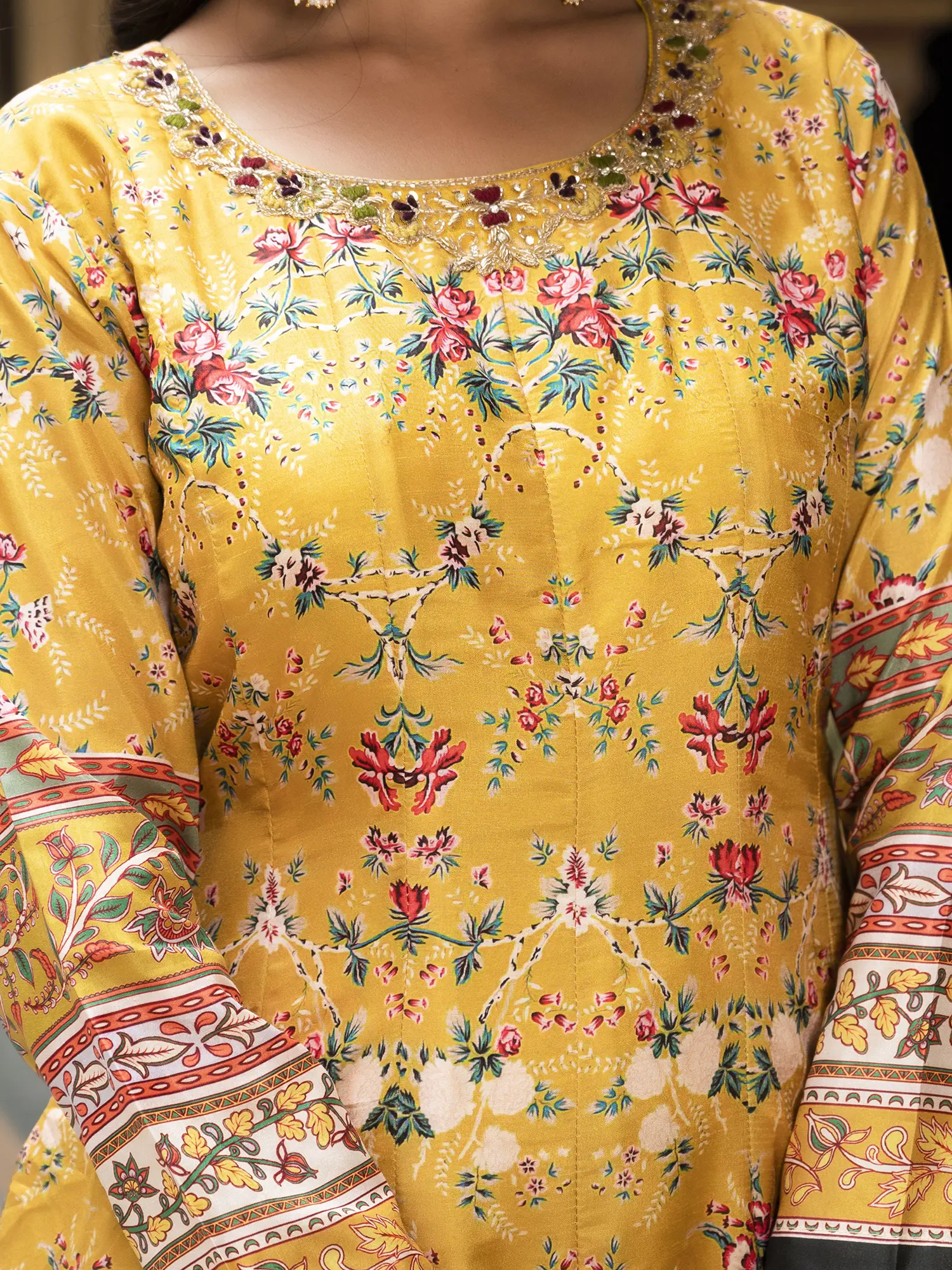 The gown features a flattering silhouette that flows gracefully from the shoulders to the hem, creating a sense of effortless elegance. The detailed floral print adds depth and visual interest, while the matching dupatta completes the ensemble, offering versatility in styling. Drape it over your shoulders for a classic look, or let it cascade down your arms for a more relaxed feel. The round neckline is embellished to accentuate the details without being overly revealing.
