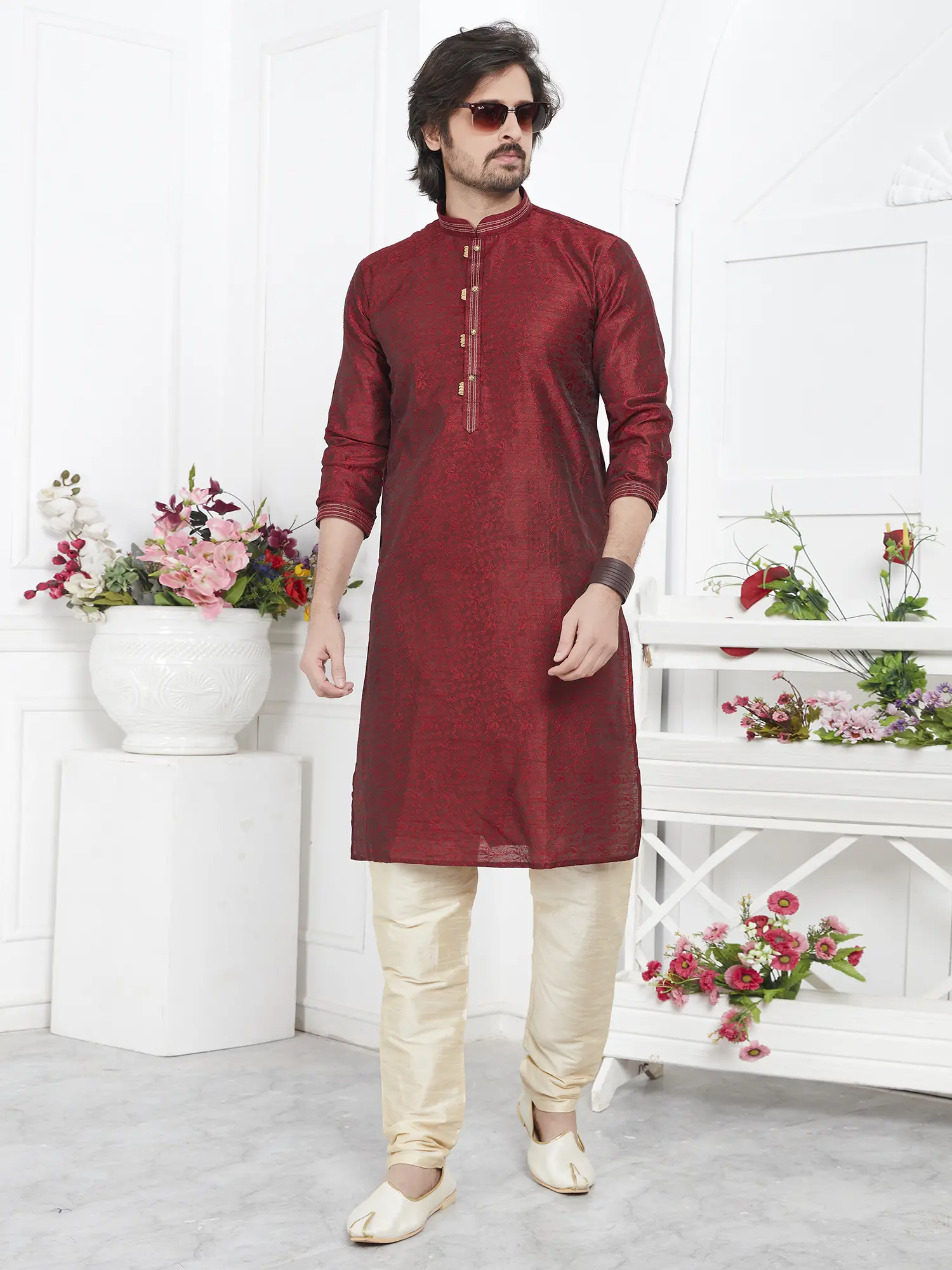 Wedding Kurta Pajama Set with All-Over Woven Floral Motifs in Self