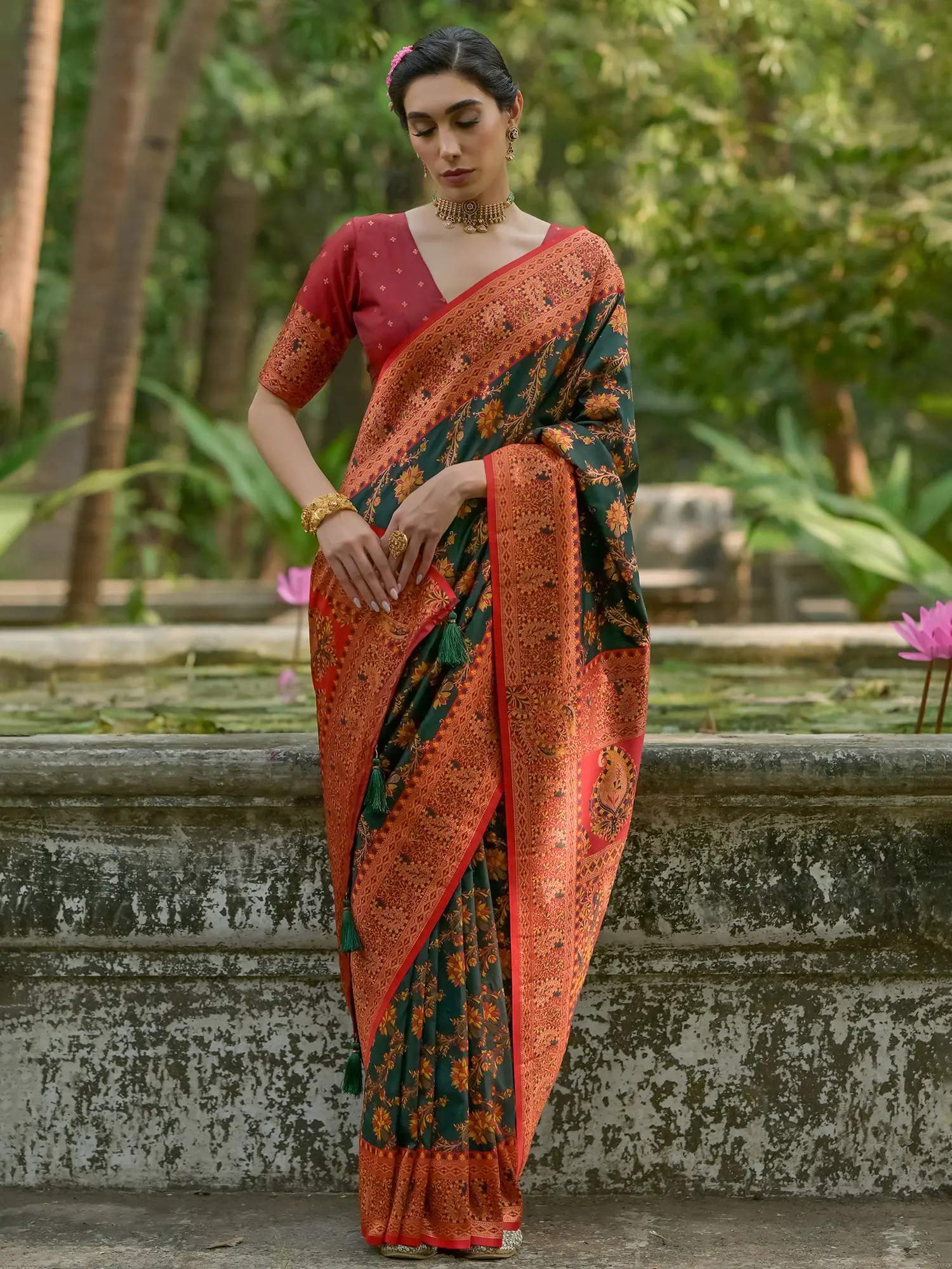Redwood Shimmering Saree with Embroidered Flowers All-Over