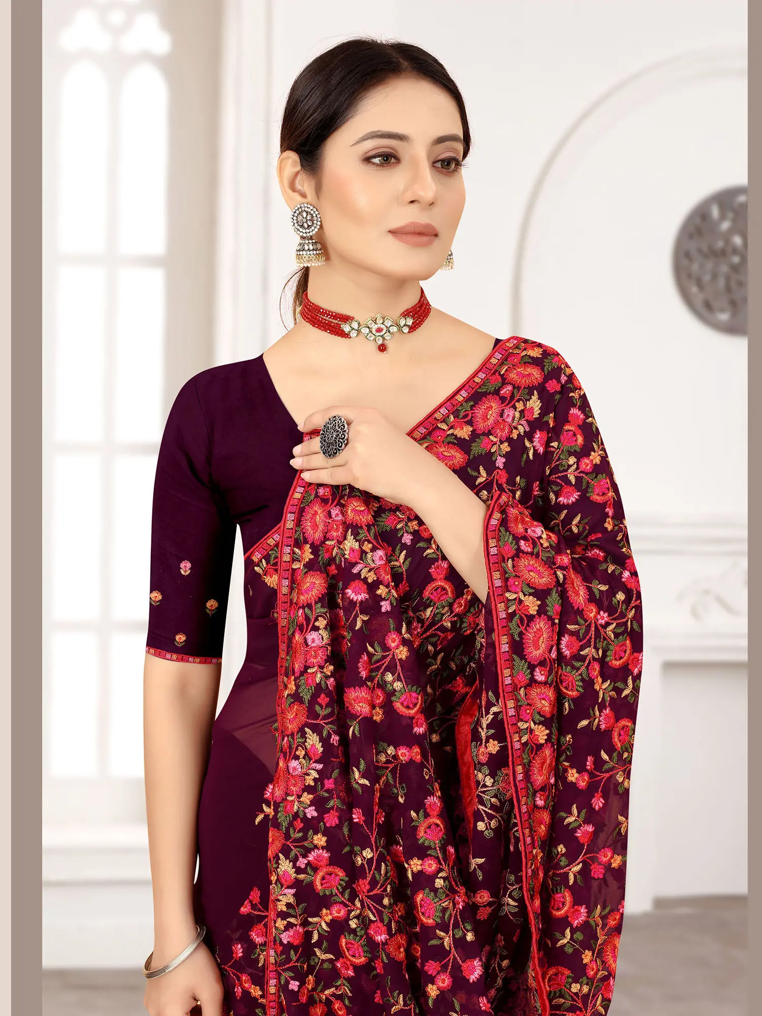 Regal-Orchid Saree from Bangalore with Woven Floral Motifs in Copper Colored Thread and Warli Art on Border-Pallu