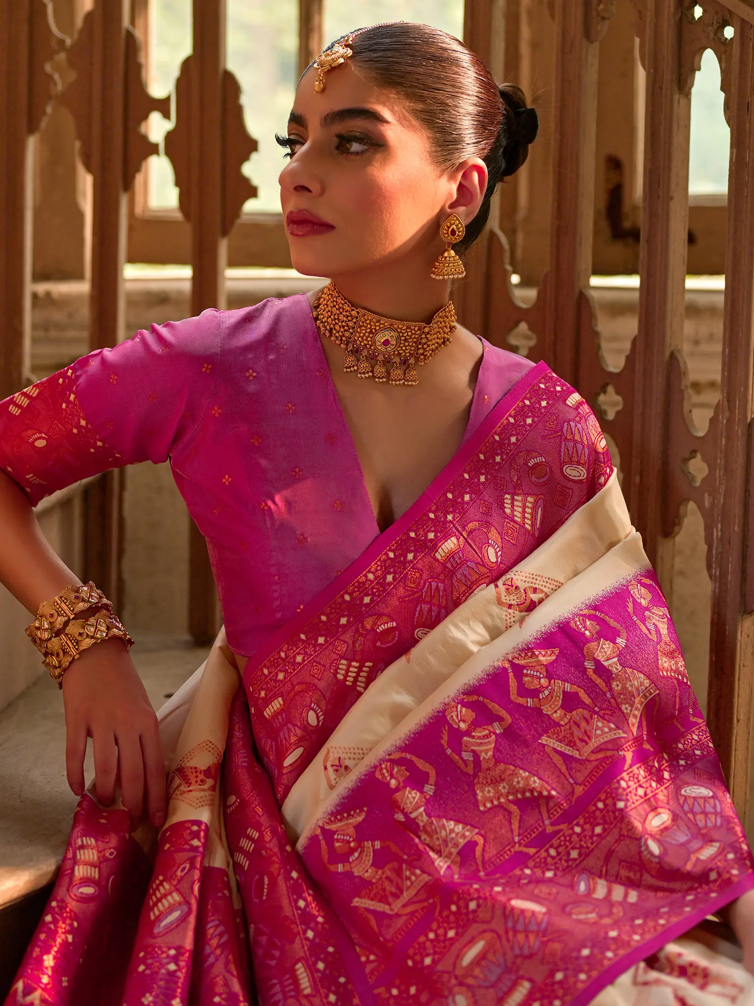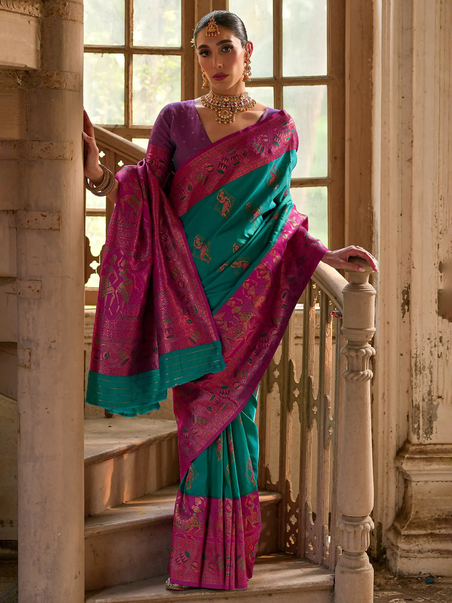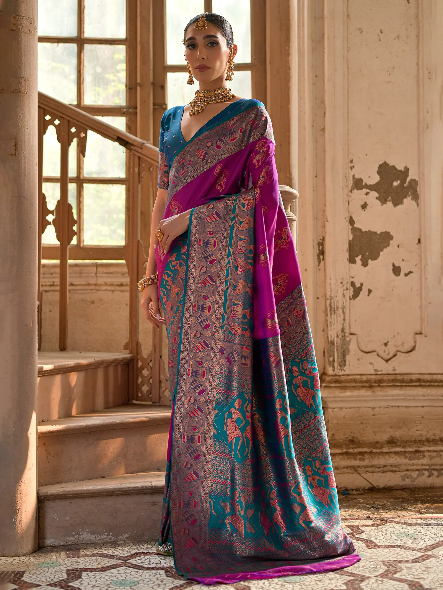 Dual Shade Pure Silk Saree with Golden Zari Woven Peacock-Elephant Motif Broad Border and Bold Aamra Motif on Pallu