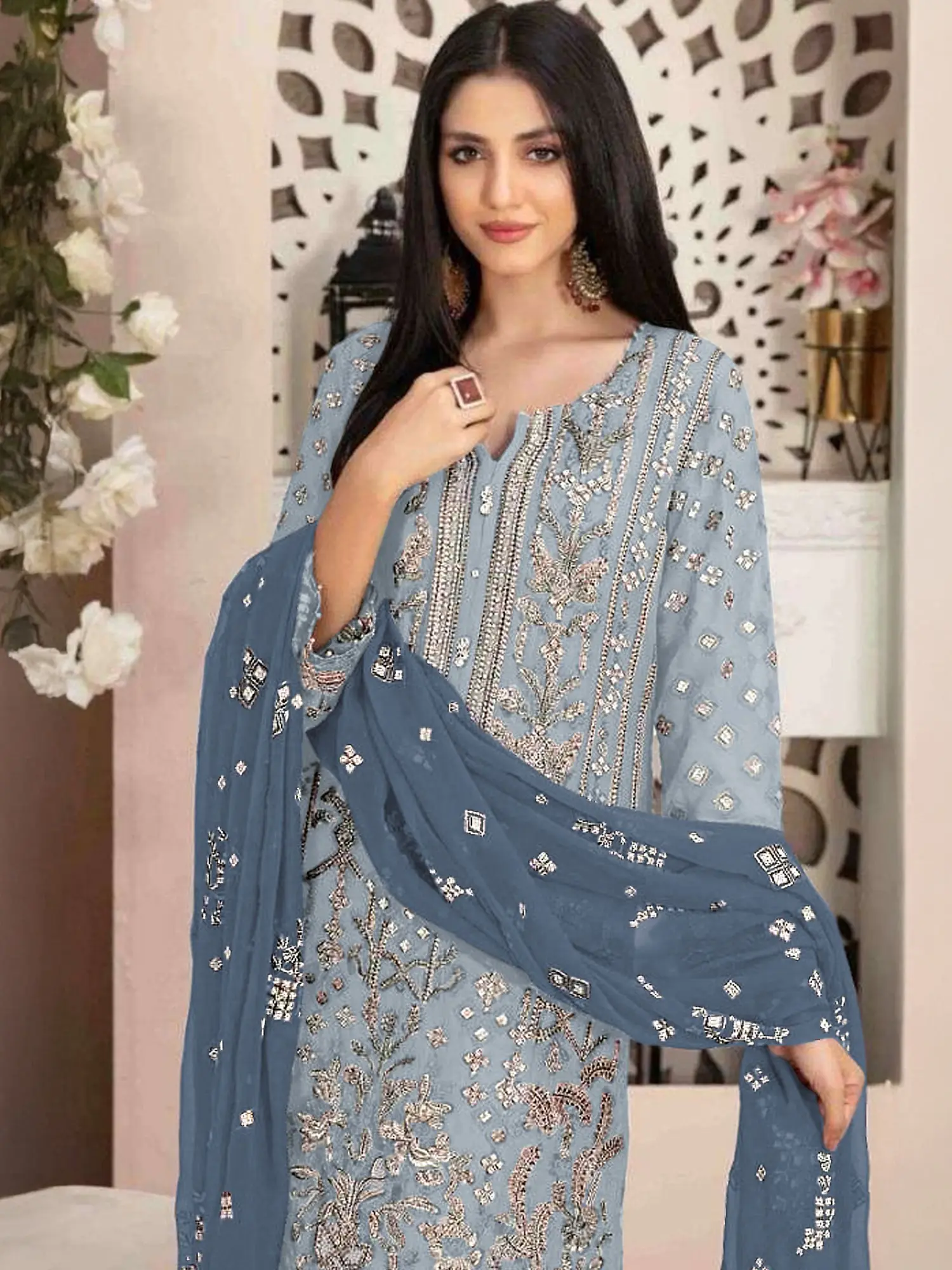 Three-Piece Salwar Kameez with Dupatta and Heavy Embroidered Floral Motifs