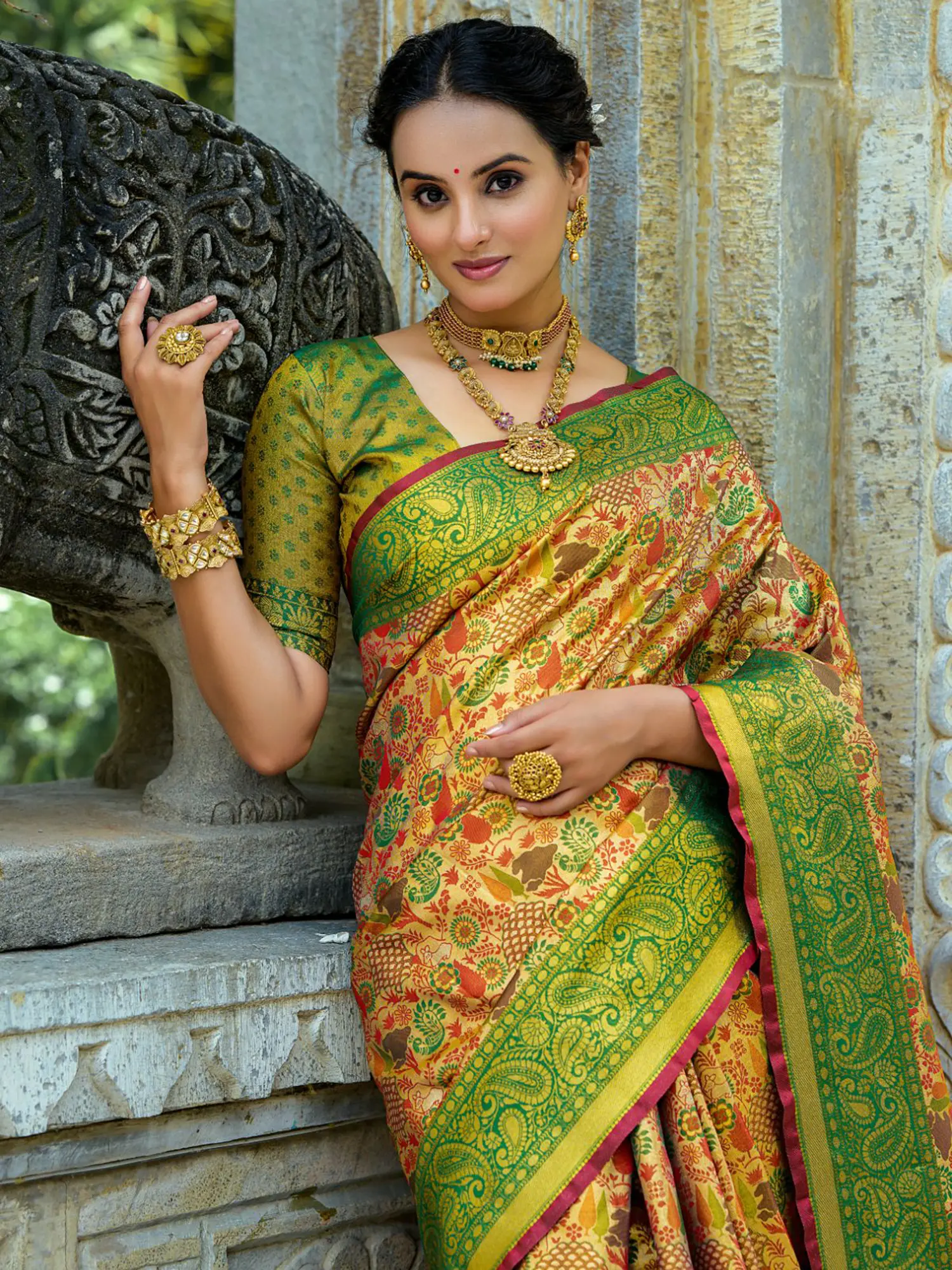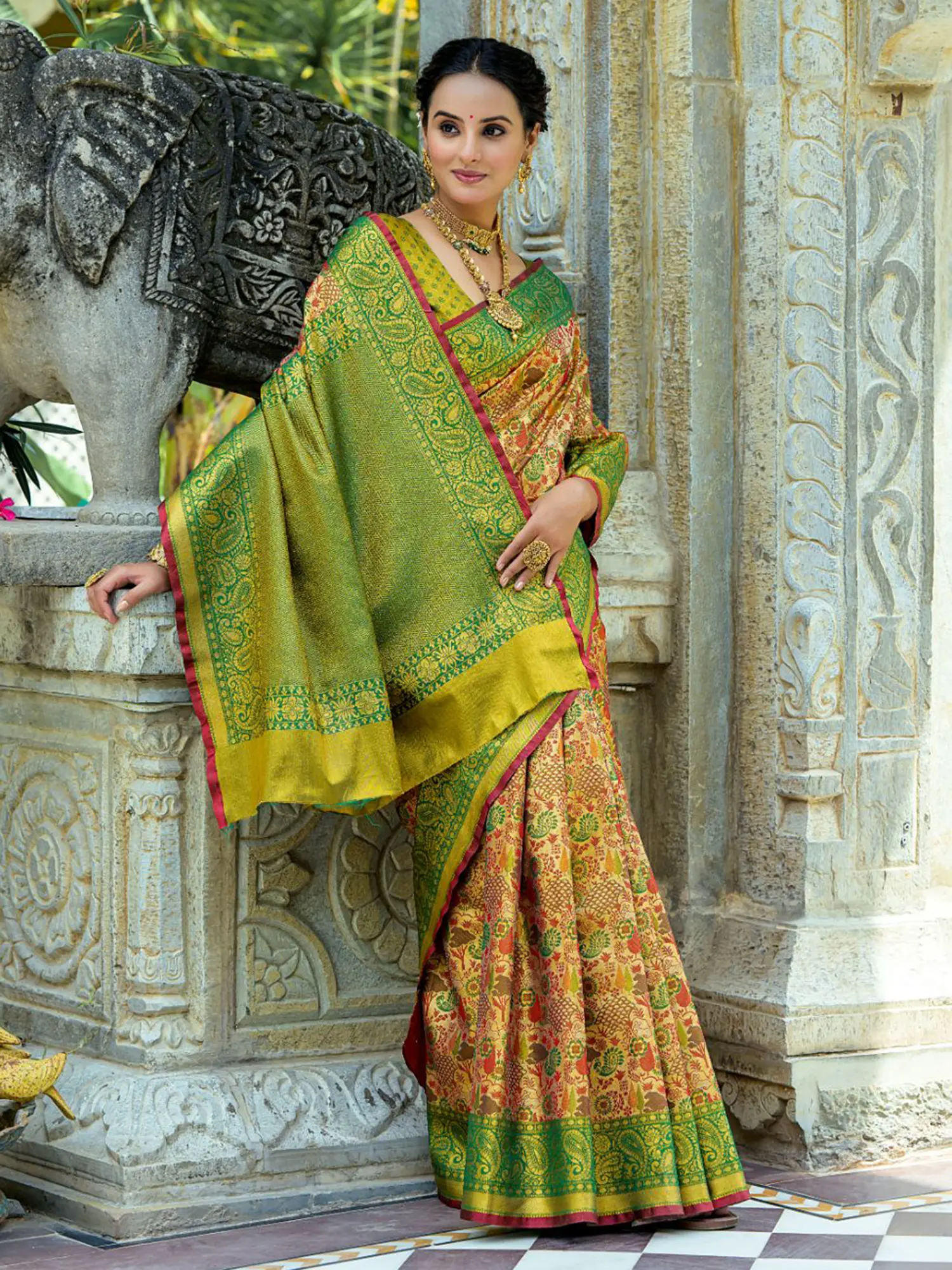 Moonlight-Jade Floral Leaf woven Pure Silk Saree and Golden Thread work Border with Paisley Motifs from Bangalore