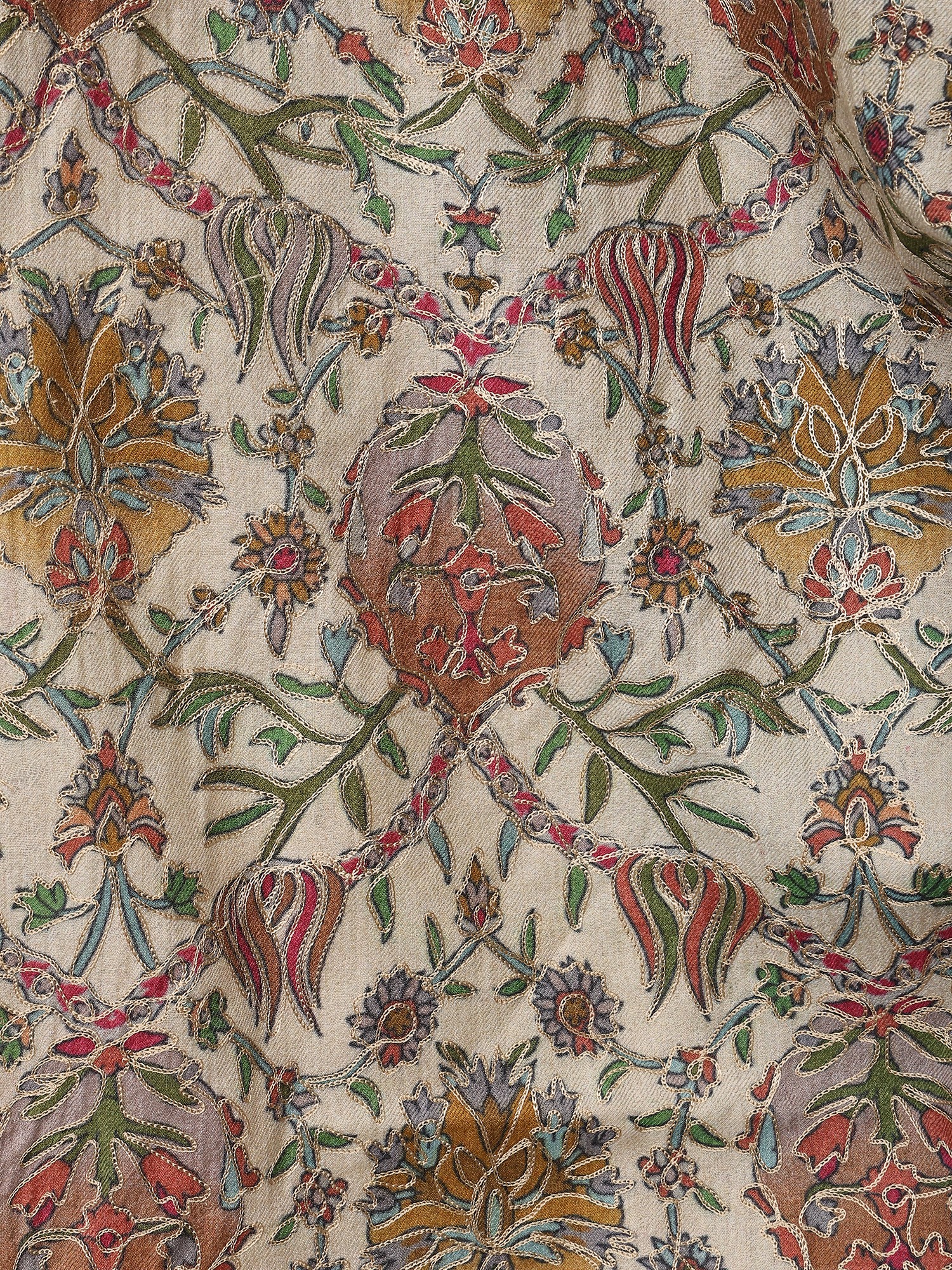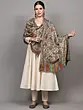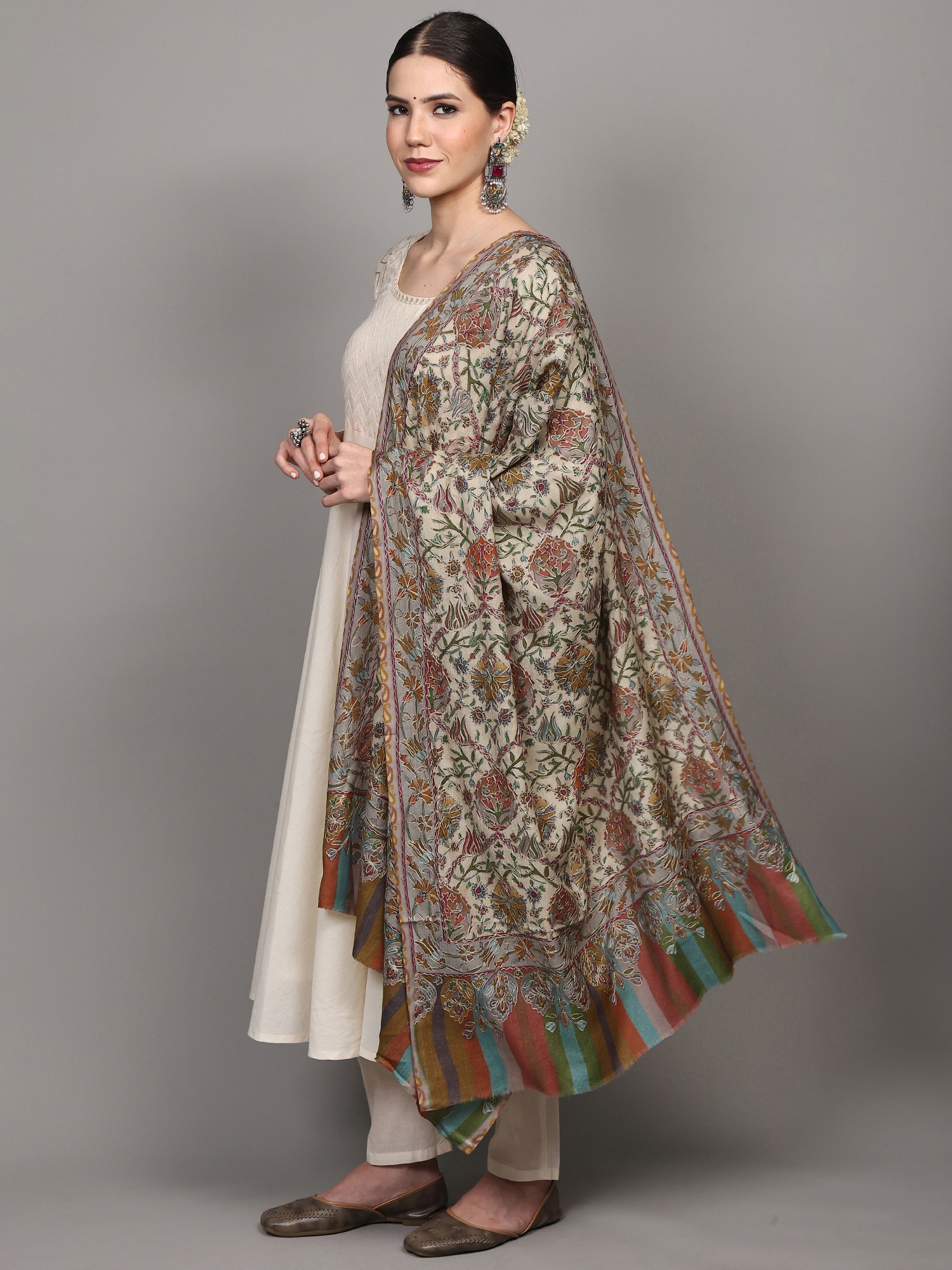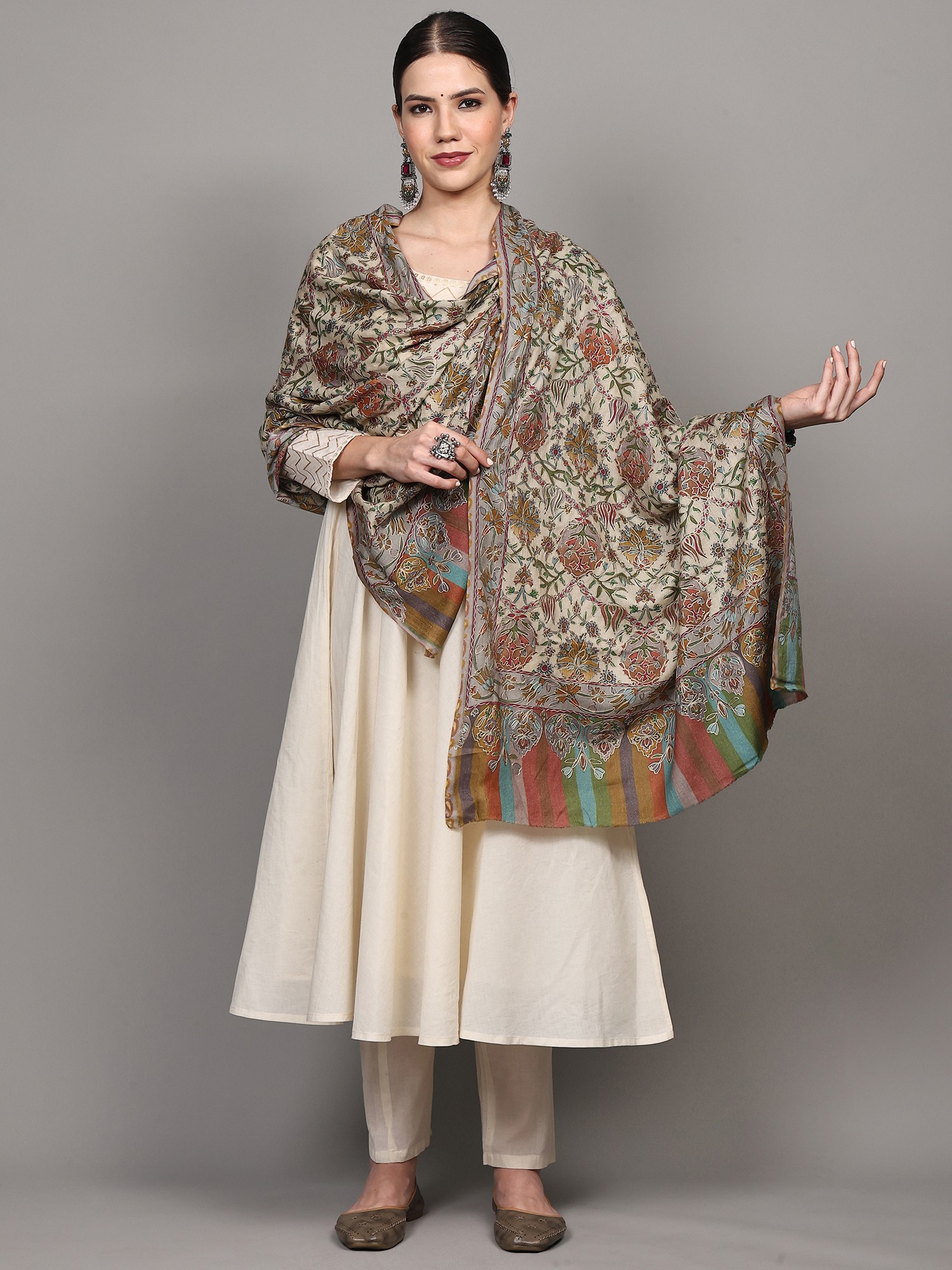 Light-Taupe Kalamkari Embroidered Shawl with Multicolor Paisleys-Flowers Motifs from Amritsar