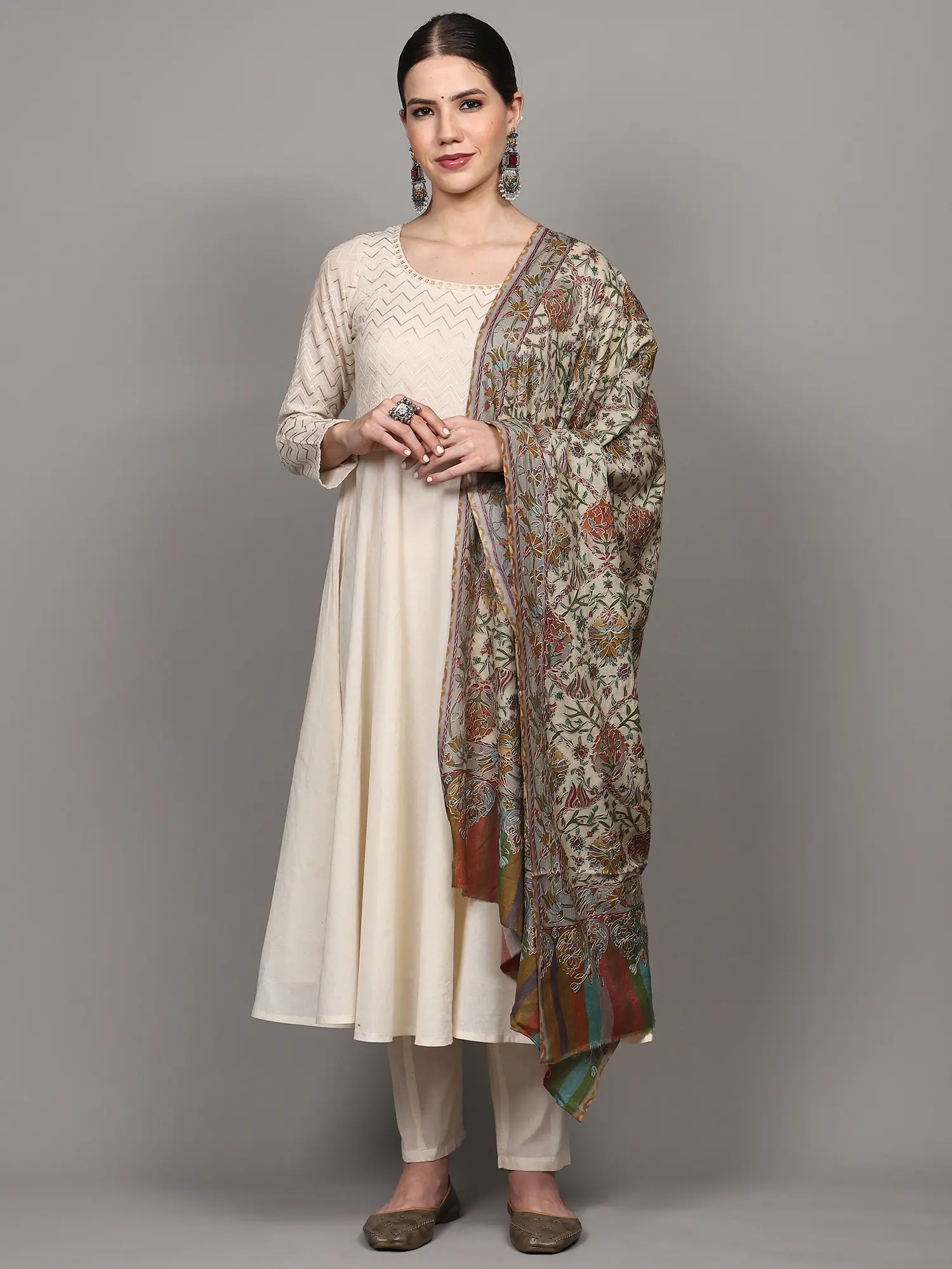 Snow-White Aari Embroidered Kalamkari Shawl with Printed Flowers and Paisleys Motifs from Amritsar