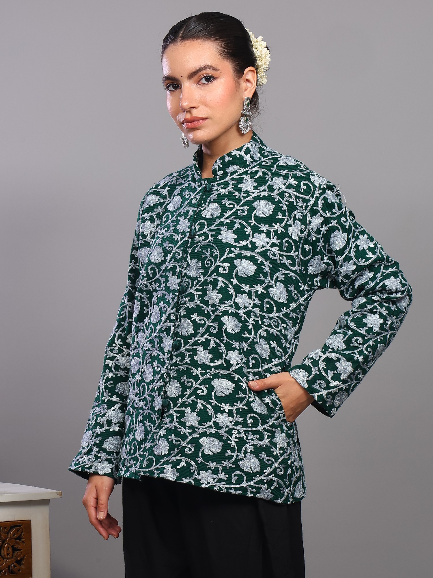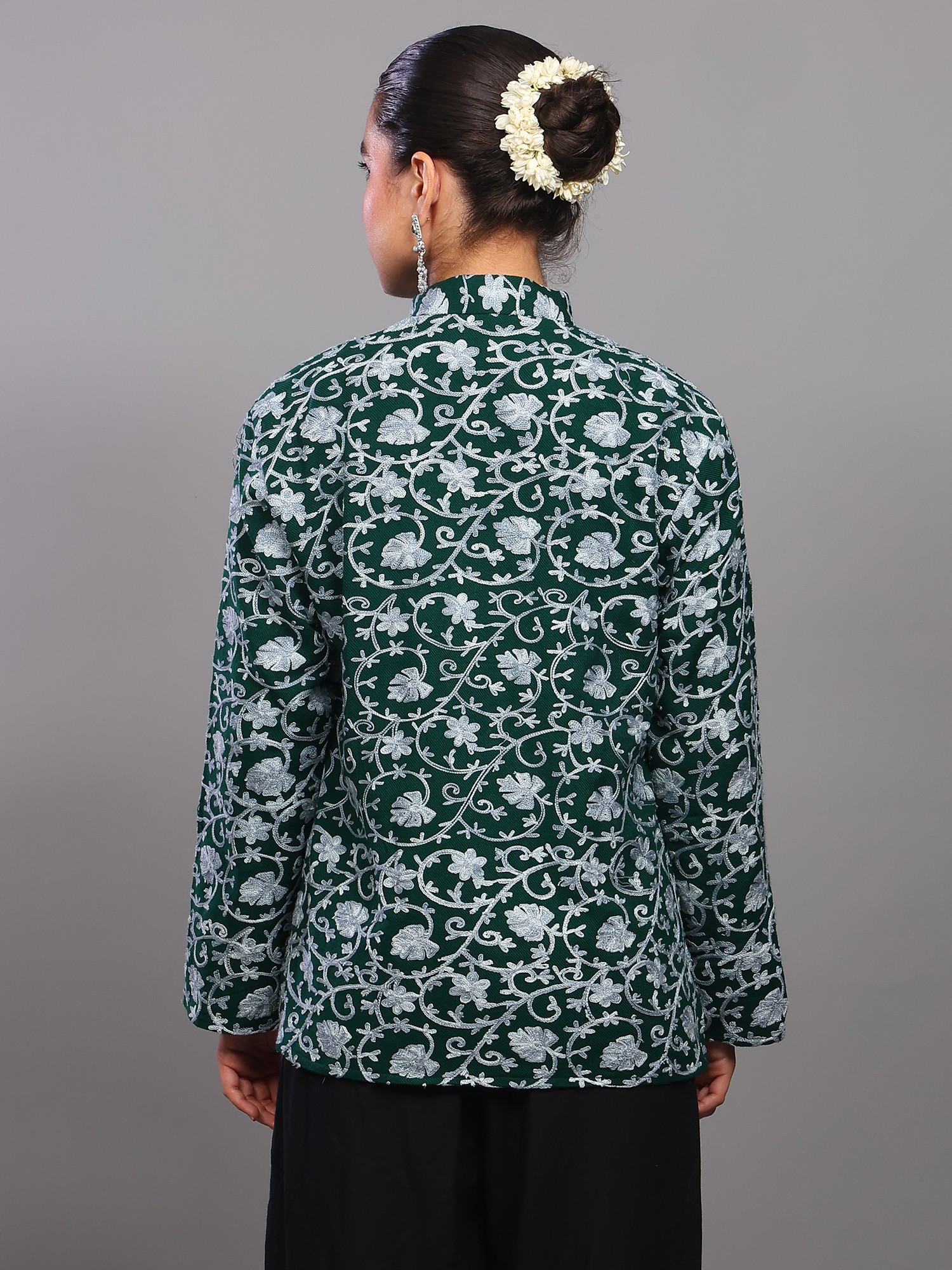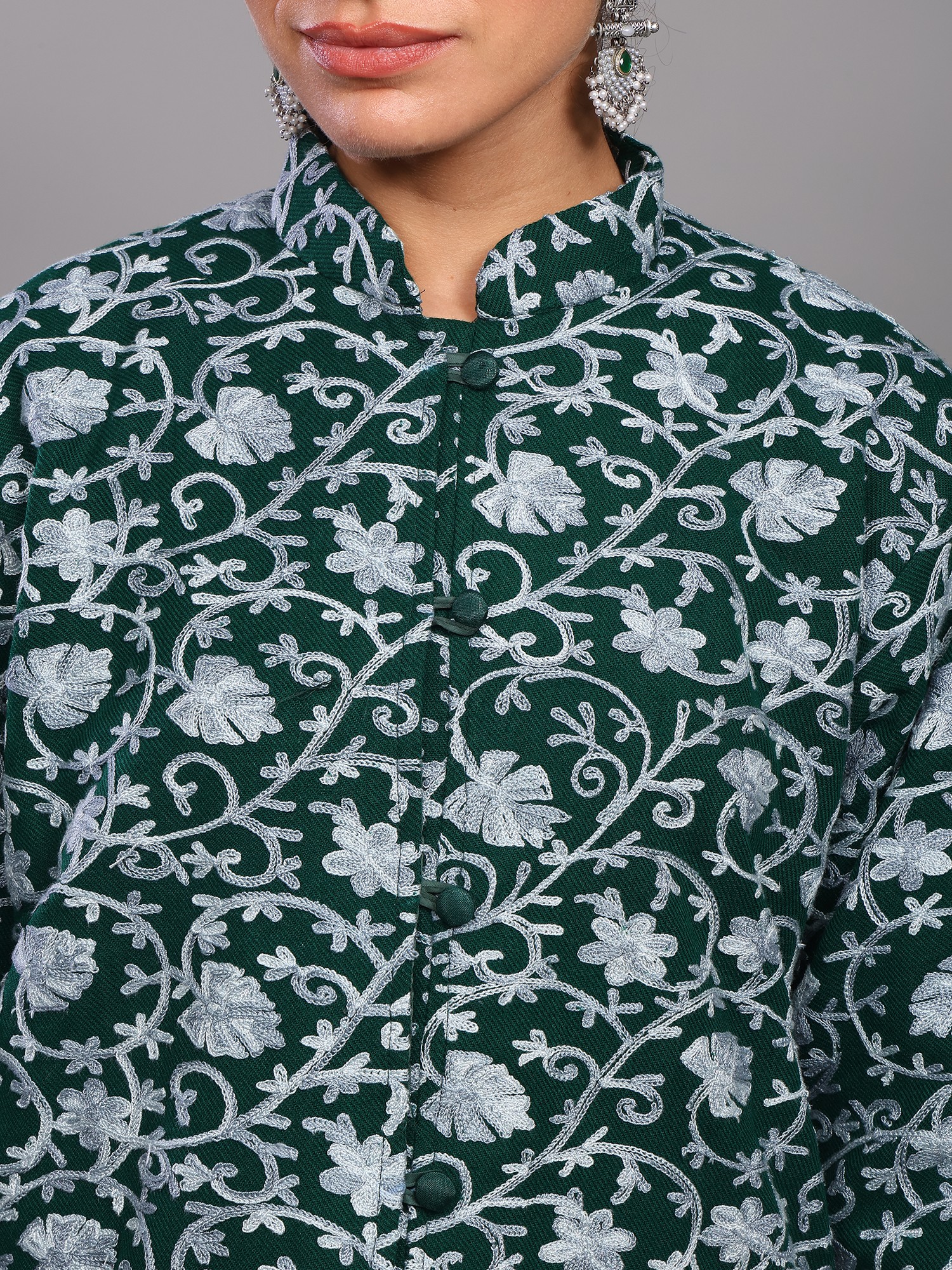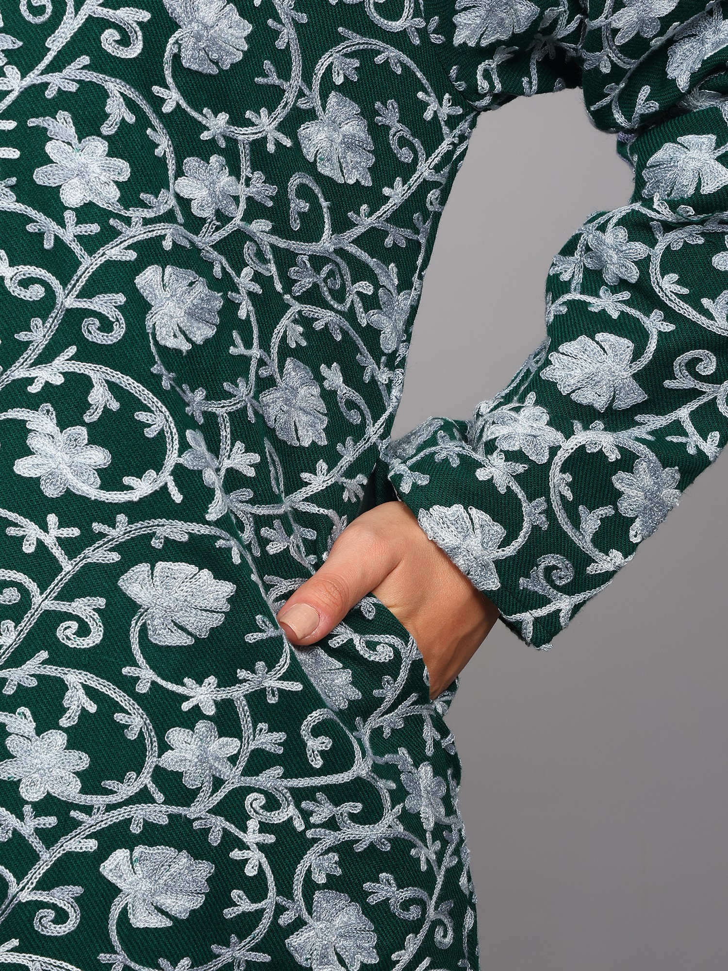 Deep-Green Pure Wool Long Jacket With Multicolor Floral Motif Hand Aari-Embroidery from Kashmir