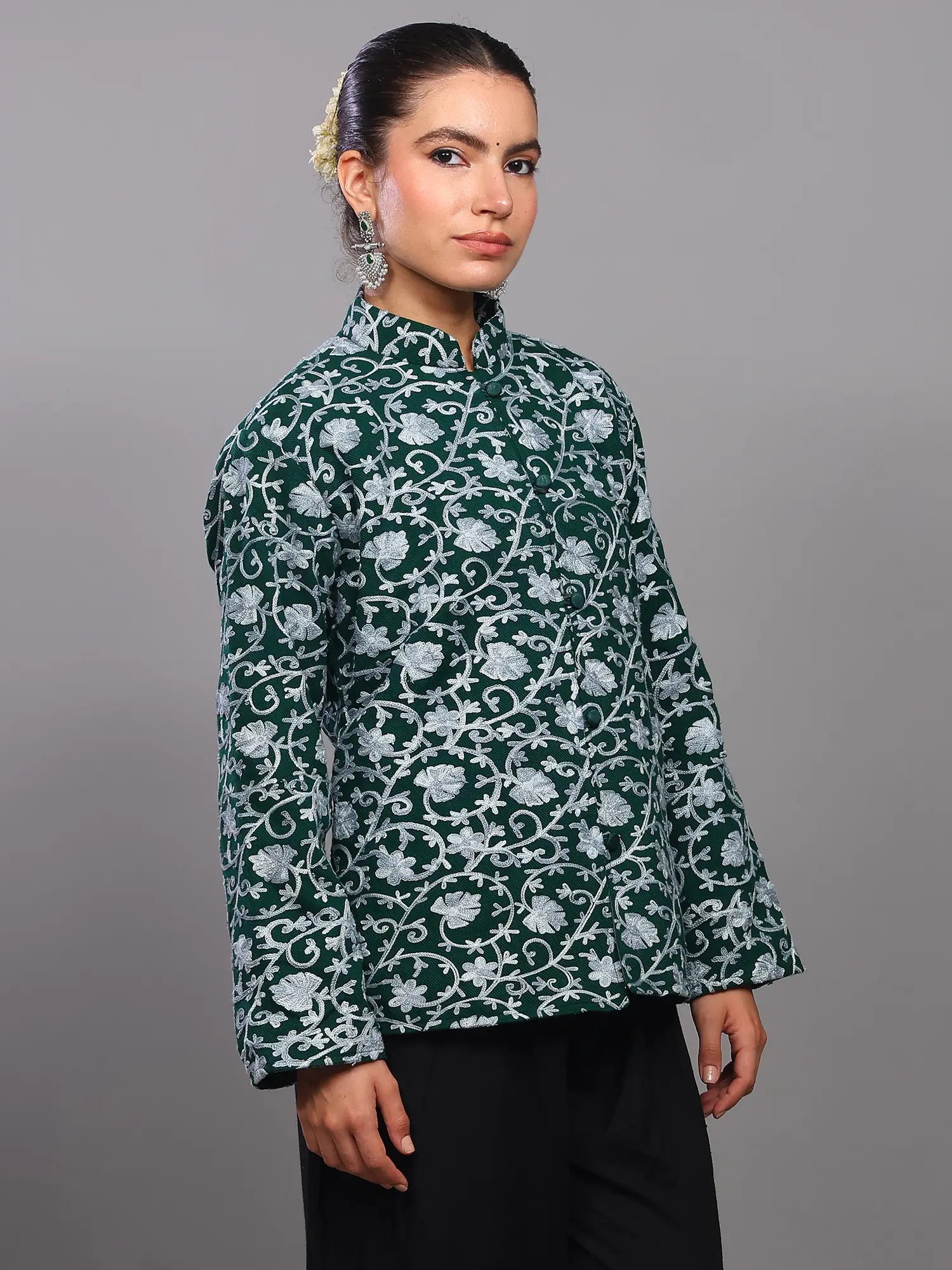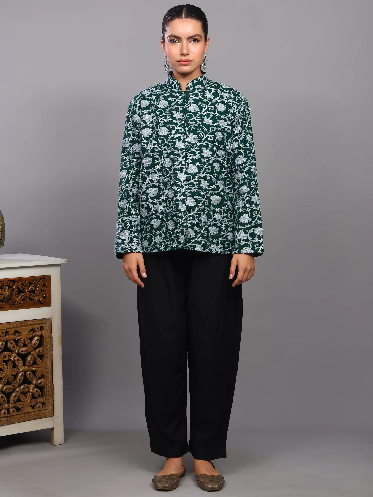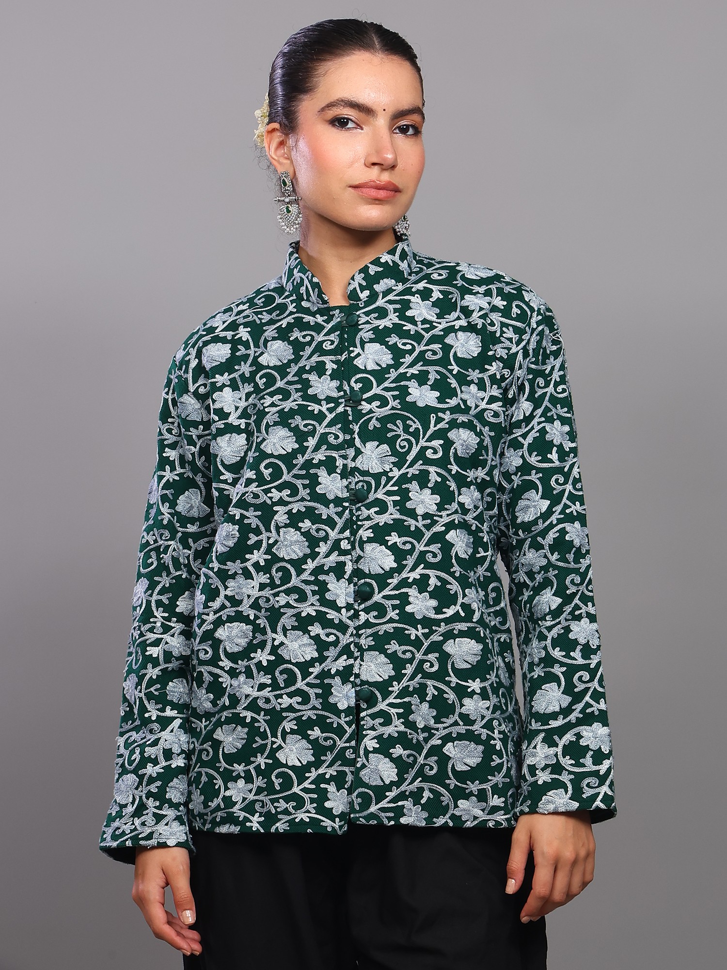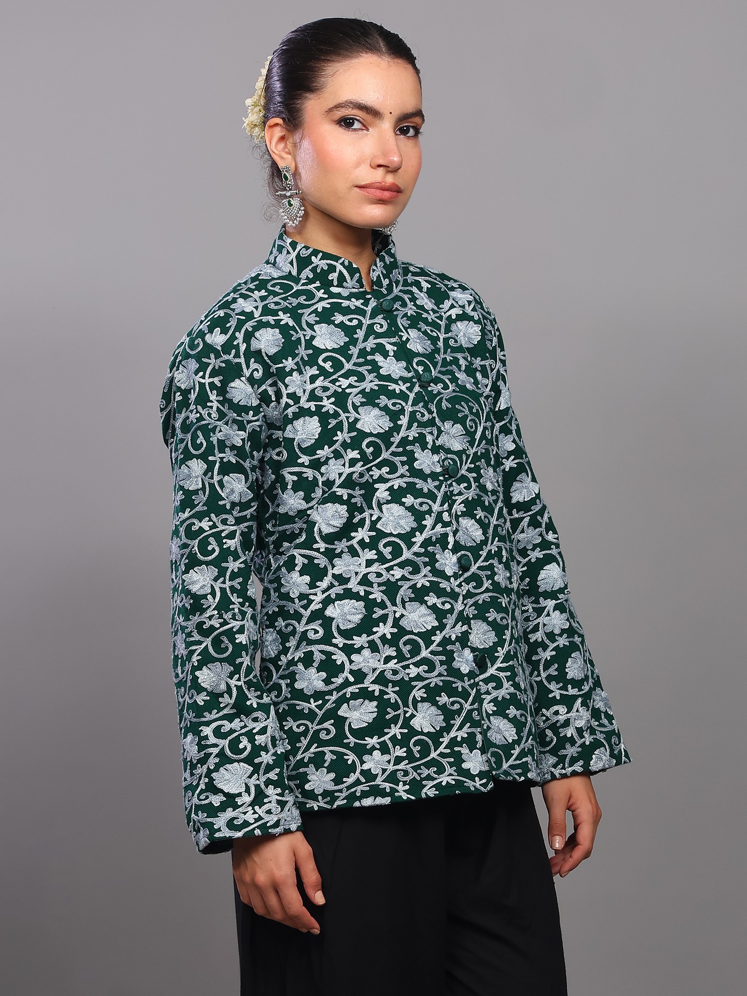 Deep-Green Pure Wool Long Jacket With Multicolor Floral Motif Hand Aari-Embroidery from Kashmir