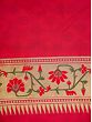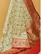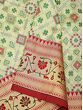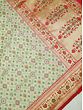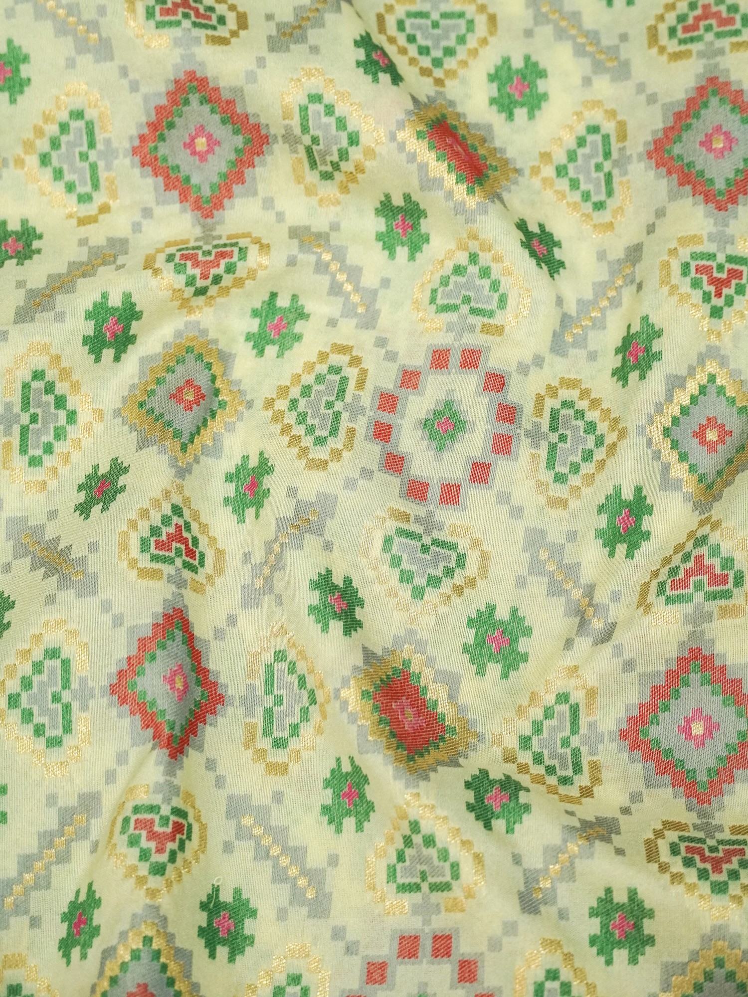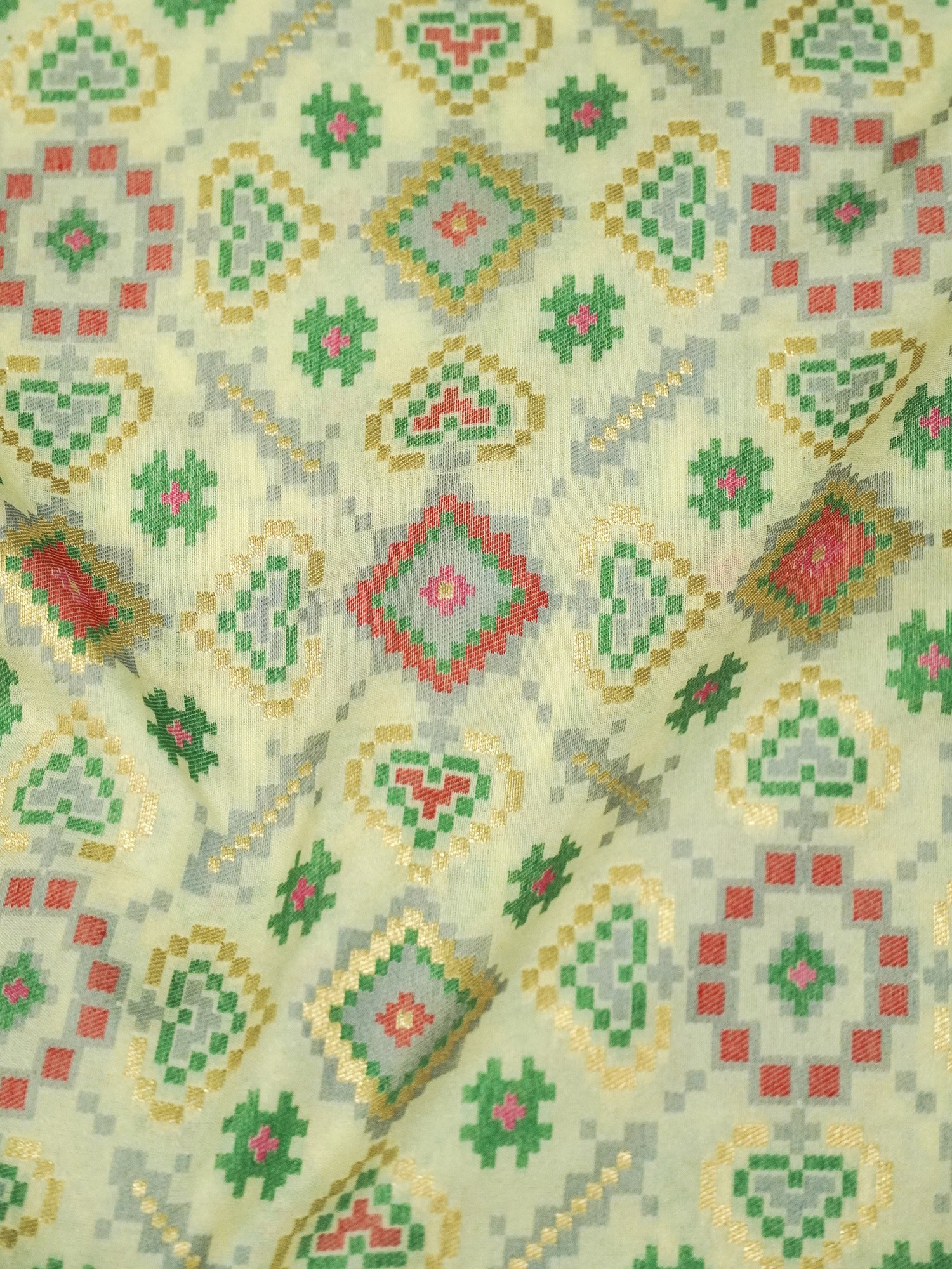 Quench your thirst for perfect traditional Indian women's wear, with the sweetness of this Ambrosia Patan Patola Katan silk Banarasi sari a matchless ensemble in which traditional and chic tastes meet. Patan Patola silk from Gujarat displays the beauty of ethnic Gujarati embroidery, with the use of Gujarati motifs on the muted field of the sari. Lovely Resham or silk threads are picked by the weavers to add stunning details to the sari. A splash of color comes with the bold border and pallu of the sari where lotus-vine and lotus pots add the opulence and auspiciousness of the Padma (lotus) pattern to the composition.