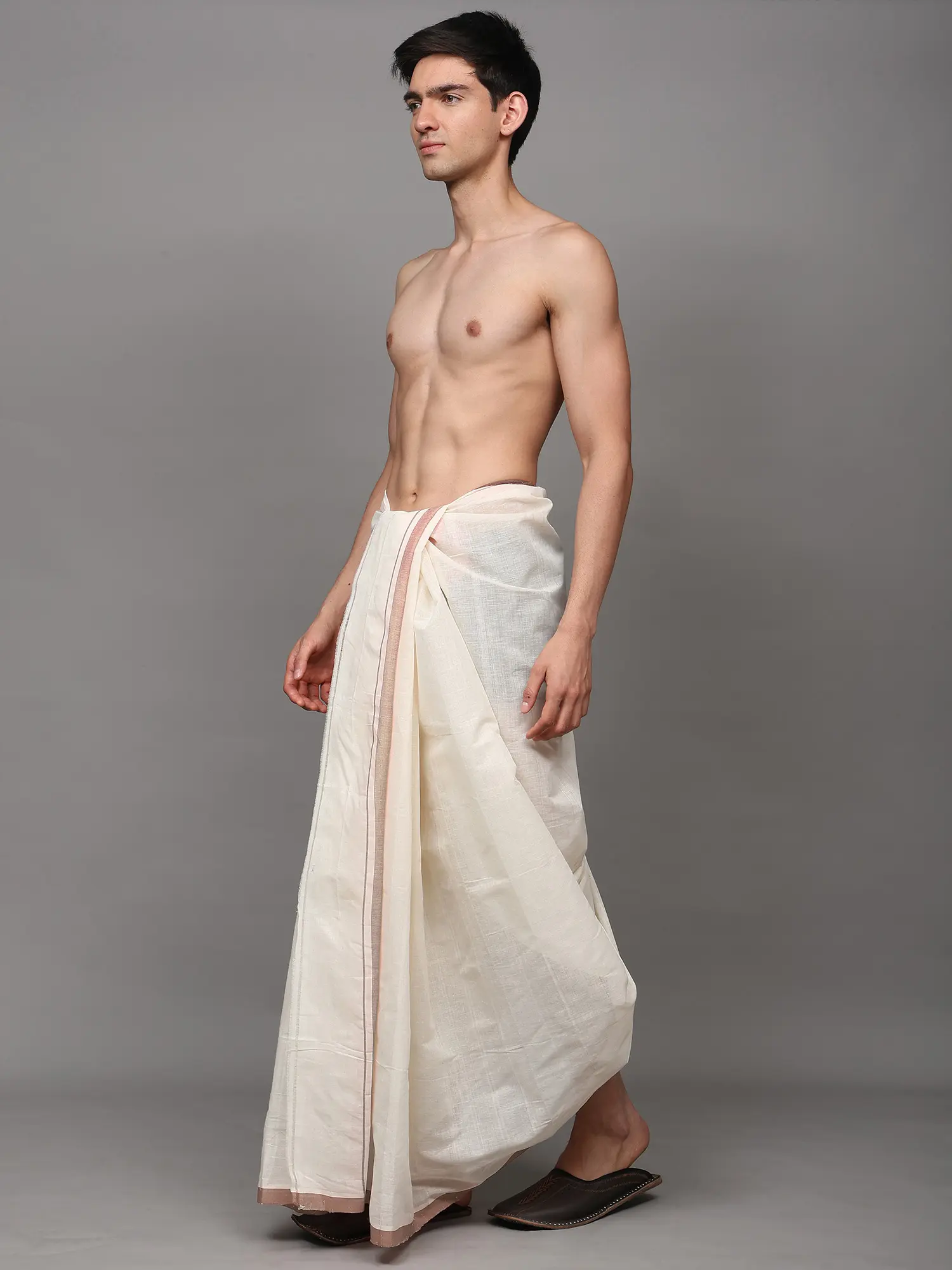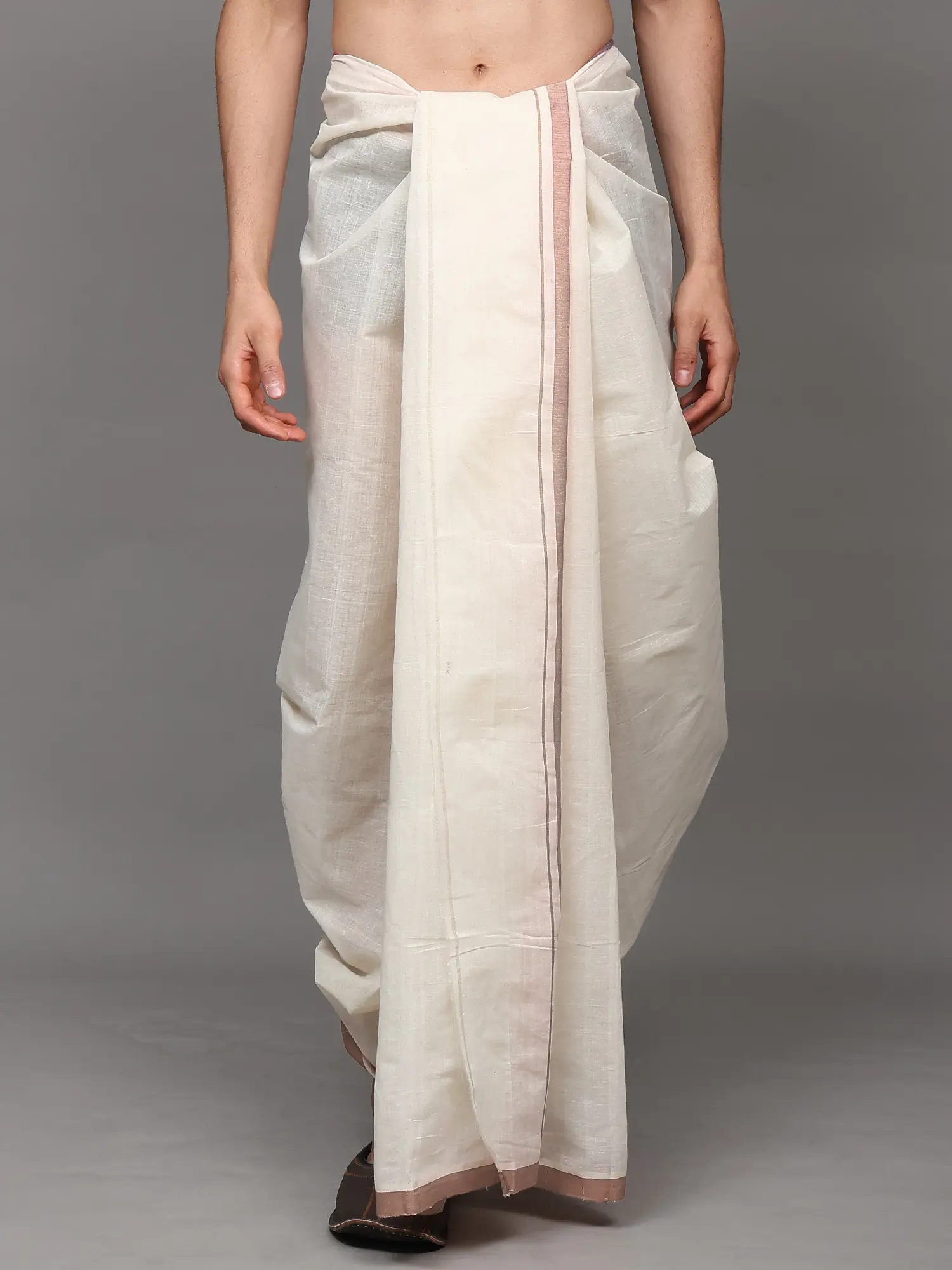 Toasted-Almond Pure Silk Handloom Drape Dhoti with Copper Colored Thread work Border