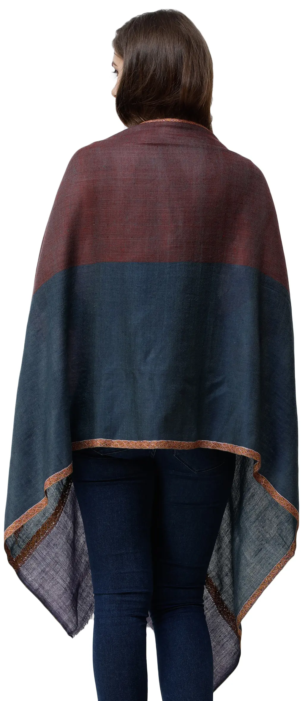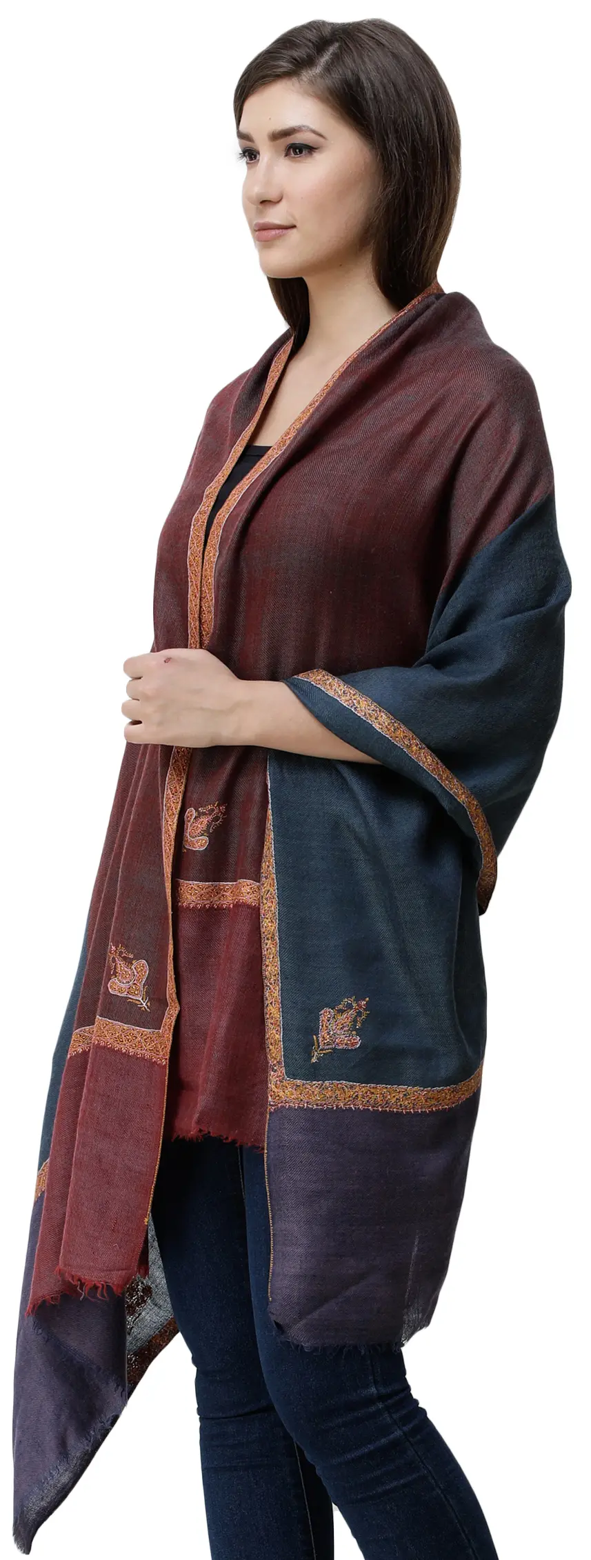 Affogato Pashmina Shawl from Kashmir with Heavy Sozni Embroidered Paisley and Flowers