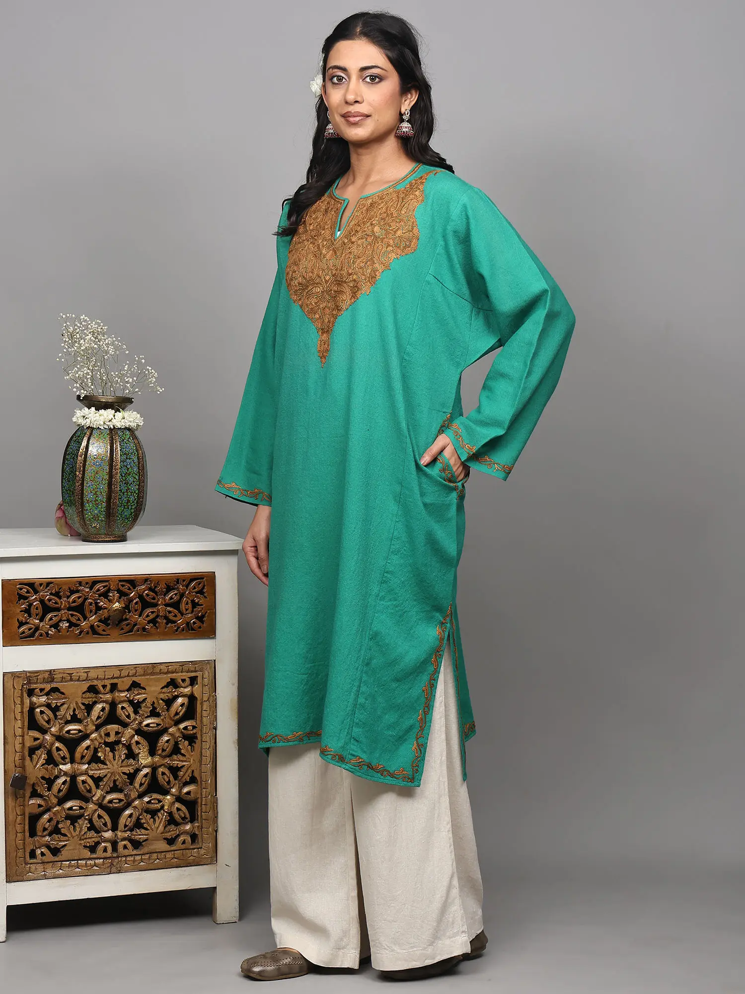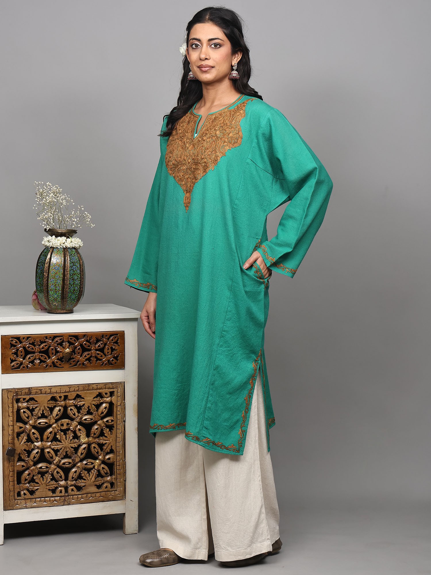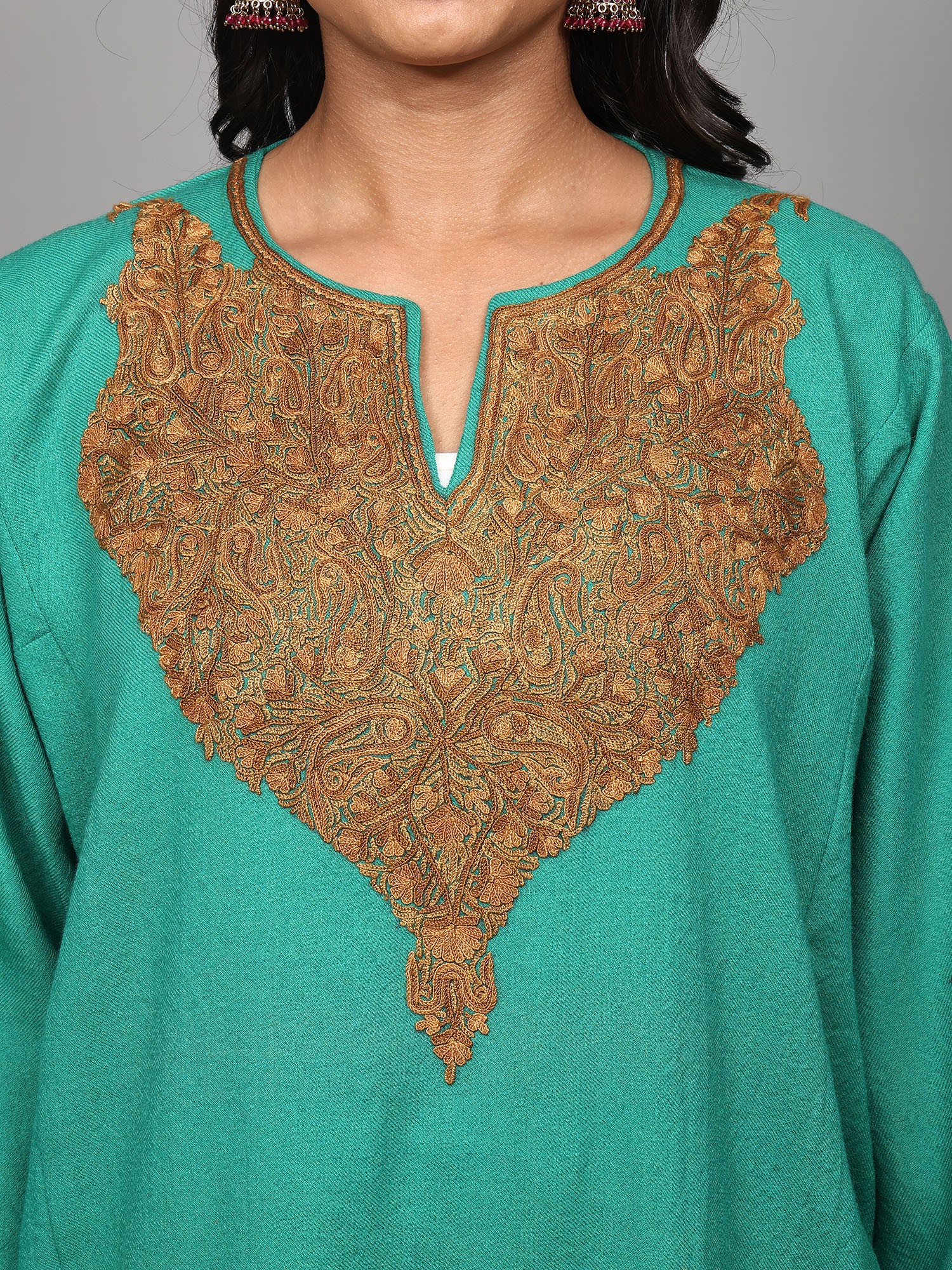 Wool Kashmiri Phiran with Aari Embroidered Paisleys on Neck and Side Pockets