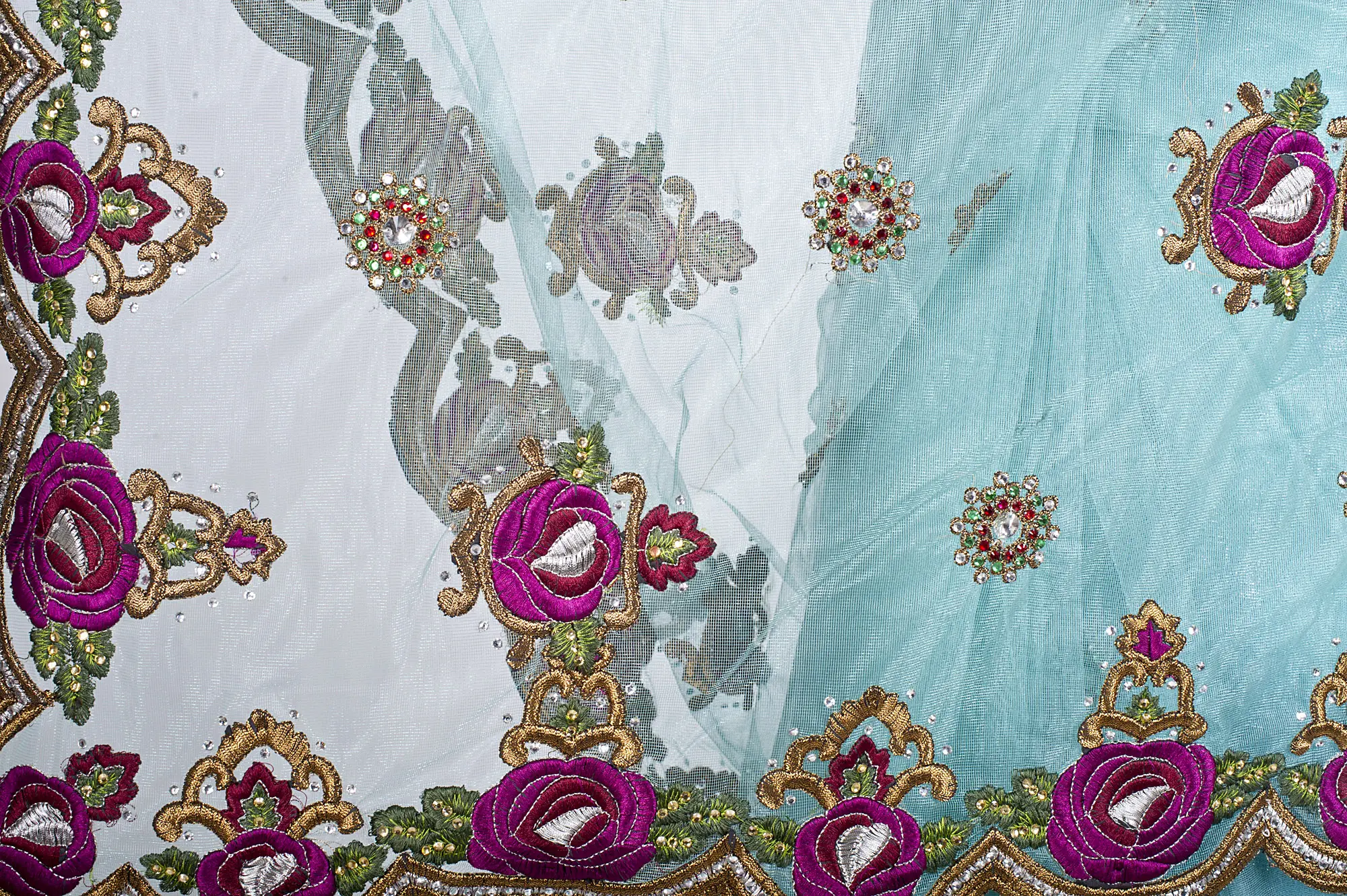 This sari is more than just an outfit; it's a statement of refined taste and an ode to timeless beauty. The delicate interplay of the sky-blue net, the vivid floral embroidery, and the subtle shimmer of metallic threads creates a piece that is perfect for special occasions, weddings, festivals, or any event where you want to make an unforgettable impression. The carefully crafted border, with its scalloped edges and dense floral patterns, frames the sari exquisitely, drawing the eye and highlighting the extraordinary detail. ––––––––––––––––––