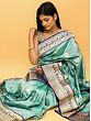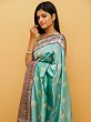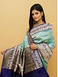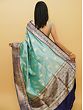 Birds in Indian culture hold great symbolic meaning and are seen as representatives of moods and stages of life. Made with silken threads in a pleasing blue shade, this pure Khaddi silk Banarasi saree is embellished with the motif of bird pair- a symbol of conjugal bliss and togetherness. The dark blue border of the sari has the presence of embroidered peacocks, which are also related to Sri Krishna, the Hindu god and a universal symbol of divine love along with parrots, the mount of Kamadeva, the god of passion.
