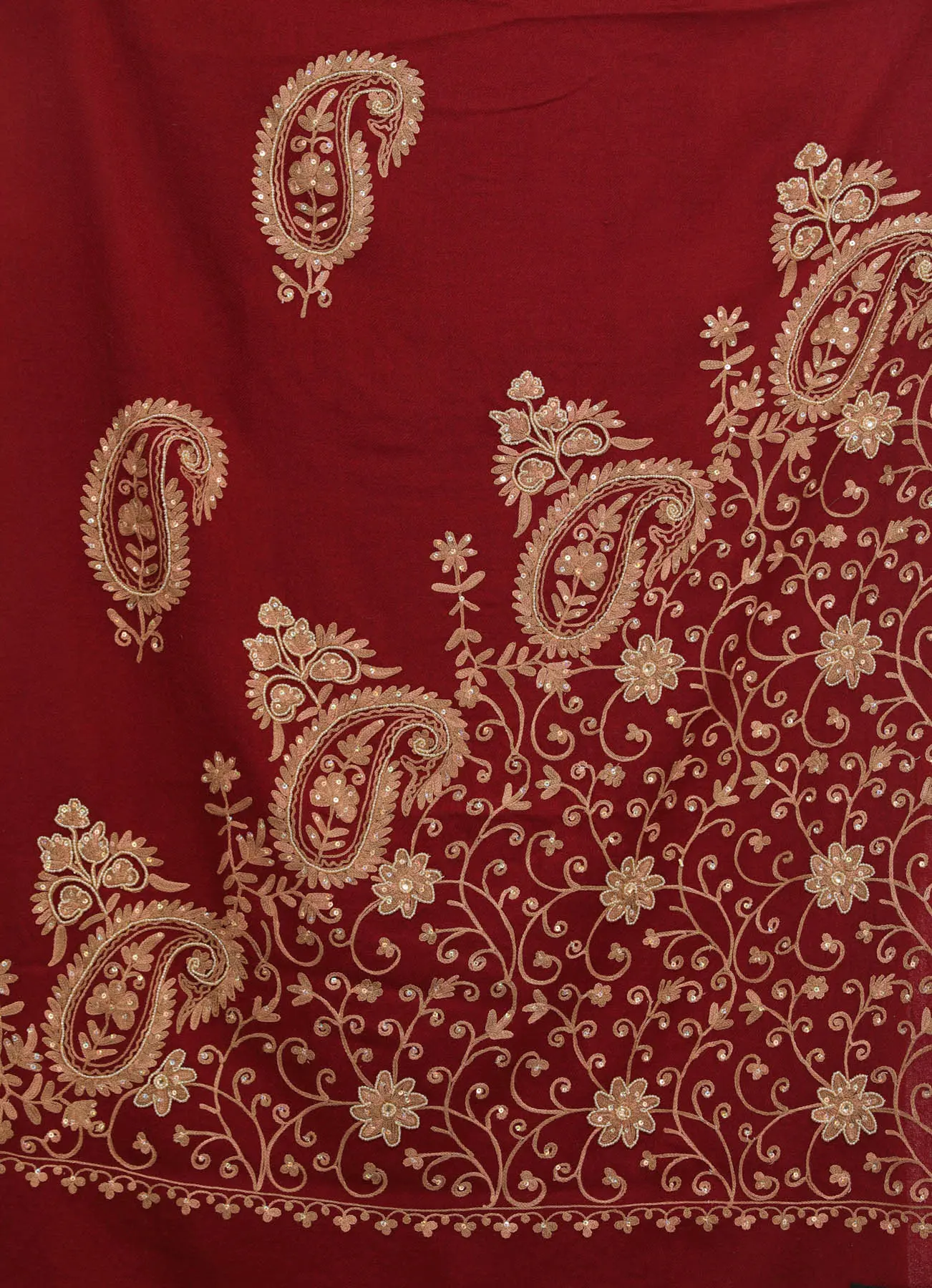 Originating from Amritsar, a city renowned for its heritage of textile craftsmanship, this pure wool stole embodies a legacy of quality and dedication. The choice of pure wool ensures not only comfort and durability but also a natural drape that enhances the beauty of the embroidery. This piece is more than just an accessory; it's an heirloom, a celebration of intricate handiwork and luxurious natural fibers, designed to be cherished for years to come. Add this magnificent stole to your collection and experience the fusion of tradition, luxury, and unparalleled craftsmanship.