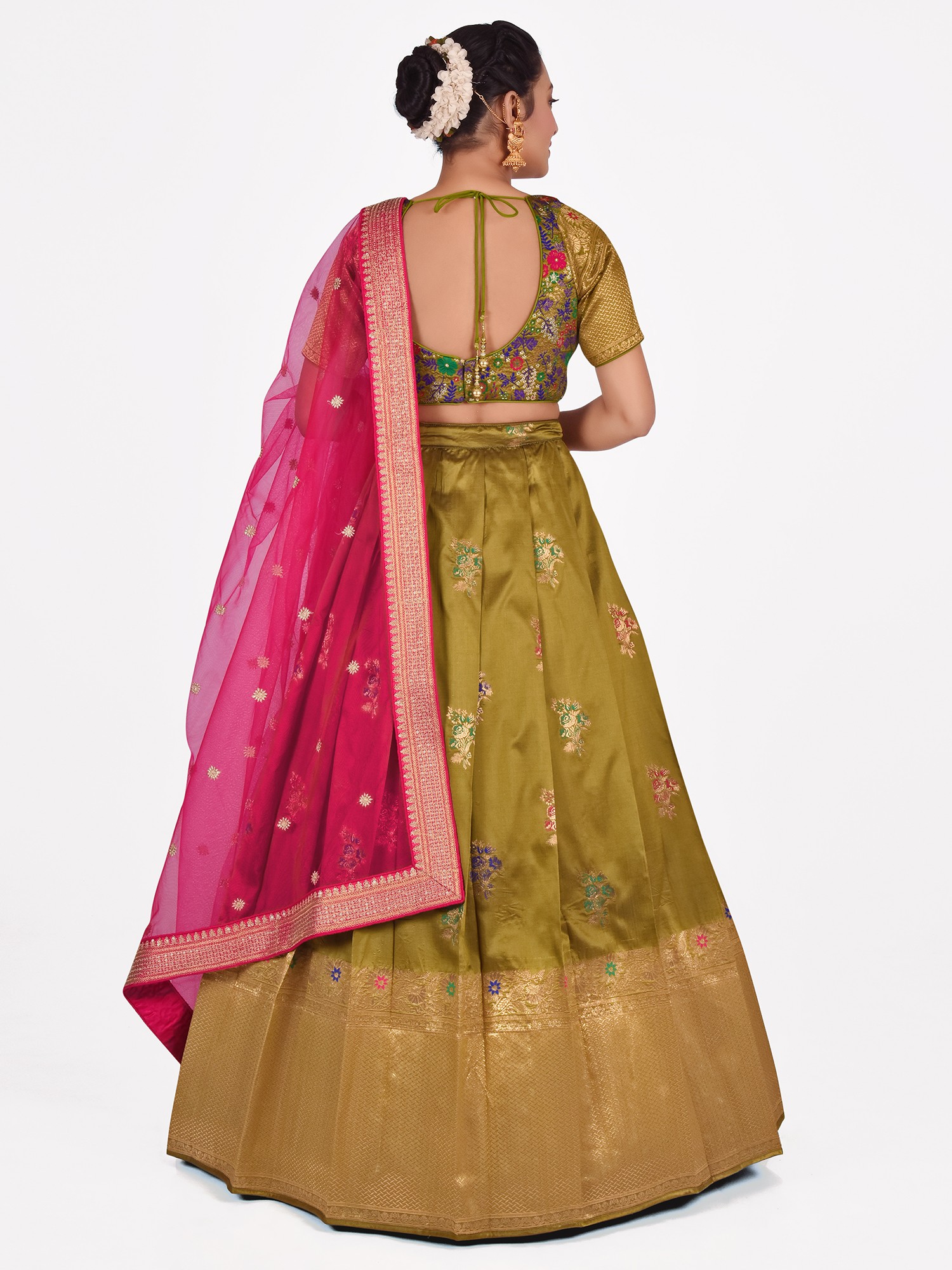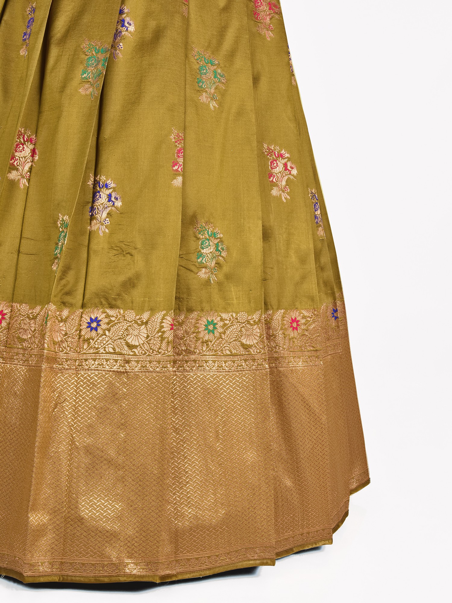 Rama-Green Jacquard Silk Woven Botis Lehenga Choli with Frings Dupatta