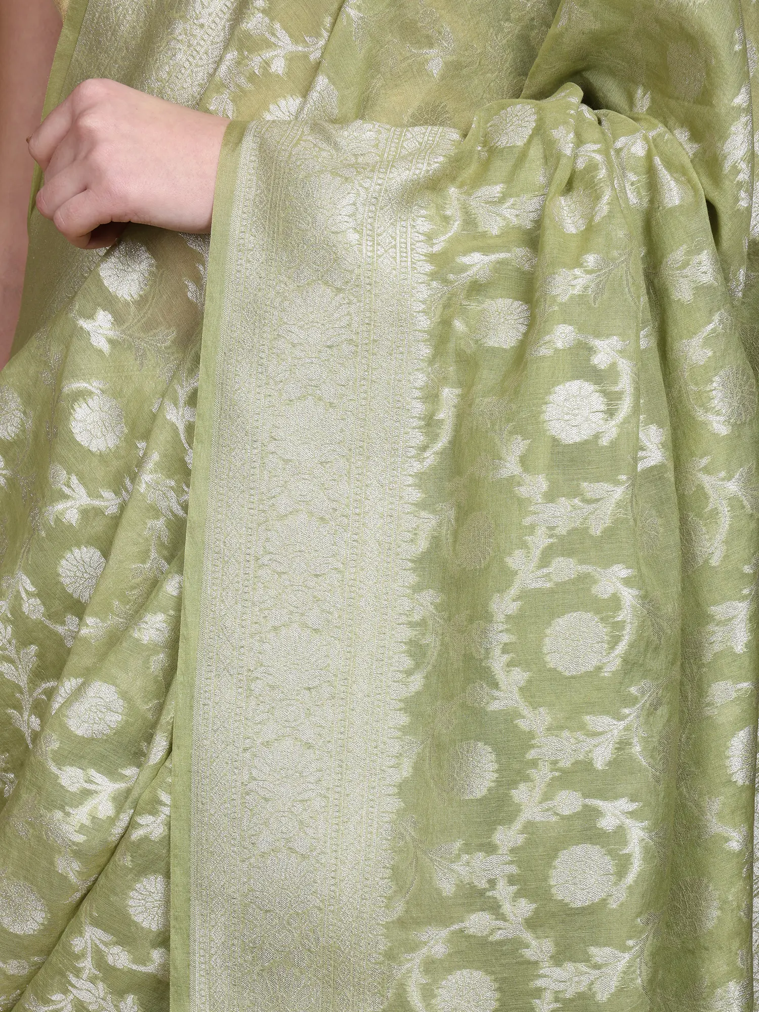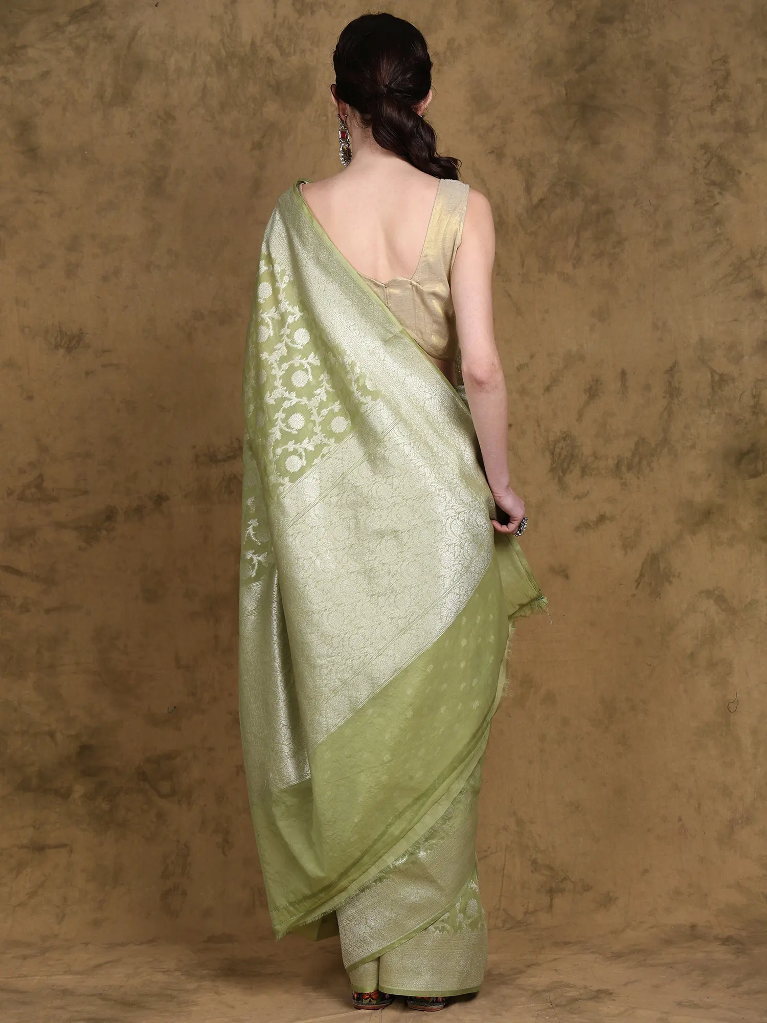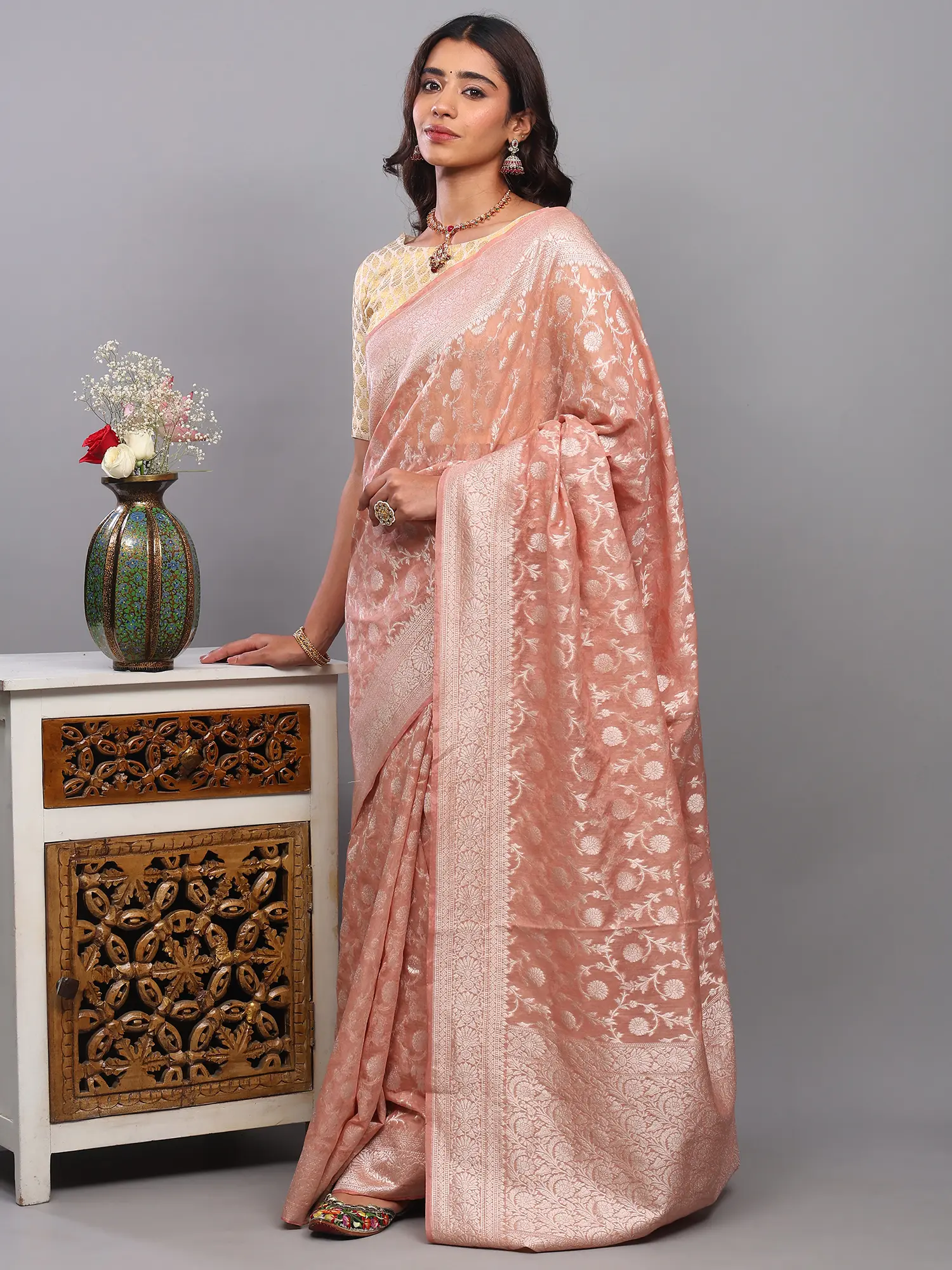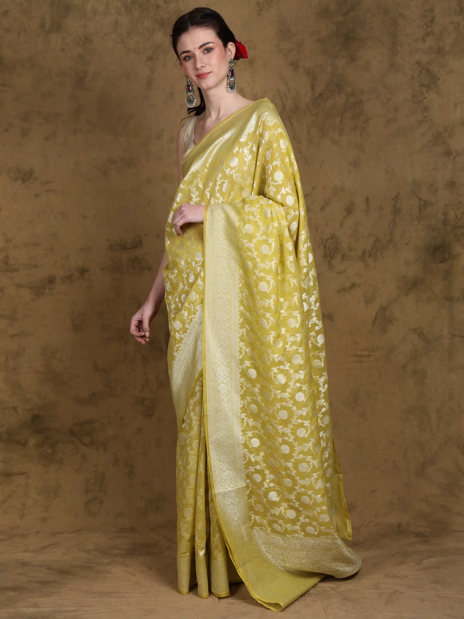 Cloud-Cream Handloom Pure Silk Banarasi Sari with Kadhwa Woven Flowers All-over