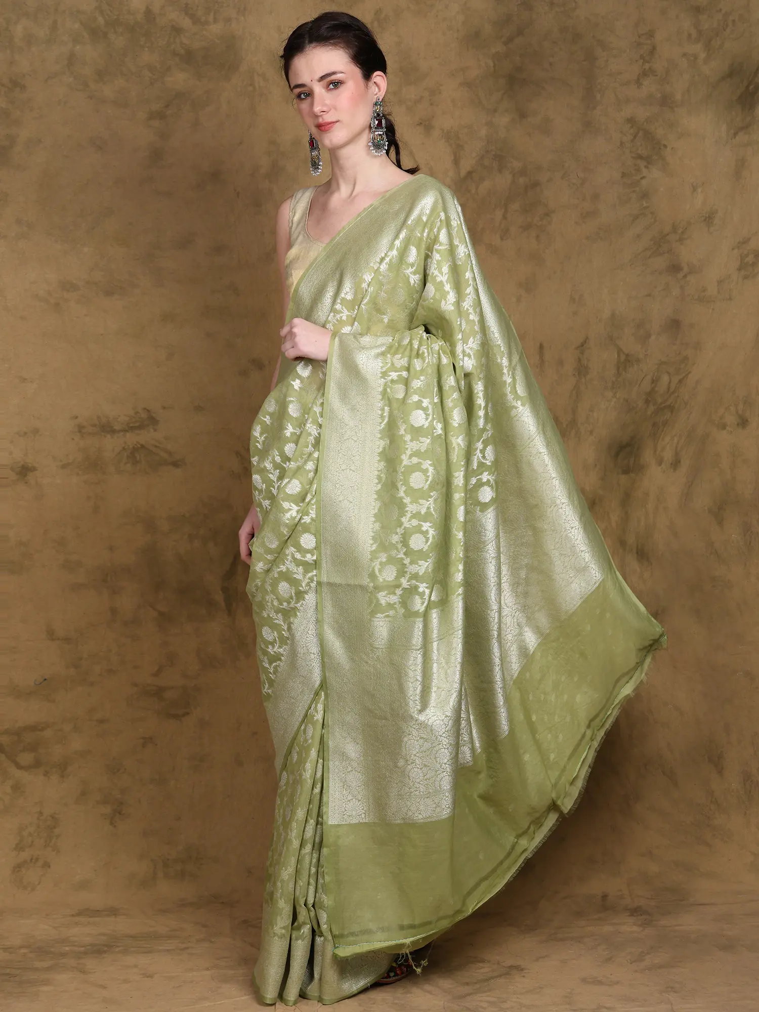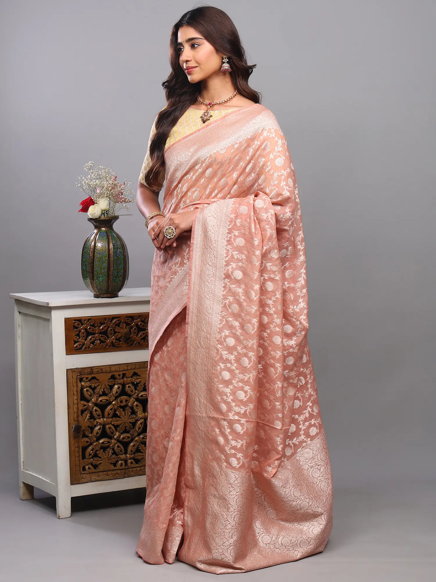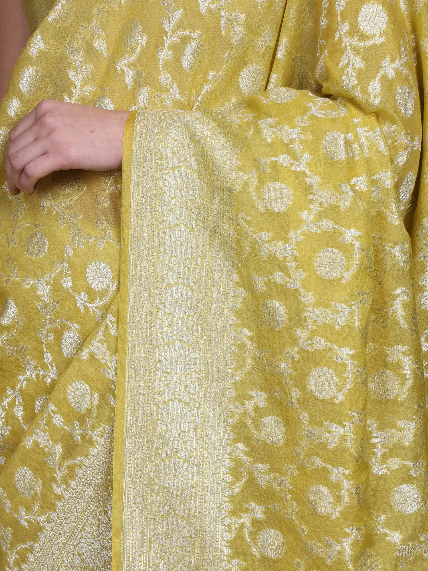 Banarasi Saree with All-over Zari Woven Bootis and Floral Vine Contrast Border-Pallu