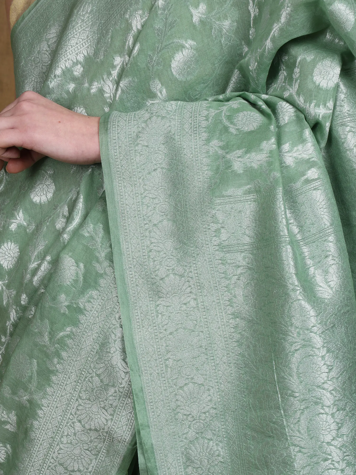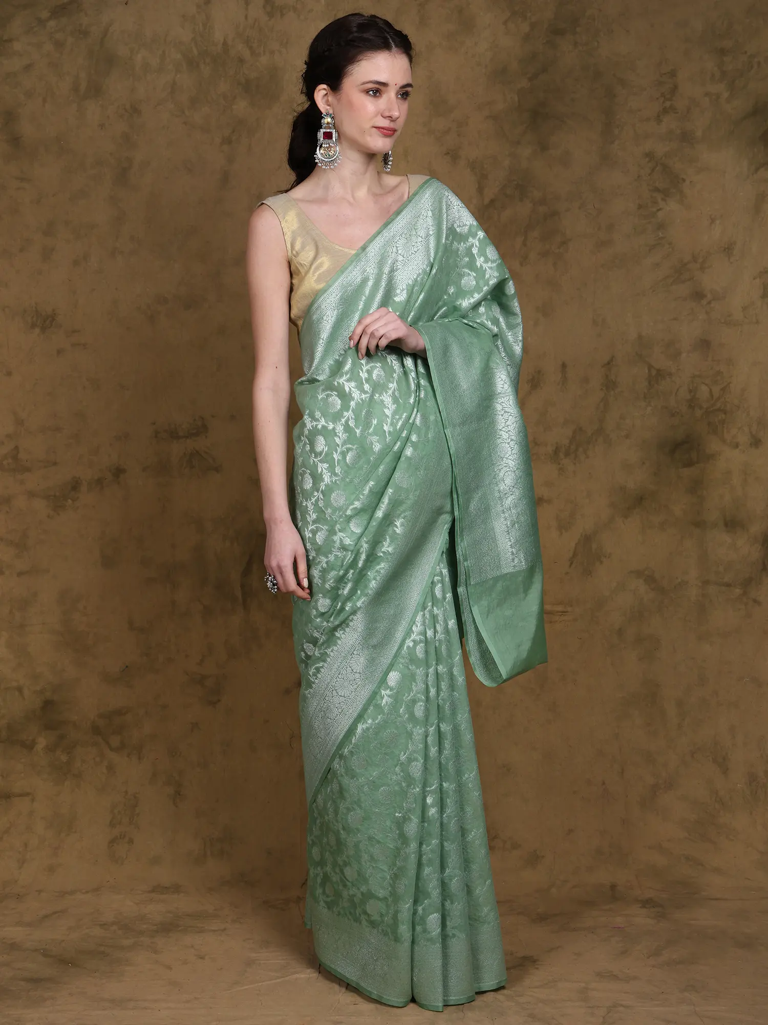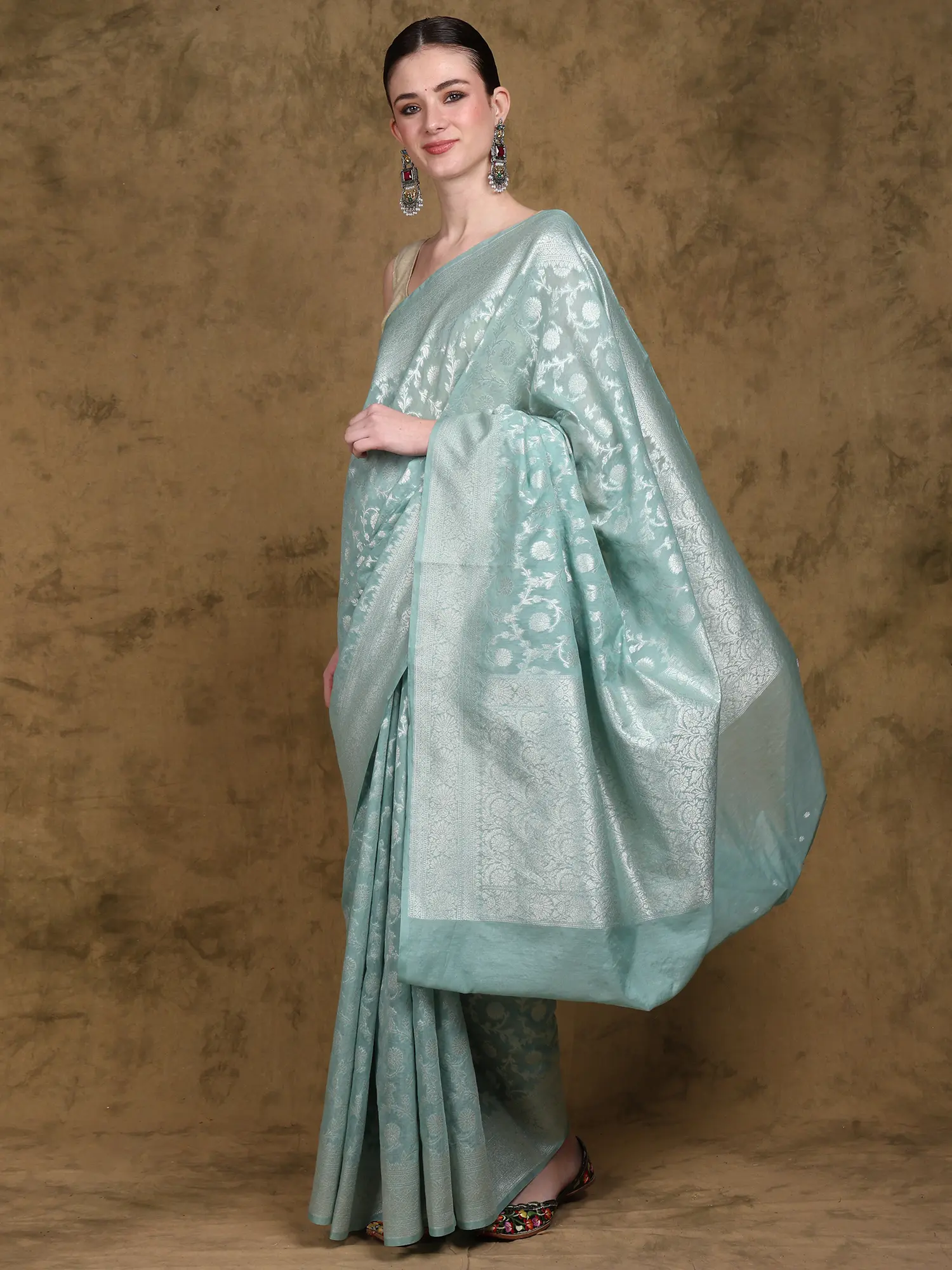 Beach-Glass Pure Silk Banarasi Saree with Zari Brocaded Floral Butta and Paisley Border