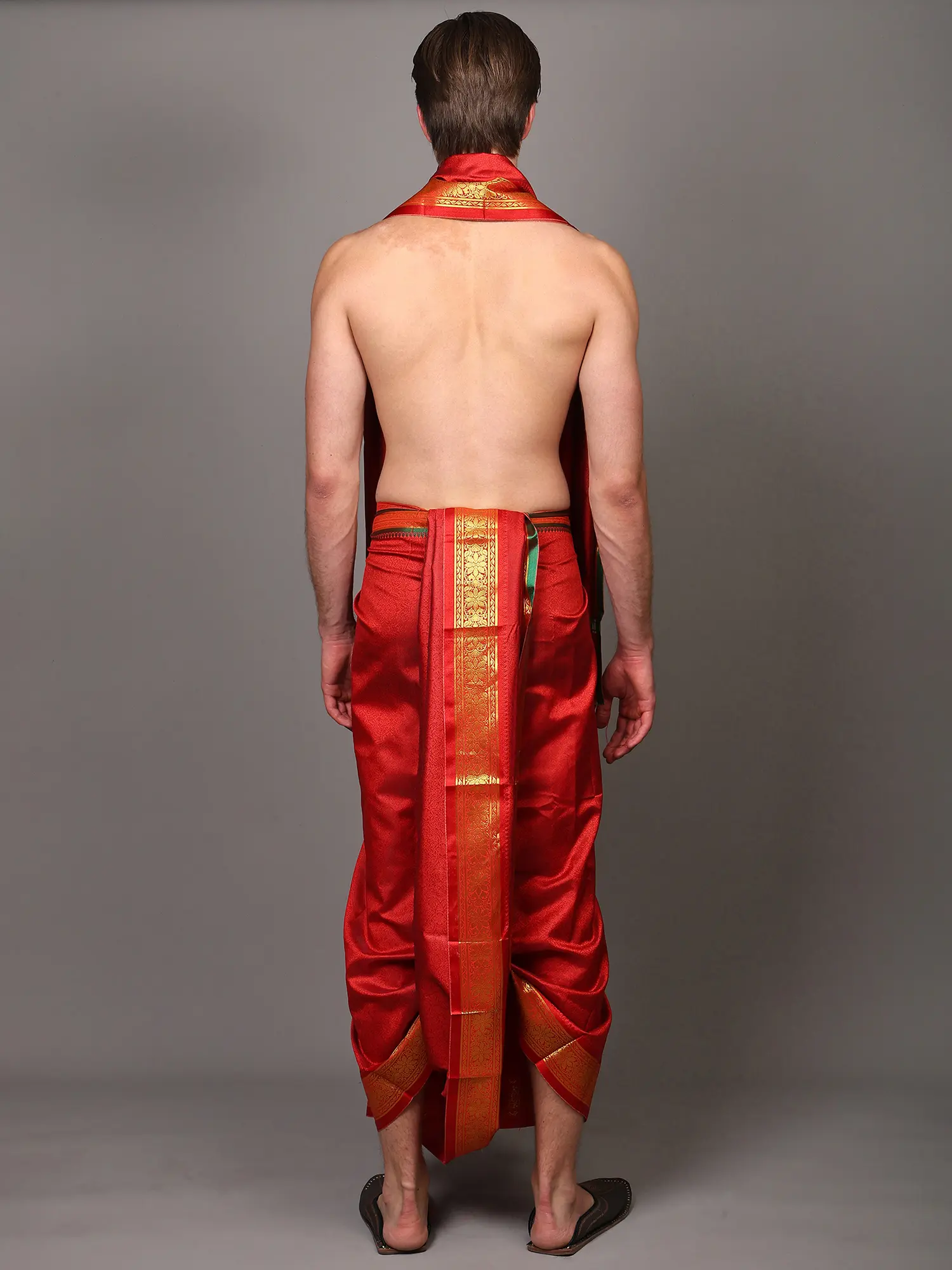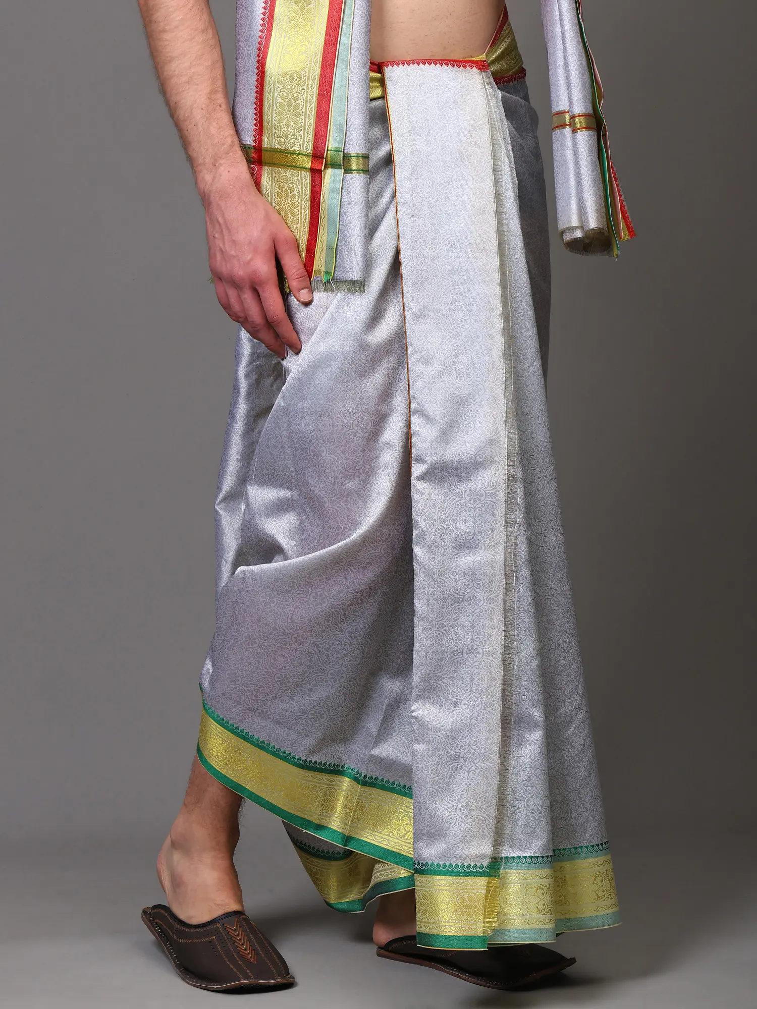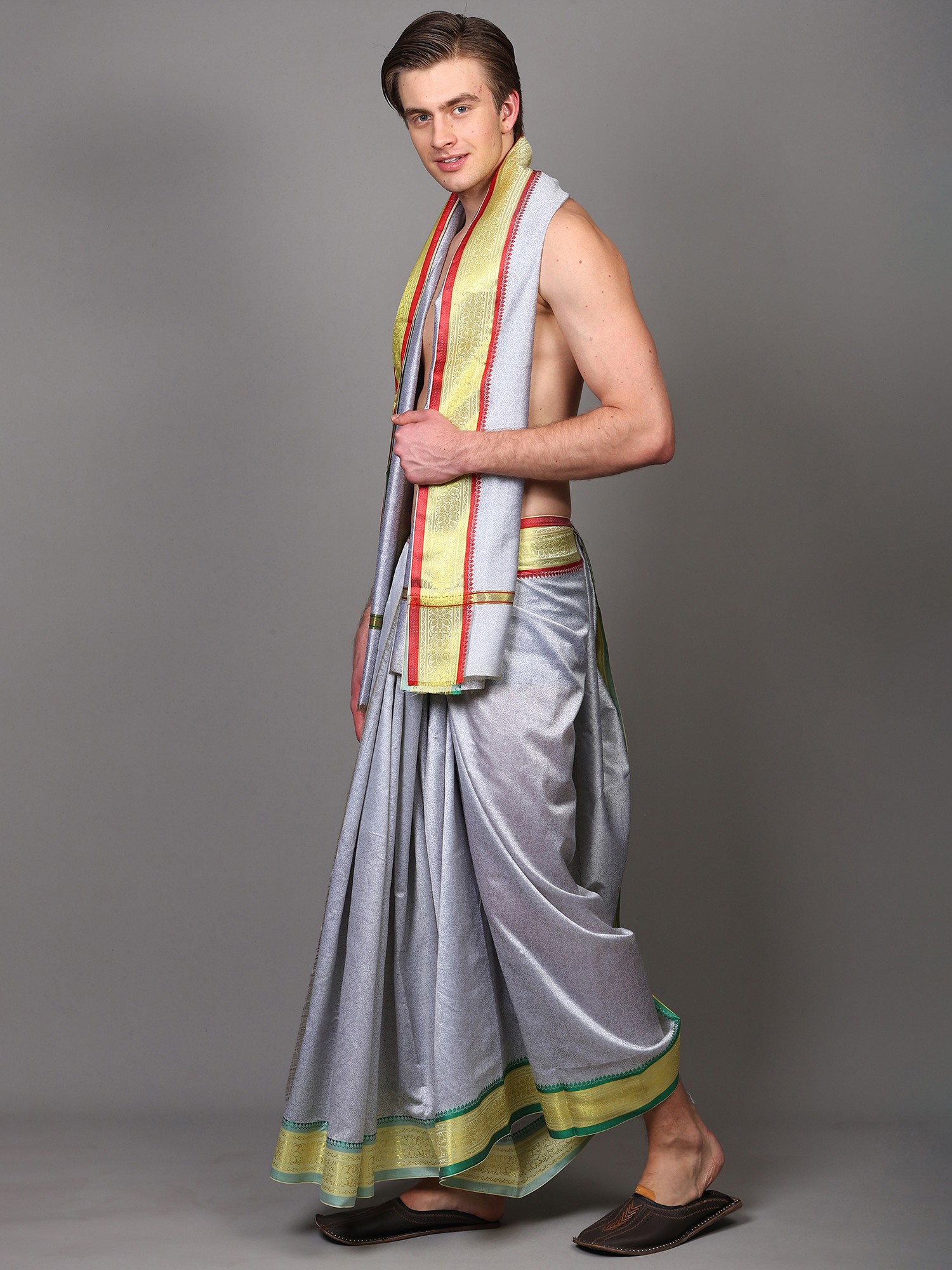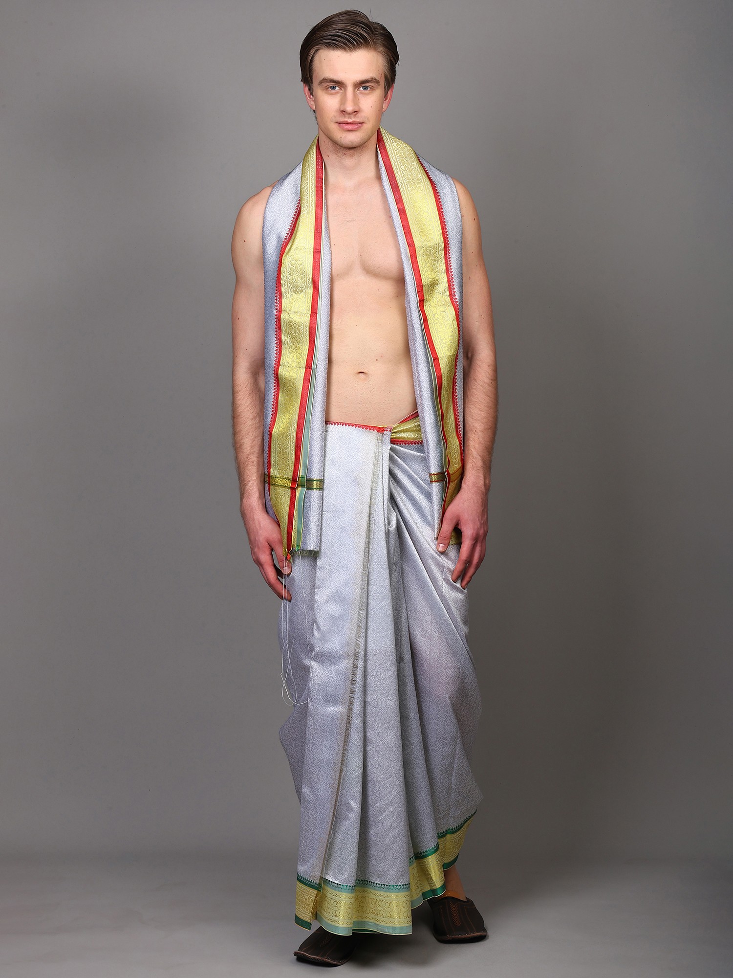 Ready to Wear Dhoti and Angavastram Set with Meenakari Woven Golden Border