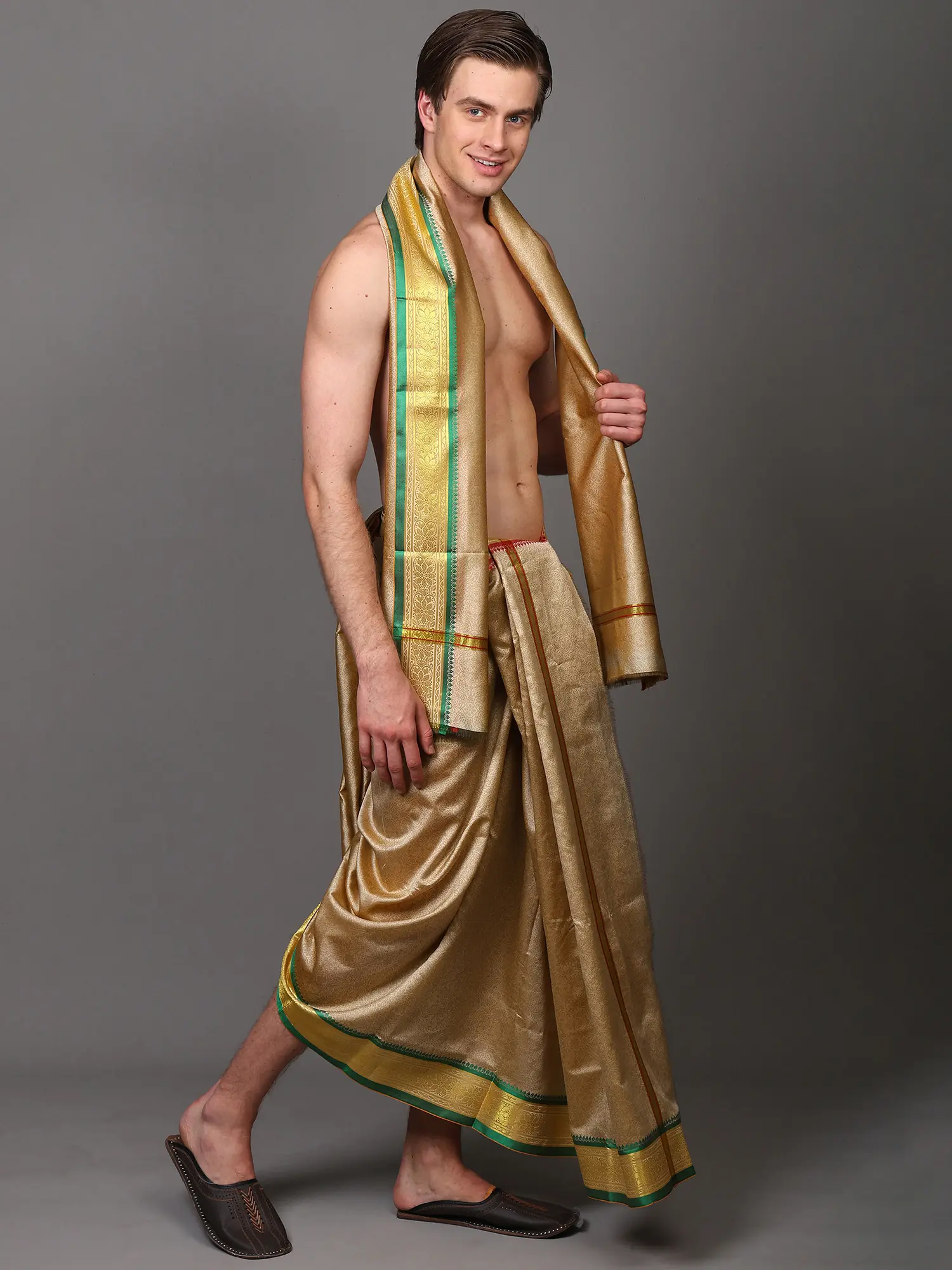 Dhoti and Angavastram set with Golden Woven Paisley on Border