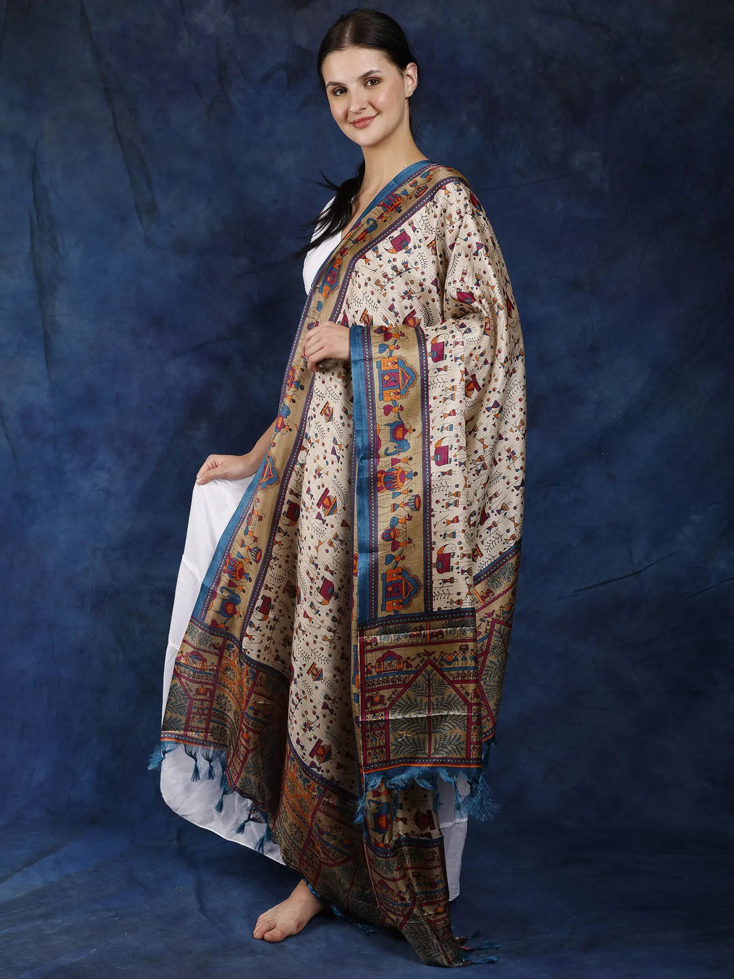 The love for Indian folk art is such that designers and fashionistas take elements of these ancient art forms, experimenting with them to create unique and edgy style statements, this beige printed dupatta, crafted with soft art silk uses the traditional Warli motifs and adds new colors to the age-old art. Human and animal figures populate the dupatta, filled with vivid colors and embraced by a classic red border, creating an artistic statement accessory.