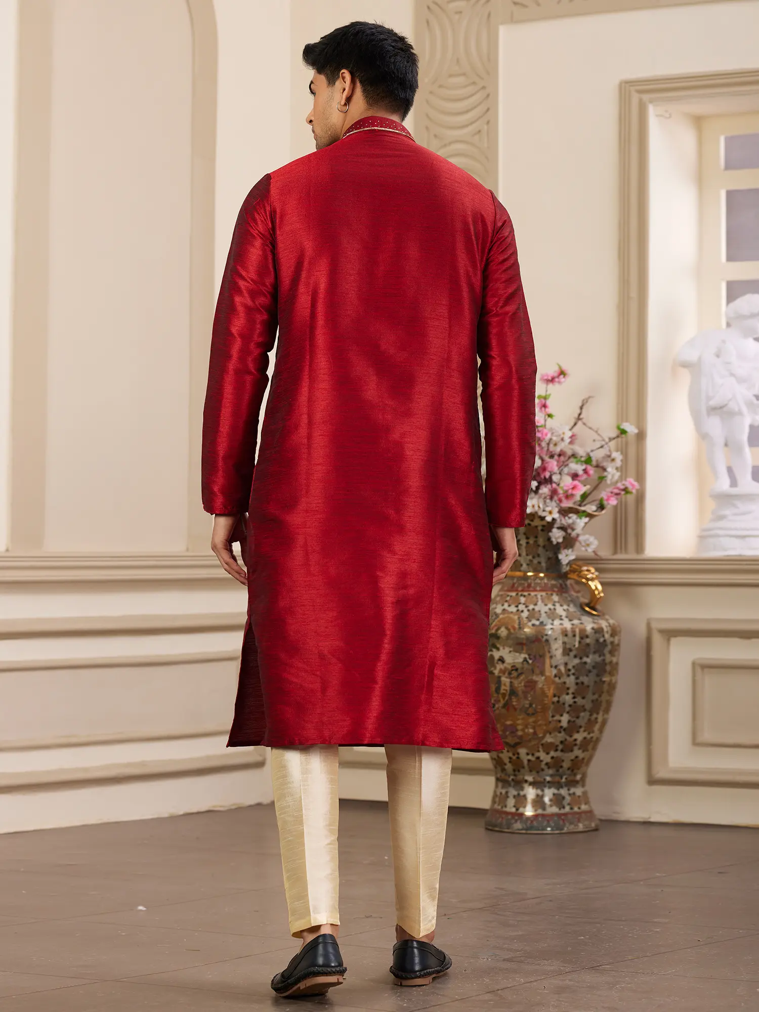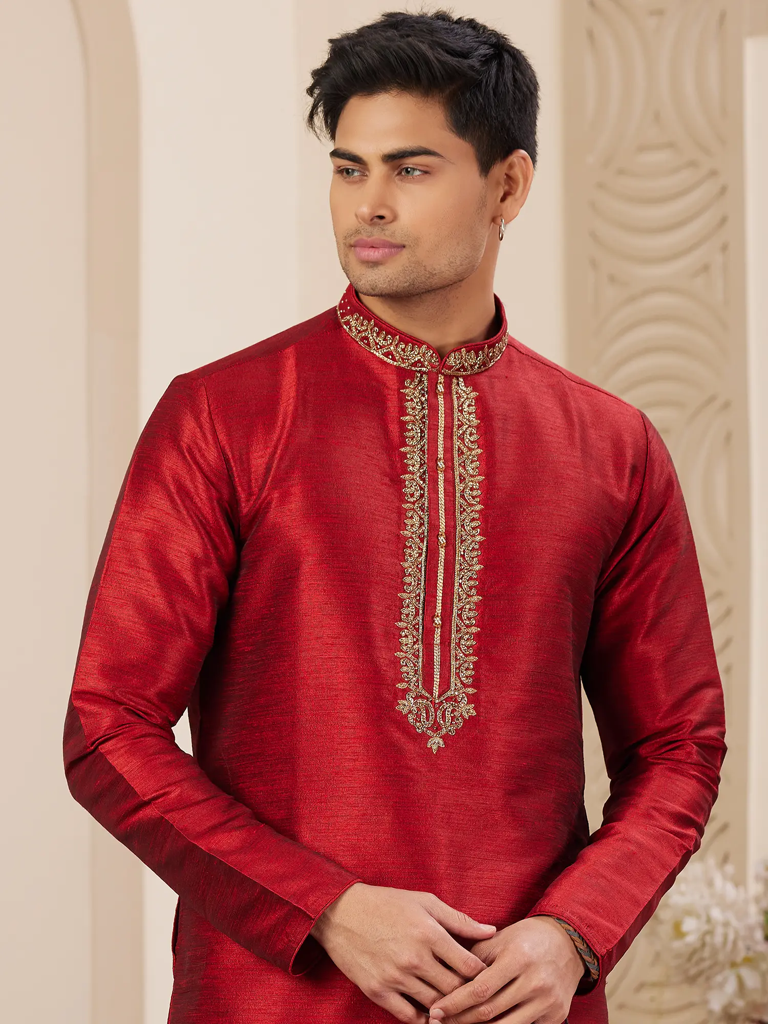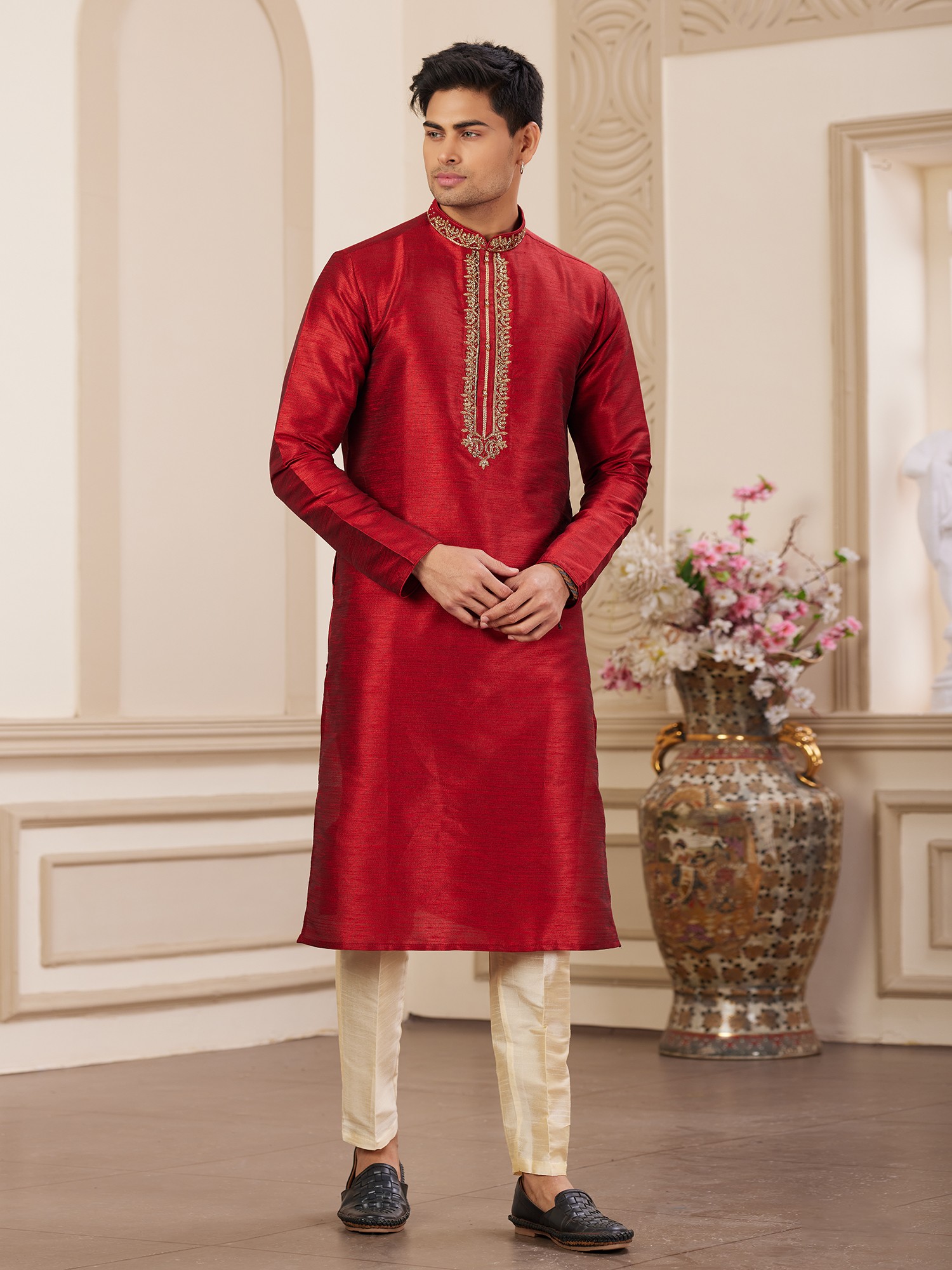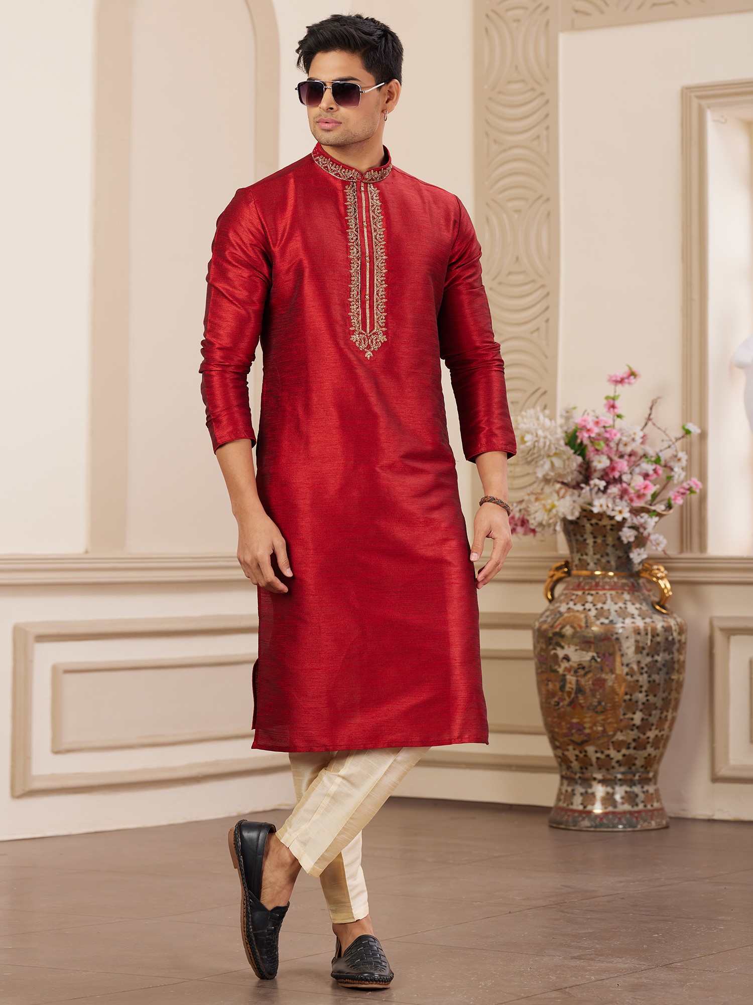 The vibrant red hue offers a bold yet sophisticated statement, while the finely detailed embroidery introduces a captivating contrast. The complementary pajama, designed for a relaxed yet polished fit, balances the richness of the kurta. This carefully curated set embodies a harmonious blend of classic design and contemporary appeal, ensuring you stand out for all the right reasons.