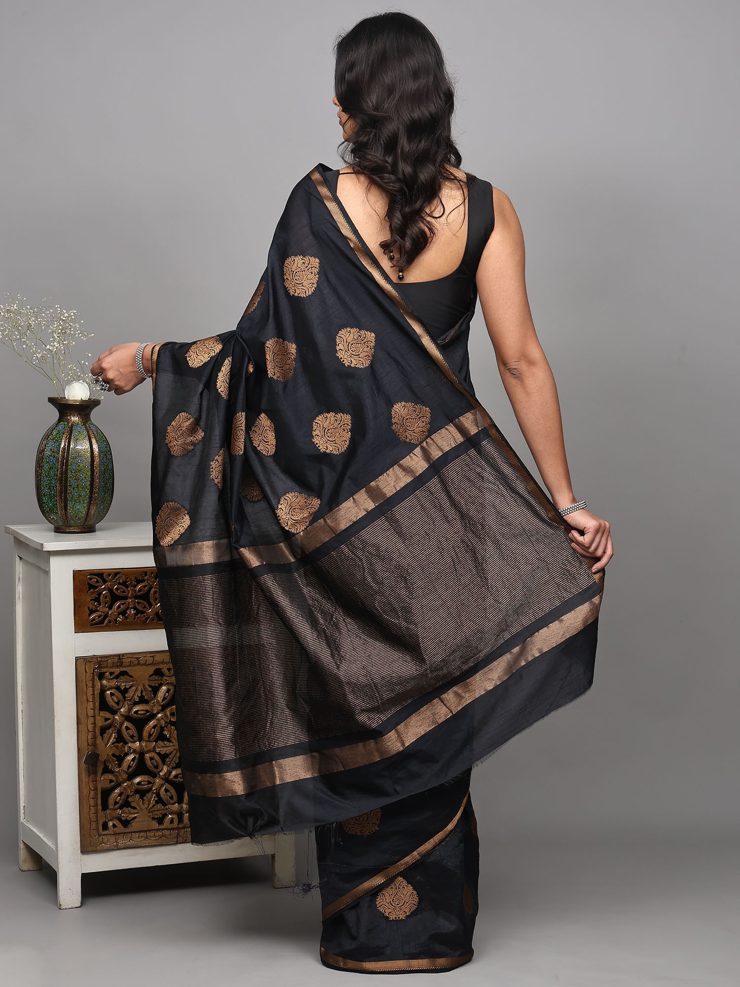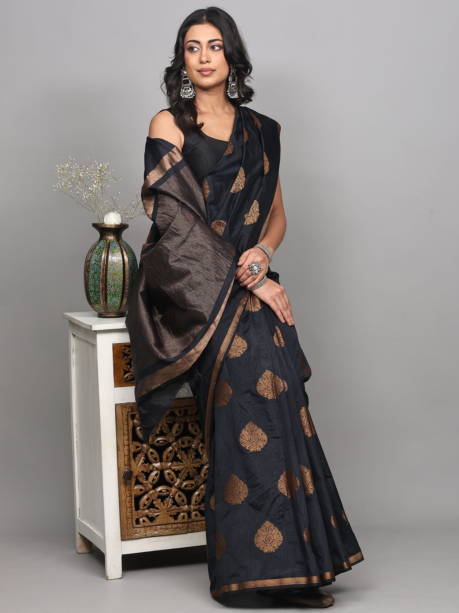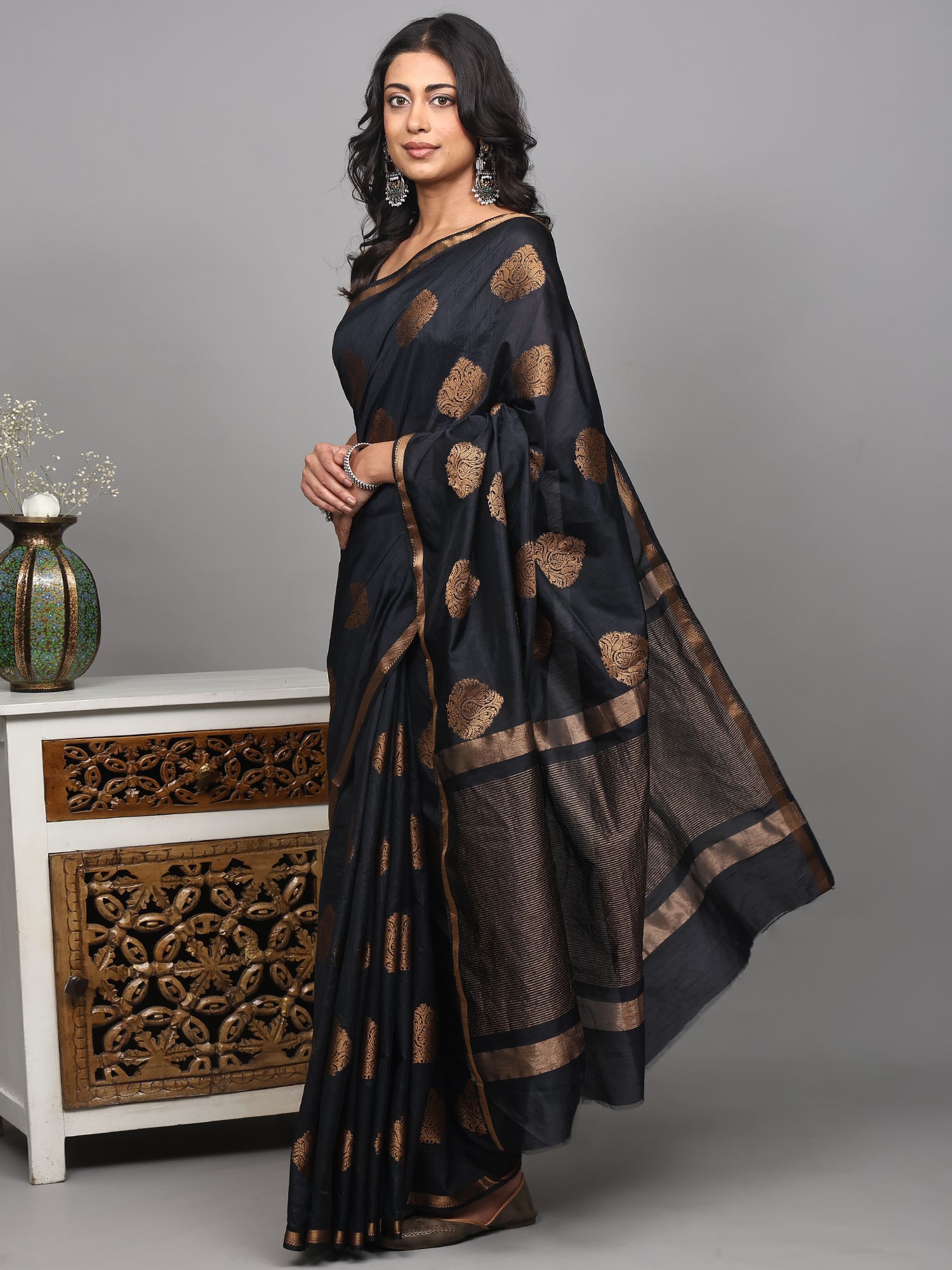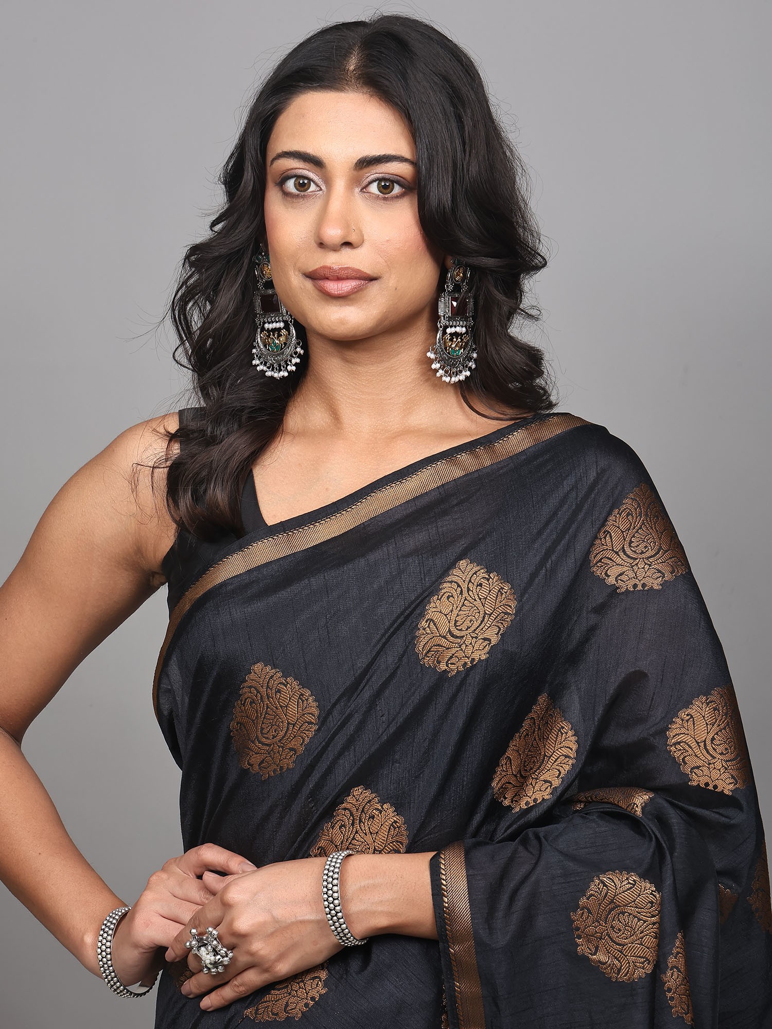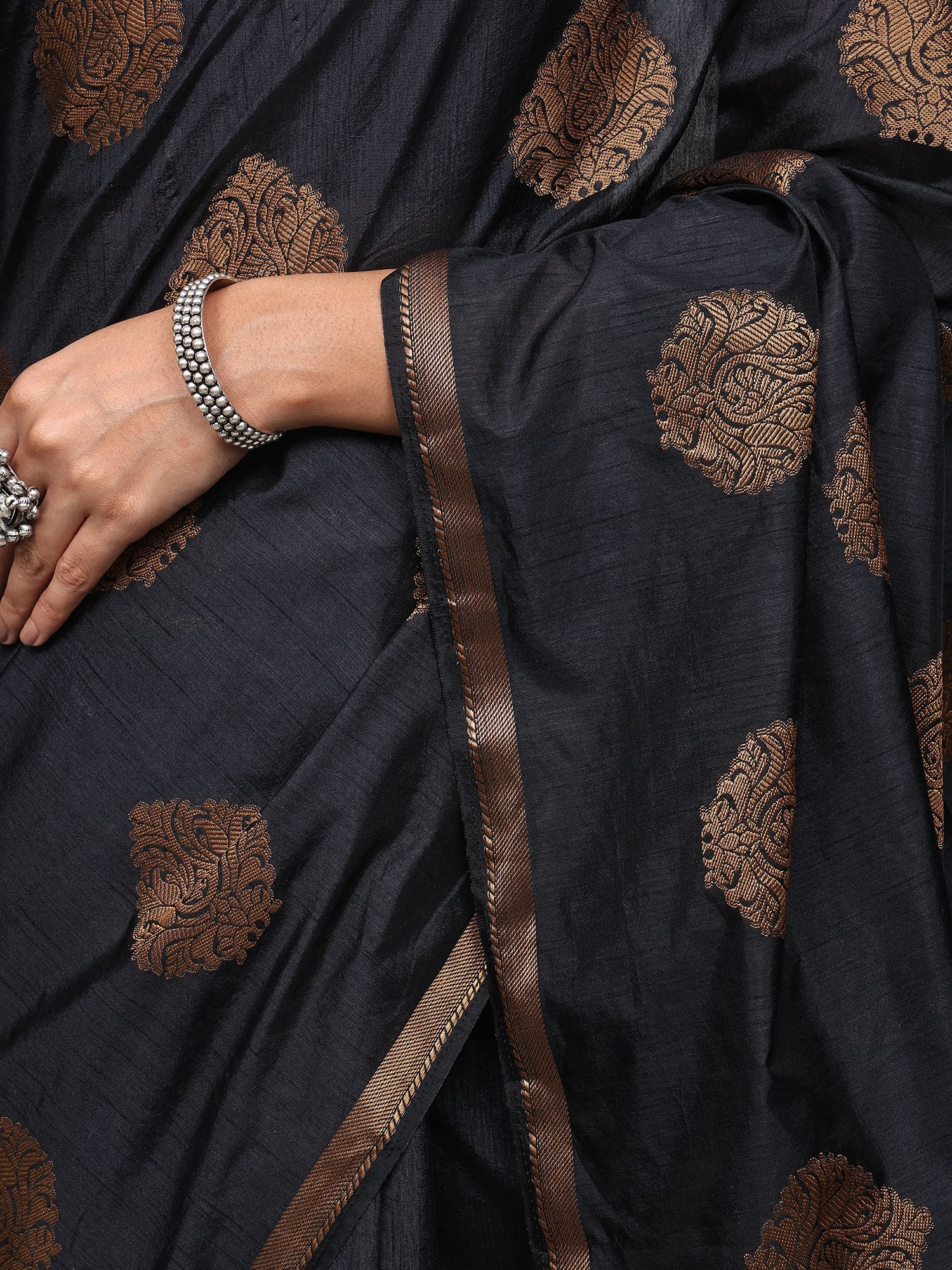 The lovely jet black color has a royal and feminine appeal, elevated by the traditional butas on the body and ethnic border.