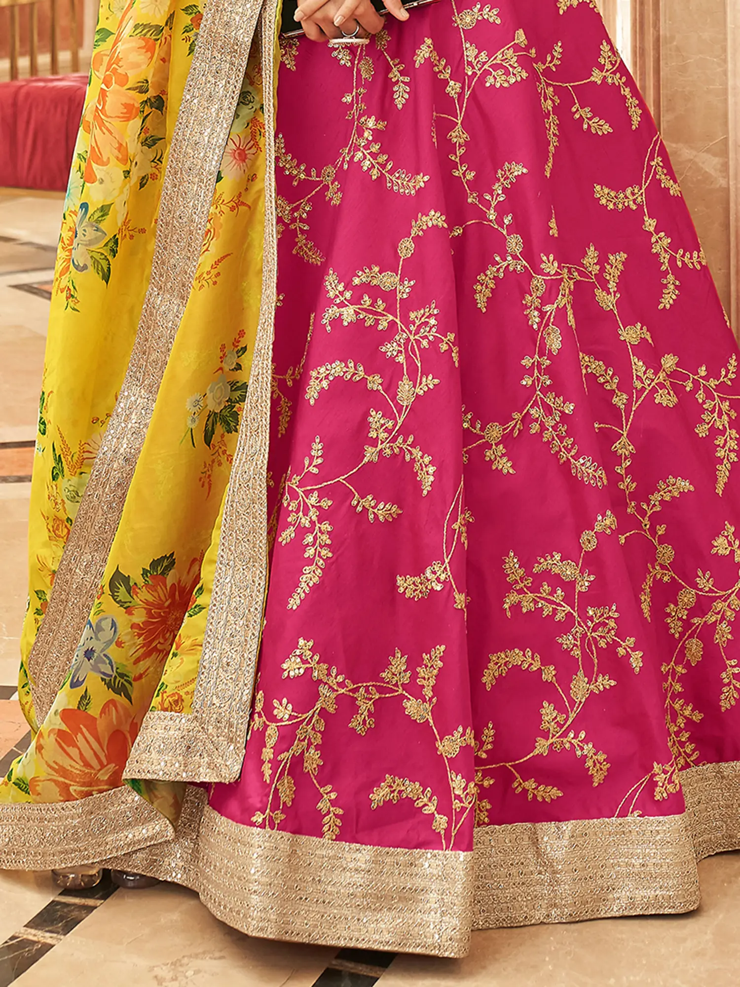 Art Silk Zari And Thread-Sequins Embroidery Work Wedding Wear Lehenga Choli With Floral Dupatta