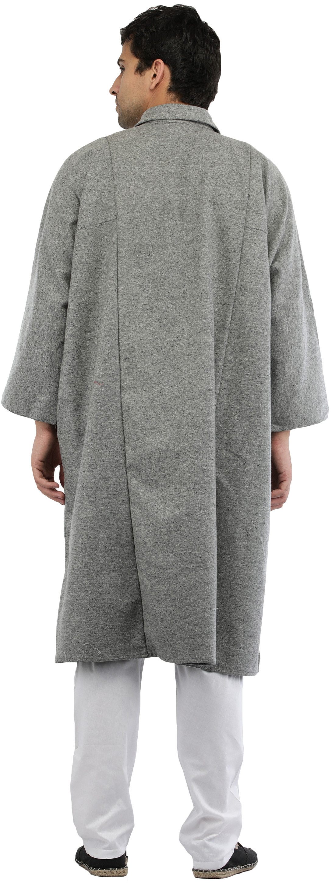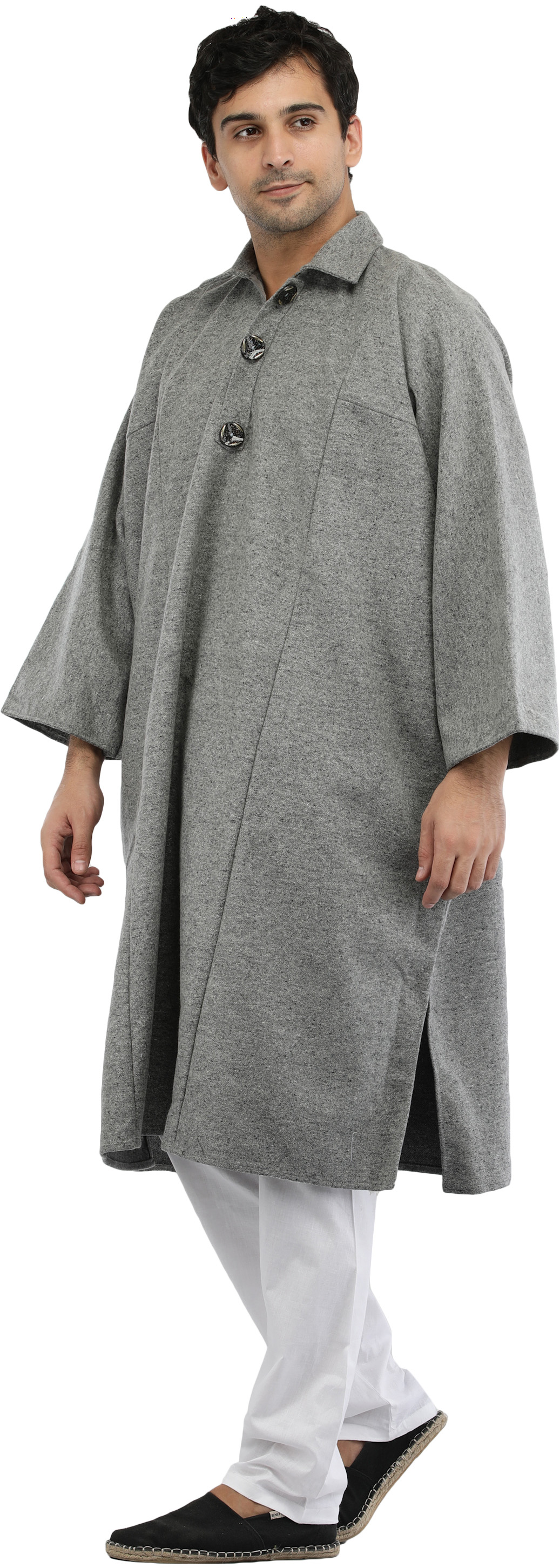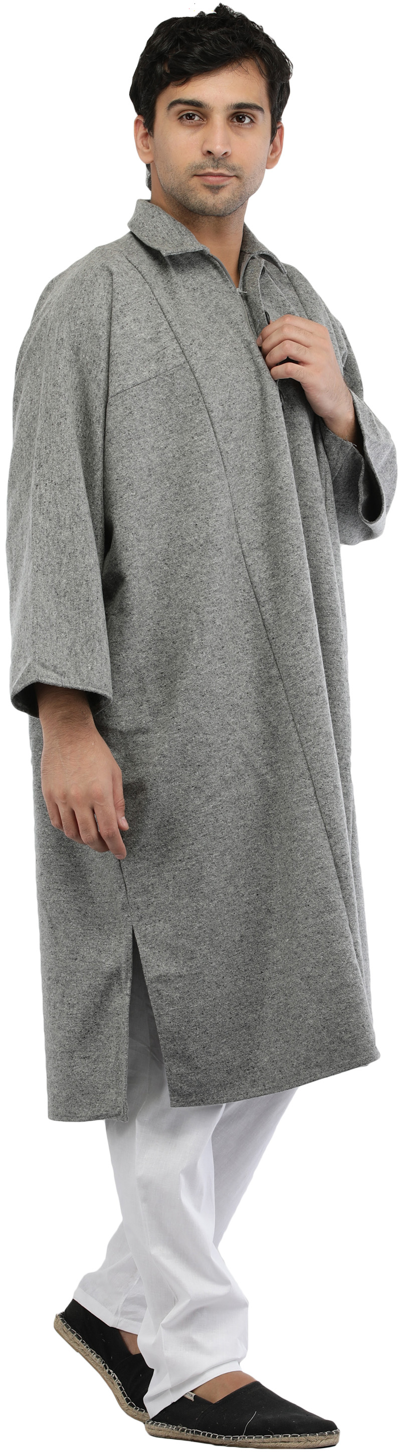 Ash-Gray Pure Wool Phiran from Kashmir with Front Zipper and Buttons