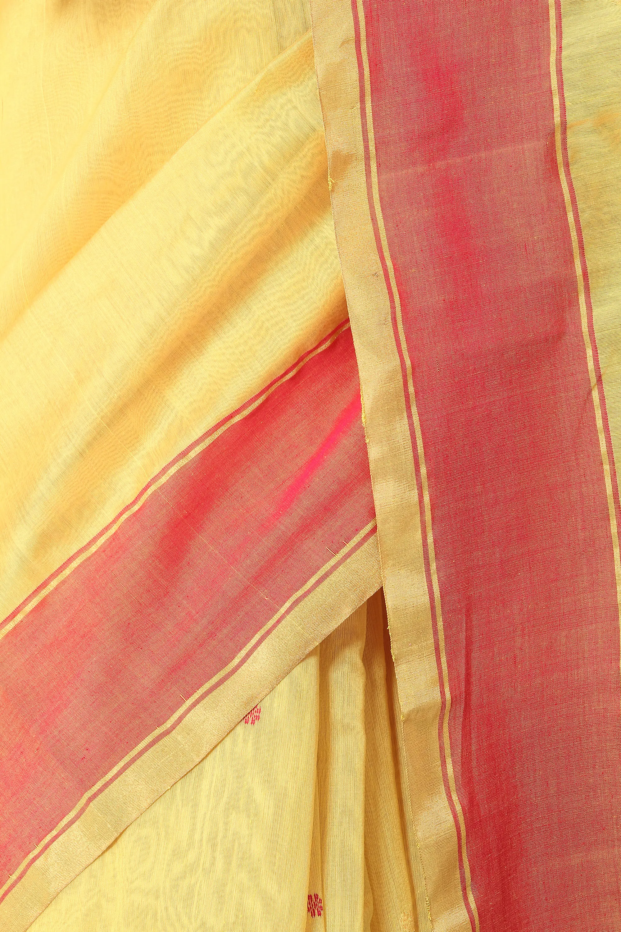 Nine yards of Chanderi is the modern-day woman's go-to saree. Comprising of silk warp on low-denier muslin, Chanderi sarees are known for a crisp, signature sheen and translucence. The palette of this saree is exclusively pastel, the dense creme yellow of the field complemented by the red and blue of the border. What makes this saree a distinct example of modern-day Chanderi is the infusion of woven booties across the filed and the pallu done using matching red thread.
