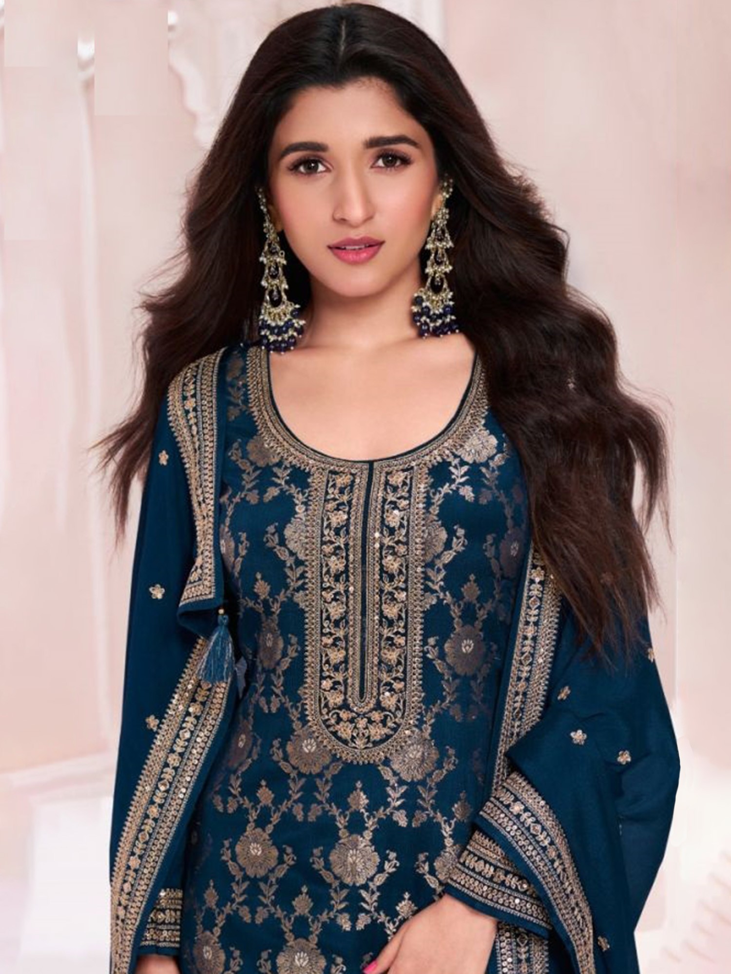 Floral Sequins Work Elegant Viscose Silk Straight Kurta Set With Matching Tassels Dupatta