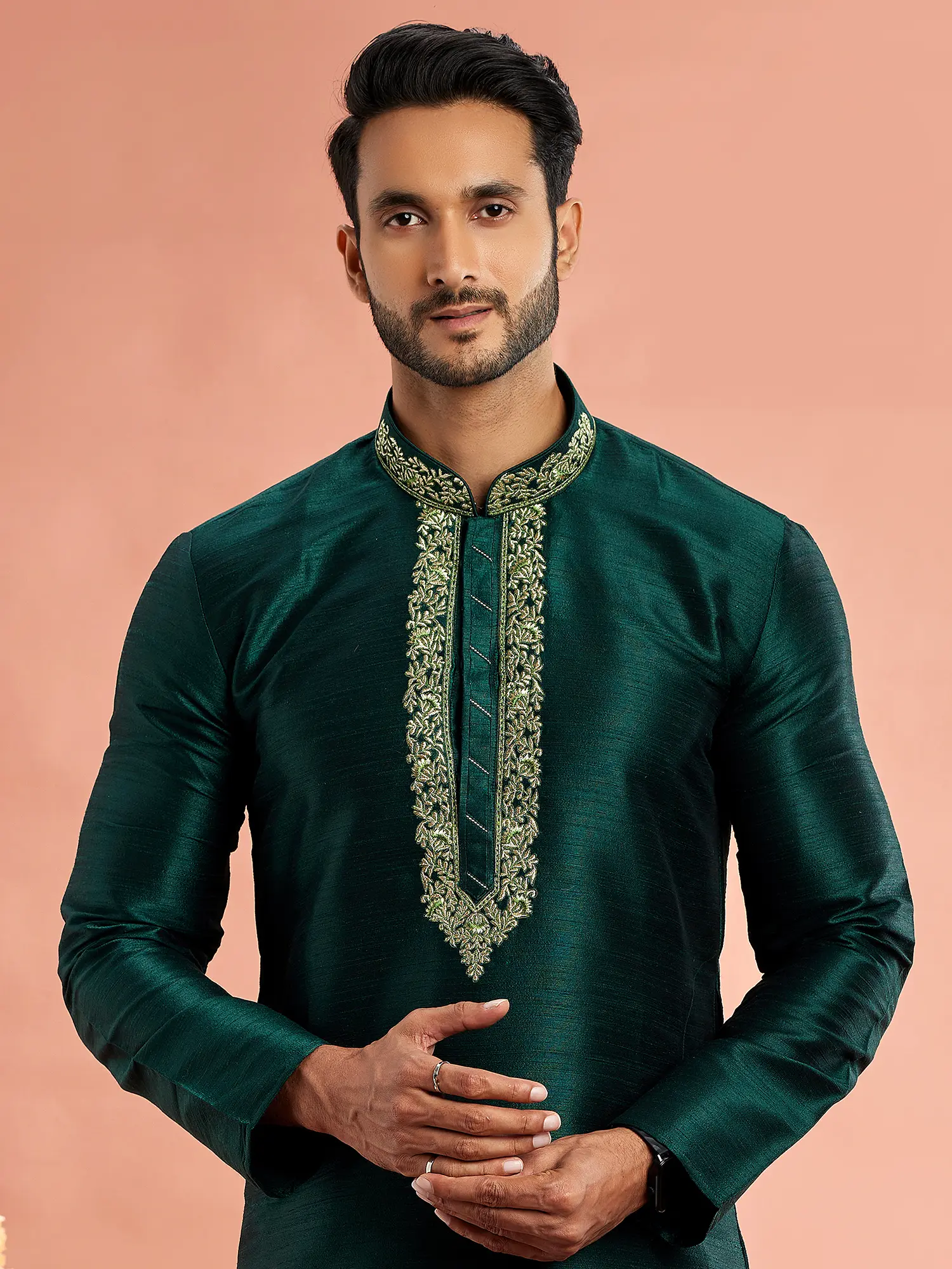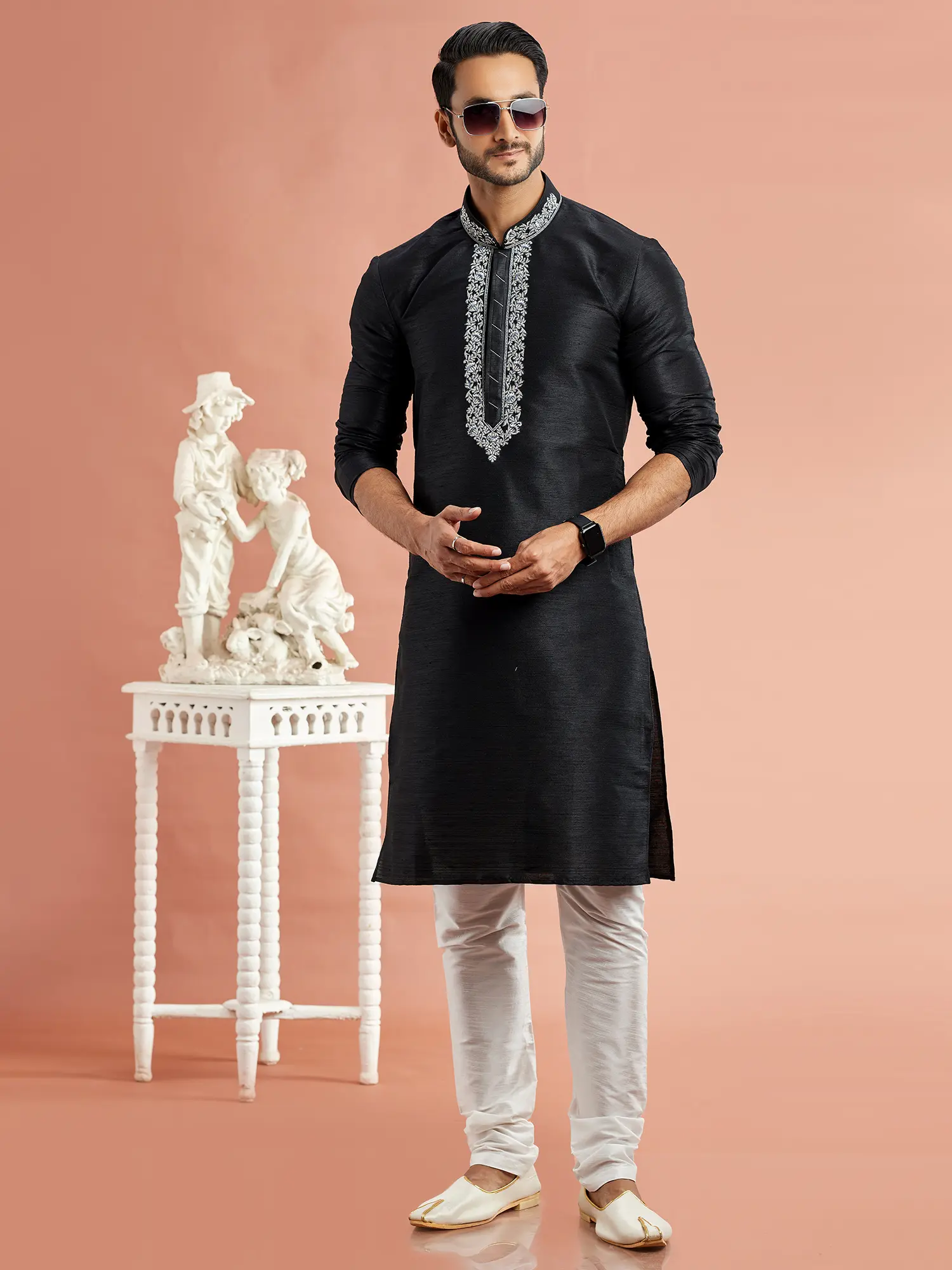 Banarasi Art Silk Embroidery Work Straight Kurta Mandarin Collar Kurta Pajama Set
