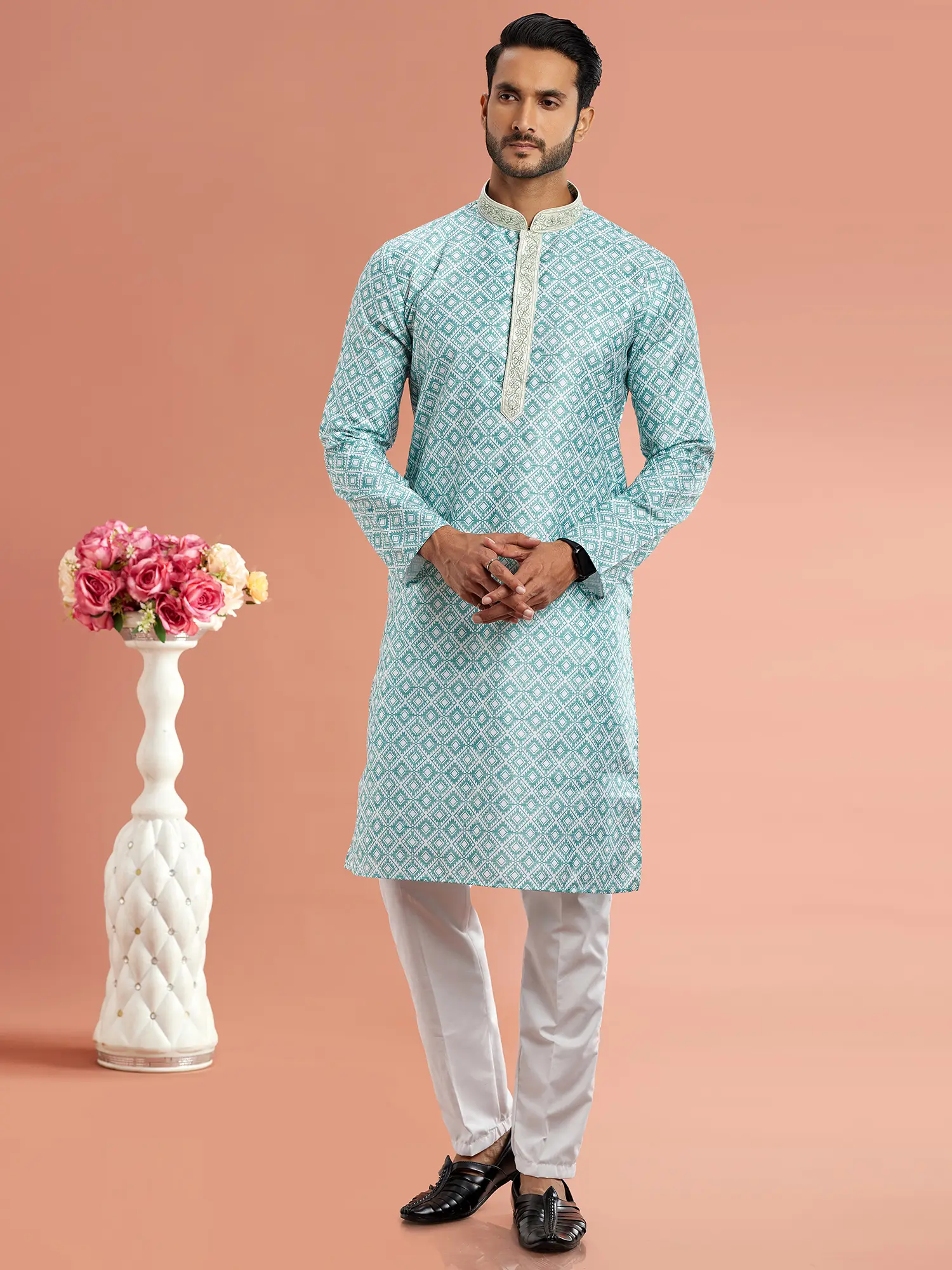 Discover a blend of traditional charm and contemporary design with this exquisite kurta pajama set. Crafted from premium quality cotton, this ensemble promises unparalleled comfort and breathability, making it an ideal choice for any occasion. The soothing sky-blue hue, adorned with a sophisticated digital print featuring a delicate geometric pattern, exudes a refined elegance that is sure to turn heads.