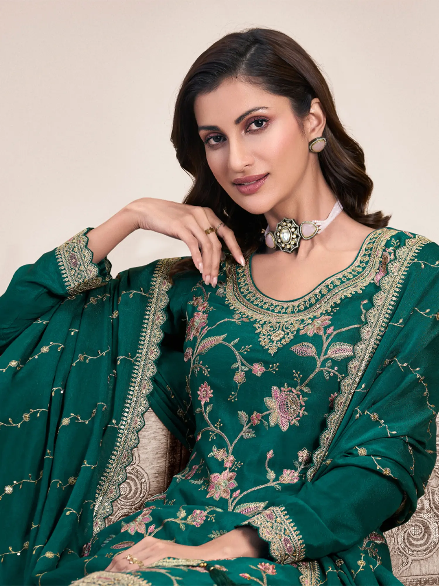 Sequins And Floral Embroidery Work On Neck Viscose Chanderi Salwar Suit With Attractive Dupatta