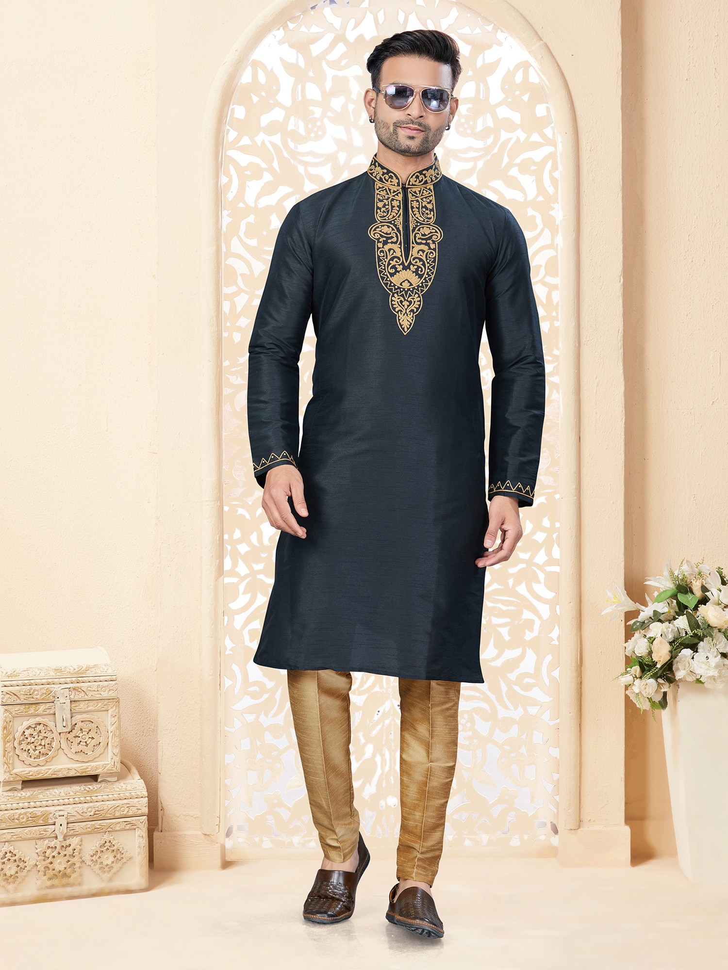 Elegant Banarasi Art Silk Embroidery Work Straight Full Sleeve Kurta Pajama Set